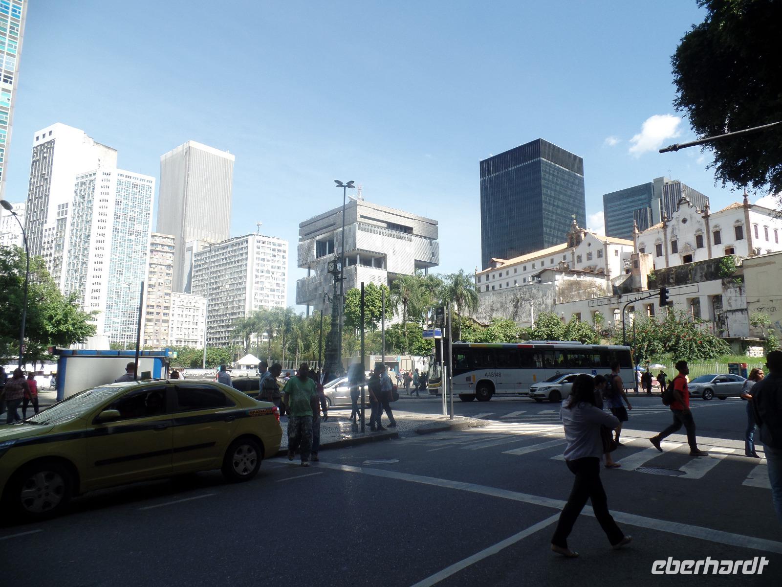 Anschließend bei einem geführten Spaziergang durch die Altstadt von Rio sehen wir koloniale Häuserfassaden, imposante öffentliche Gebäude und traditionelle Geschäfte. Wir unternahmen gemeinsam einen geführten Spaziergang durch die Altstadt. Unser Busfahrer fuhr uns ins historische Zentrum, wo wir -wie gesagt- viele koloniale Häuserfassaden, imposante öffentliche Gebäude und traditionelle Geschäfte sahen. Die Stadt war voll mit Leuten, die hin und her gingen. Was für eine lebendige Stadt! Und architektonisch waren viele verschiedene Stile im selben Bild zusammengefasst: Alte Häuser und Hochhäuser, sowie Kirchen, die in den gläsernen Fenstern des Hochhauses reflektiert wurden. Herrlich!