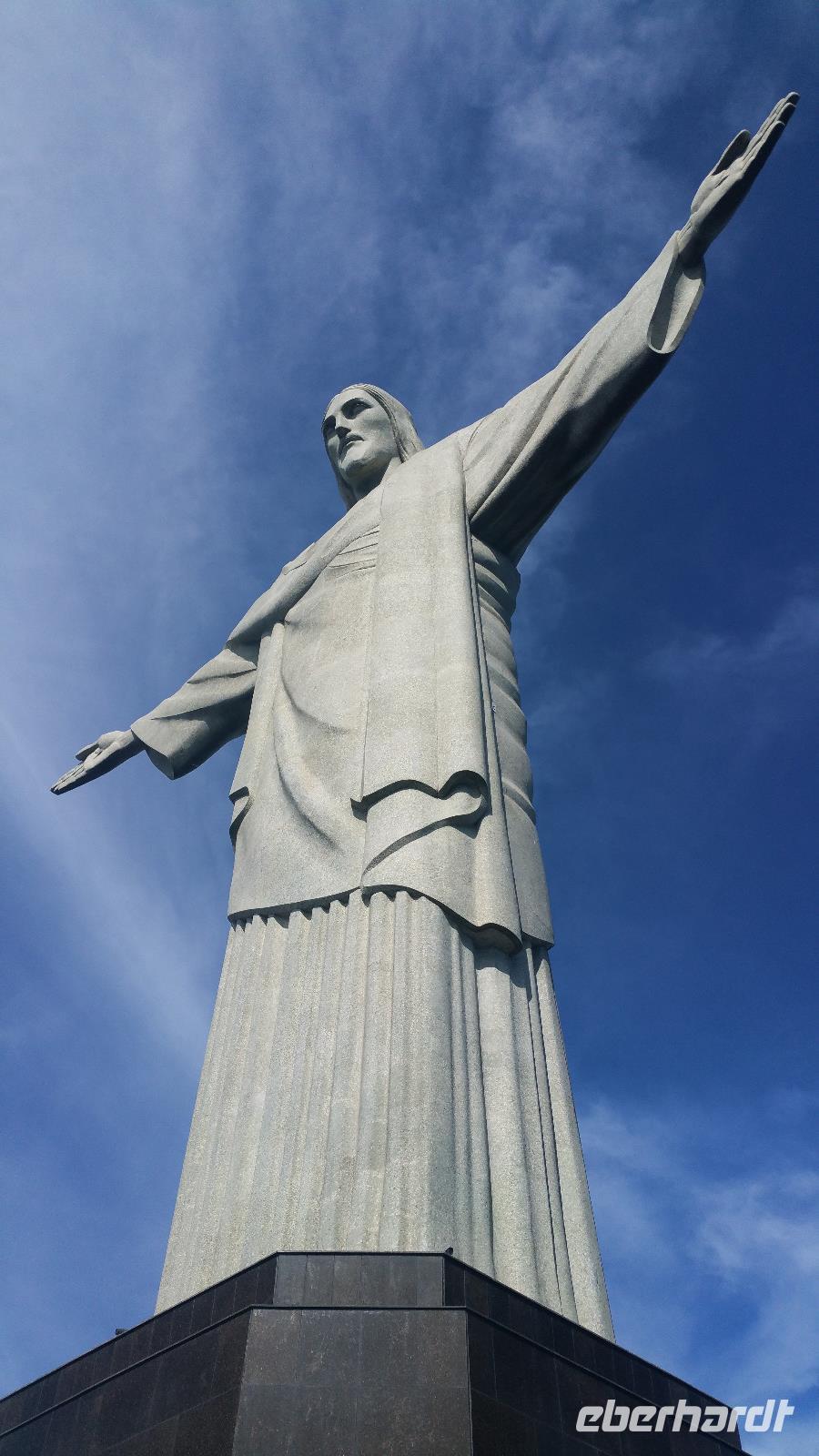 Heute Morgen ist wieder genau genau richtig da die Sonne scheint und wir fuhren in das Stadtviertel Cosme Velho, Ausgangspunkt für unsere Fahrt auf den Christus von Corcovado! Mit der Zahnradbahn „ersteigten" wir um 9:00 Uhr bequem die 3,7 Kilometer lange Strecke zum Gipfel des Berges. Dort thront in 710 m Höhe die 38 Meter mächtige Christus-Statue über die ganze Stadt. Von hier hatten wir einen spektakulären Rundum-Blick über Rio und die Bucht von Guanabara. Einfach herrlich. Ein atemberaubender Ausblick. Wir werden es nie vergessen und konnten verstehen, warum diese Christus Statue zu den sieben neuen Weltwundern gehört. Ein Foto von da oben zu machen erwies sich als gar nicht so einfach mit so vielen Touristen auf so engem Raum, aber wir taten unser Bestens und wir hatten sogar Glück. Von hier oben sahen wir ein bisschen den Zuckerhut, auf welchem wir gestern waren und hatten einen Überblick über die 7-Millionen-Einwohner der Stadt. Wieder unten angekommen, besuchten wir auch Ipanema Strand. Heute nutzten viele Gäste die Freizeit, um Postkarten und Souvenirs für ihre Lieben zu Hause zu kaufen.
