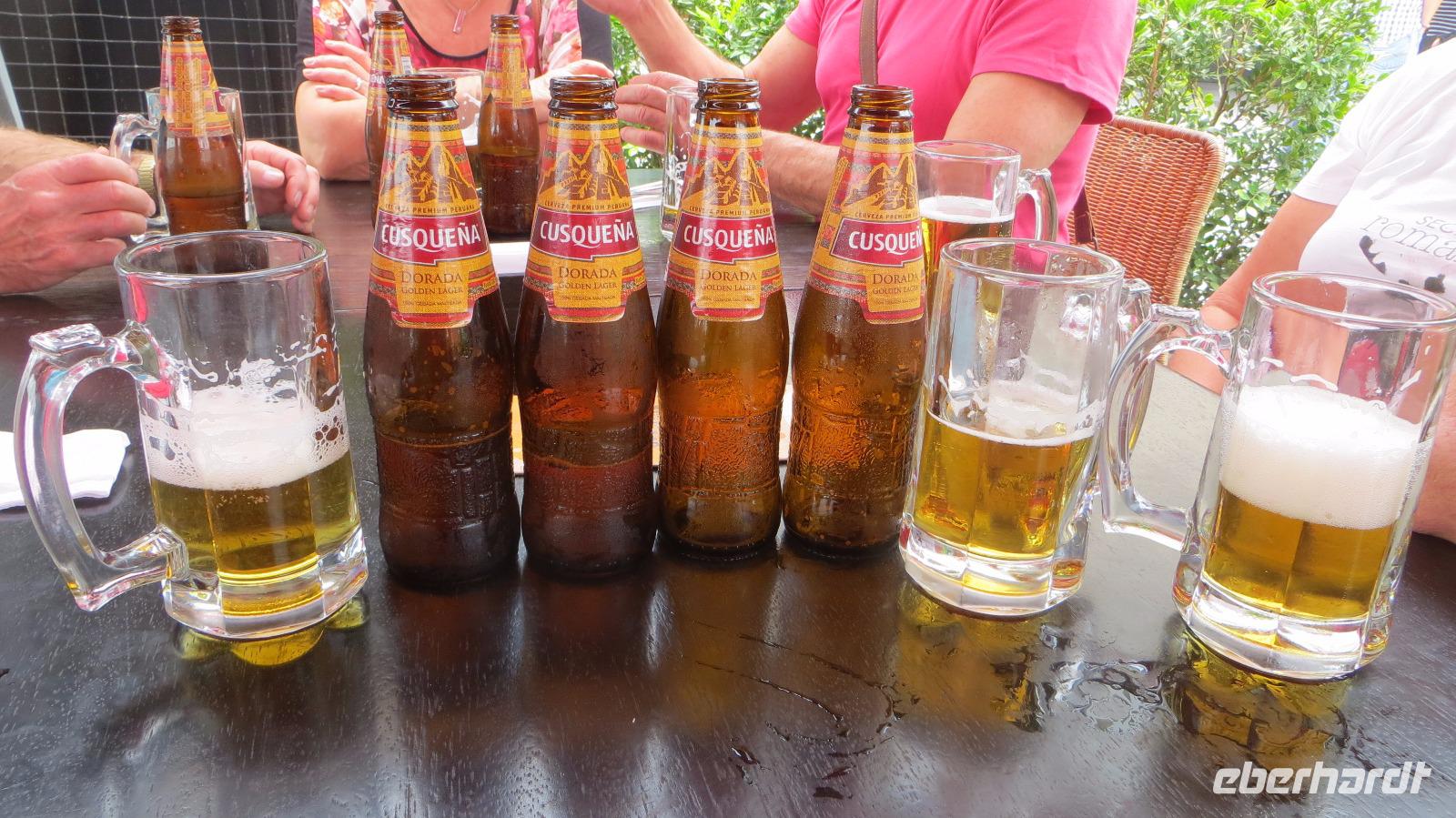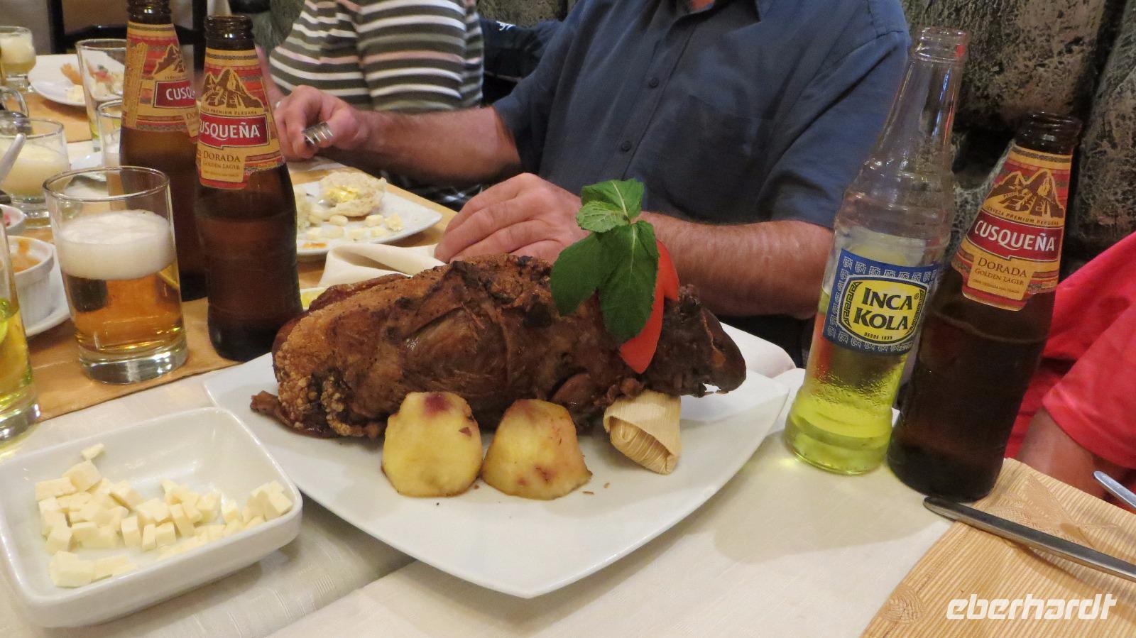 Zum Mittag gab es eine kulinarische Spezialität: Meerschweinchen, dazu ein leckeres Cusqueña Bier und/oder eine Inka Kola.