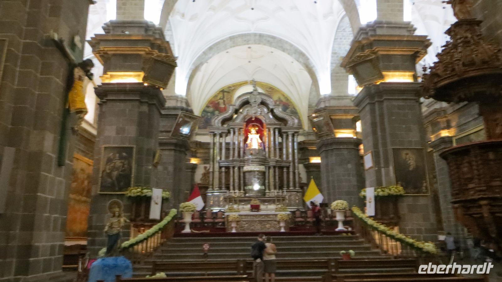 Dann spazierten wir durch die hübschen Straßen, vorbei an der National Bank, sahen die vielen traditionellen Holzbalkone, bevor wir den Hauptplatz, den Plaza de Armas erreichten, auf welchem die Kathedrale sich befindet. Dort gab es dann eine schöne Überraschung: eine Tanzgruppe aus Puno begrüßte uns in traditioneller Kleidung.