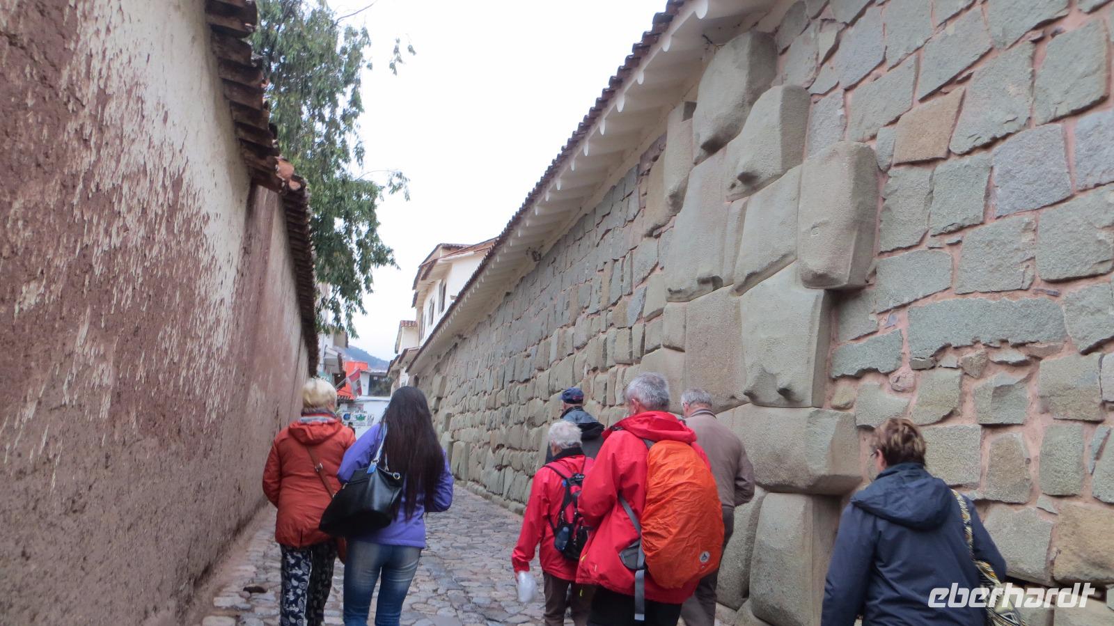 Frisch gestärkt marschierten wir entlang der alten Inkastadtmauer zum Qorikancha-Tempel. Auf dieser Inka-Anlage befinden sich 3 Tempel; der Regen,-Blitz,-und Sonnentempel. Kurios sind die riesigen Kalksteinblöcke, welche erstaunlicherweise ohne Zement halten.