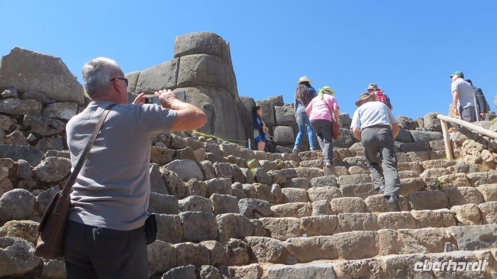 Die Sonne scheint und wir genießen unser Frühstück im Innenhof unseres Kolonial- Hotels, trinken einen Coka-Tee und fahren nach Sacsayhuaman, einer bedeutenden Sehenswürdigkeit aus der Inkazeit. Es liegt am Rande von Cuzco etwa 3km über dem Stadtzentrum. Während der Blütezeit umfasste Sacsayhuaman drei Steintürme und Gebäude mit Platz für 5000 Soldaten. Nach dem Niedergang des Inkareiches wurde der Komplex als Steinbruch genutzt. Heute sind nur noch 3 terrassenförmig angelegte Mauern erhalten, die in Zick-Zacklinien verlaufen.