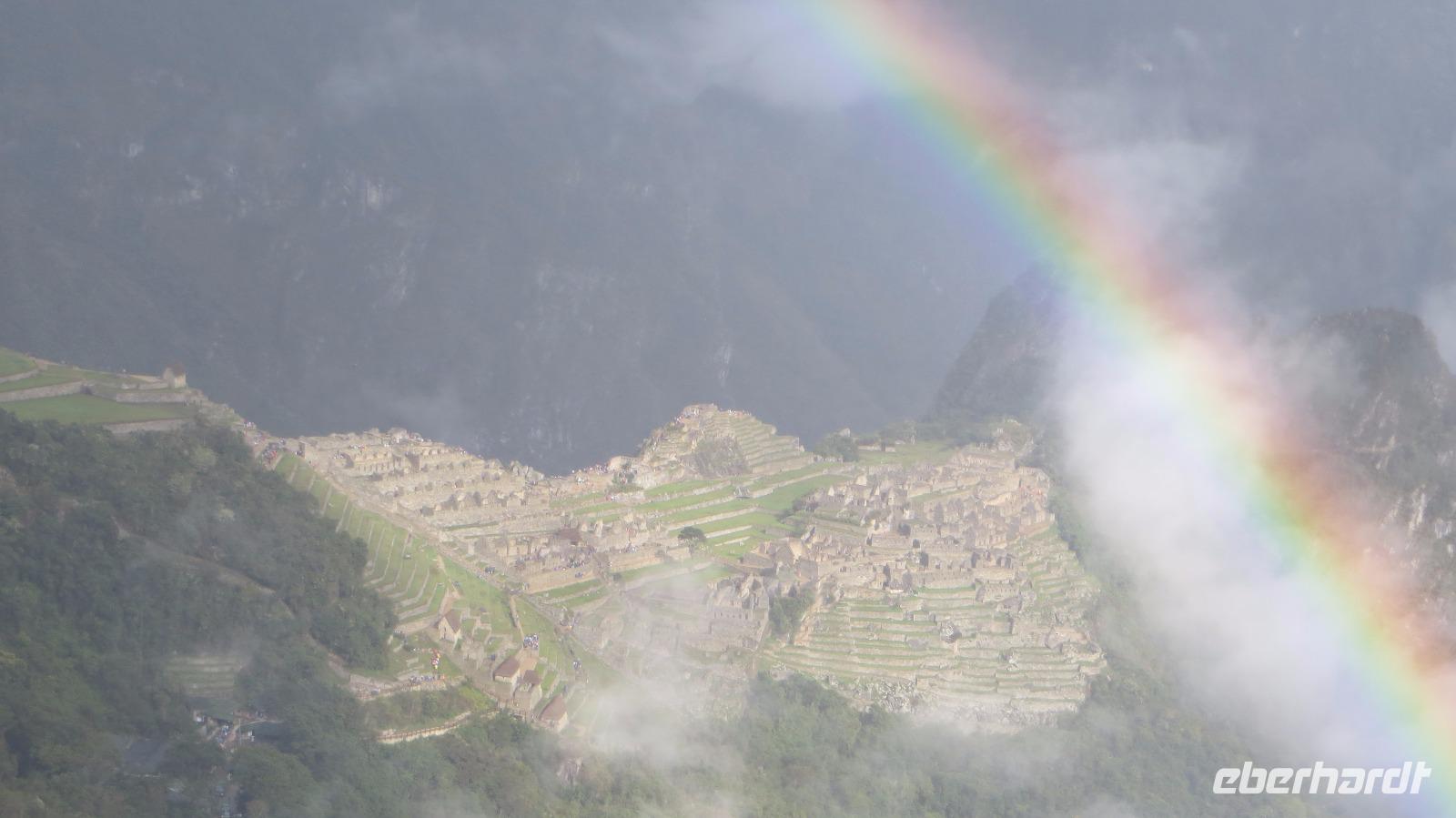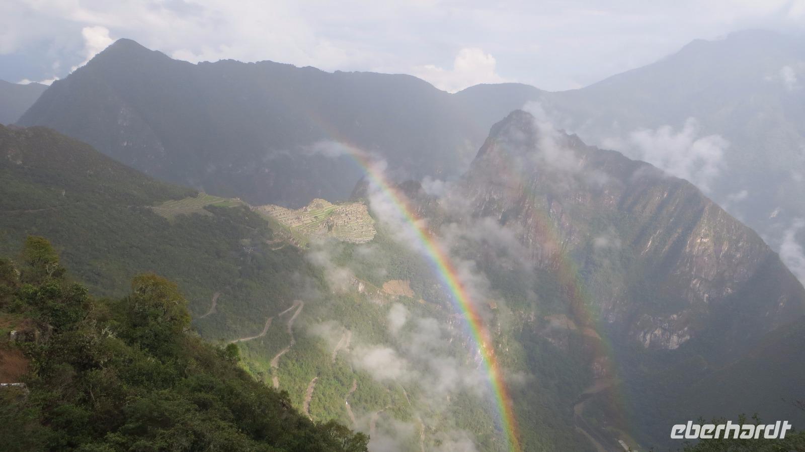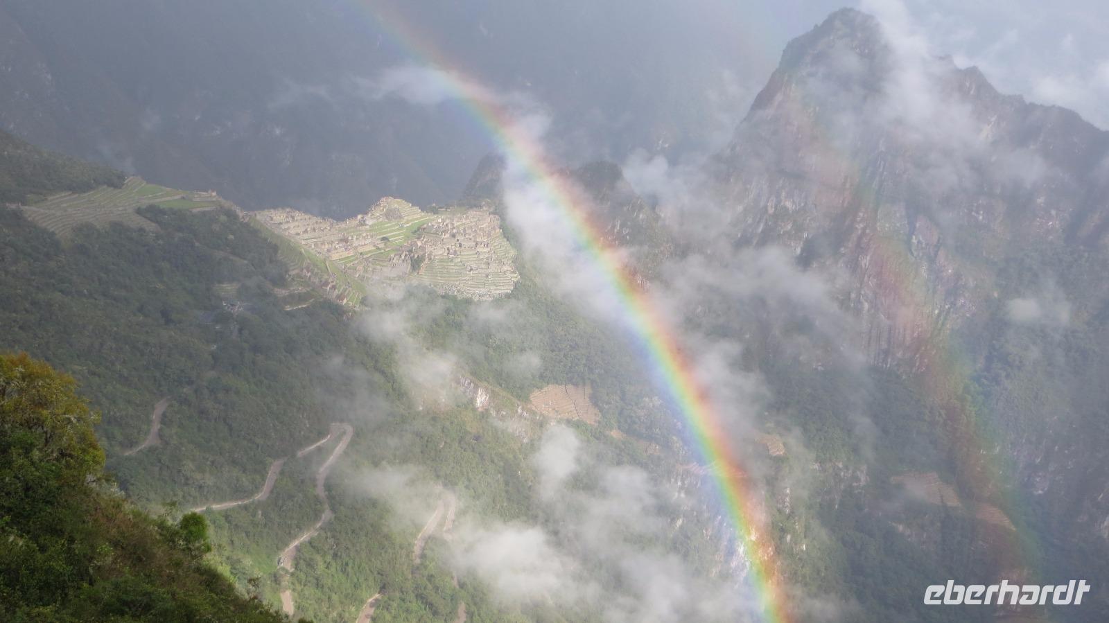 Wir sind ganz früh aufgestanden um die ersten Sonnenstrahlen auf Machu Picchu zu erleben und mit dem Bus in Richtung Sonnentor zu fahren. Über den Inkaweg gingen wir bergauf und mit etwas Geduld und Temperament haben wir unser Ziel erreicht. Es war ein wenig bewölkt und es regnete, trotzdem hatten wir ein angenehmes Klima. Auf dem Sonnentor angekommen, verschwanden wie bestellt die Wolken und ein schöner Regenbogen begrüßte uns.