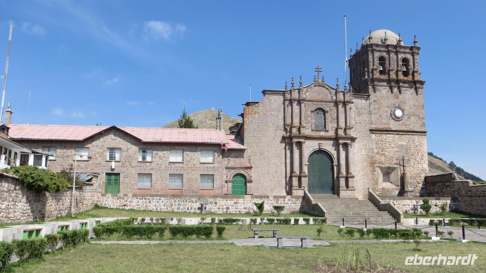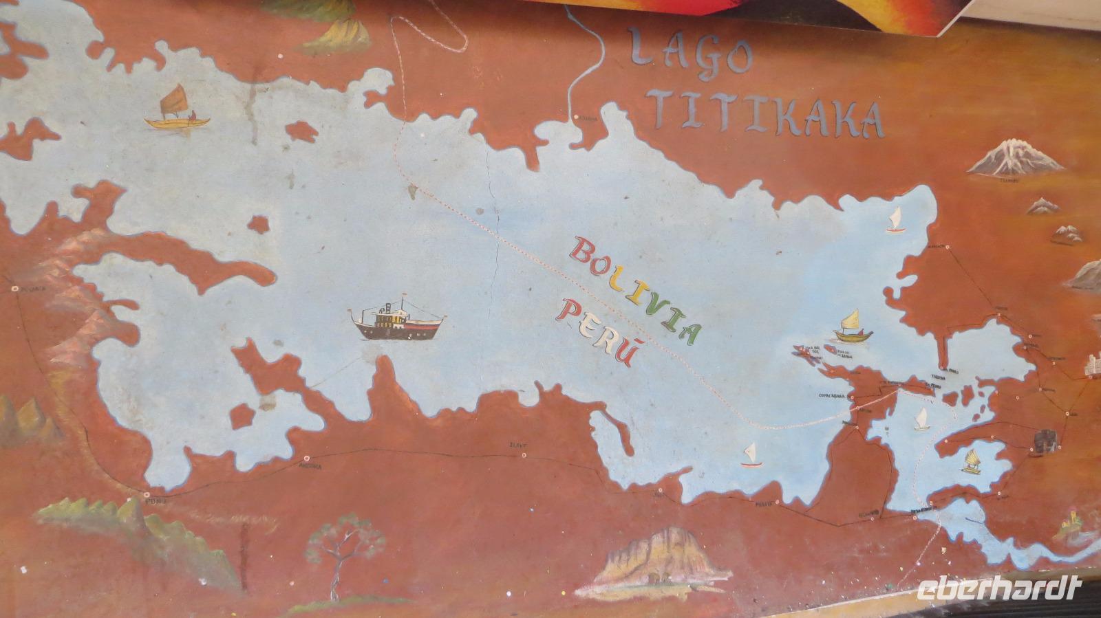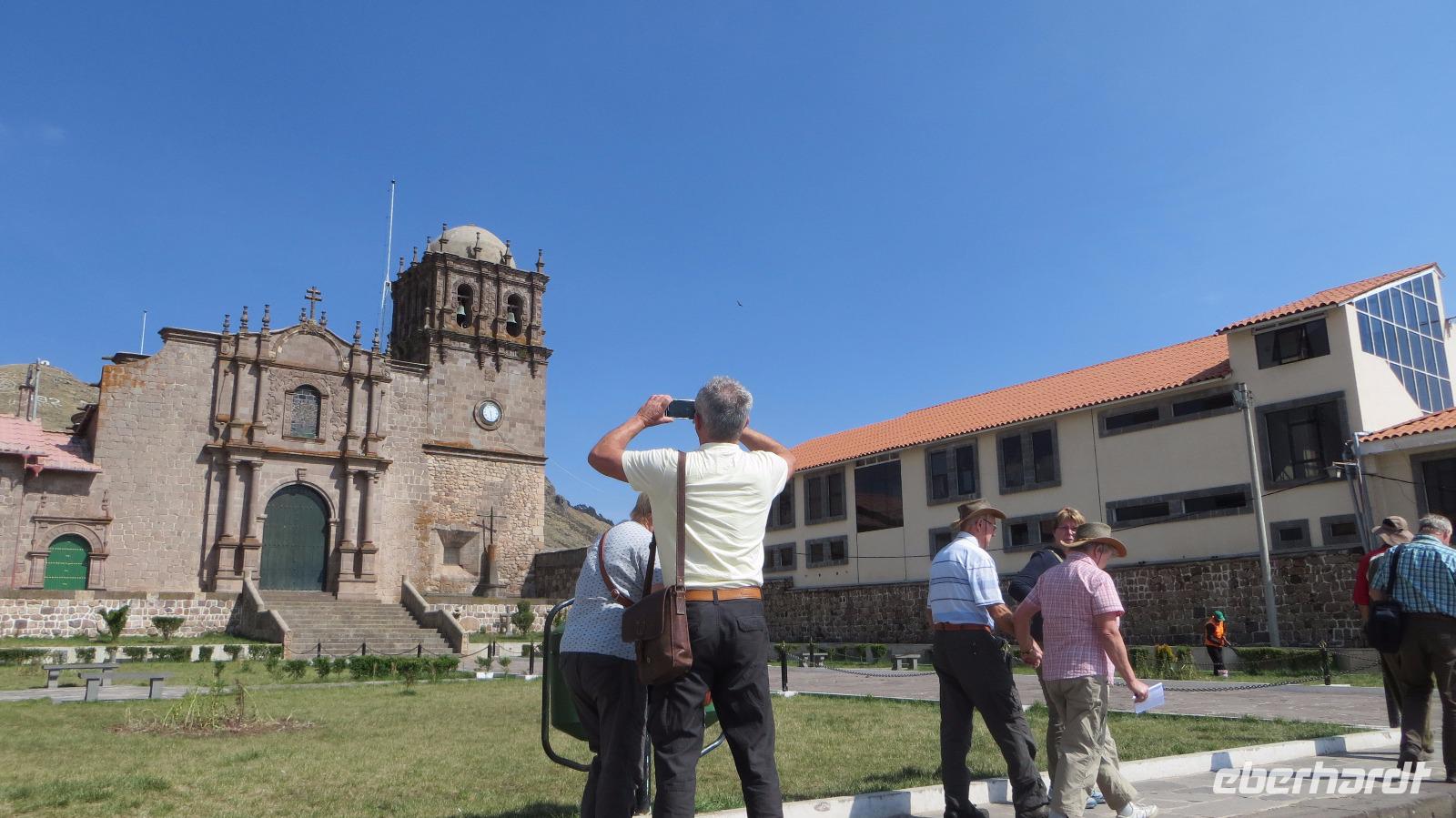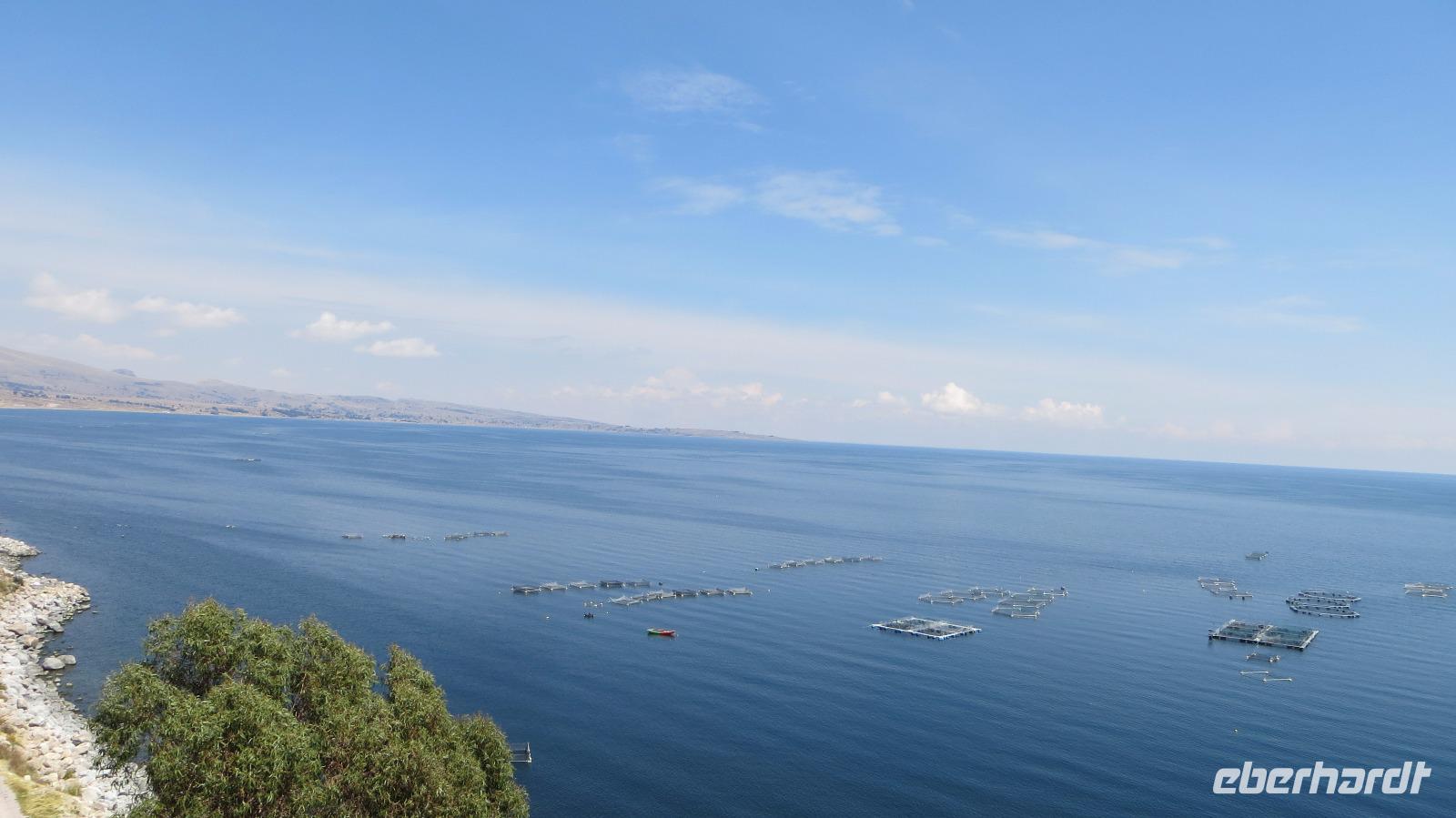 Der Tag begann mit strahlendem Sonnenschein und während des Frühstücks konnten wir jede Menge Meerschweinchen am Ufer des Titicacasees beobachten. Heute werden wir Peru verlassen und uns in Bolivien umschauen. Zuvor machen wir einen Stopp in der Stadt Juli um auch hier wieder den Plaza de Armas und die Kirche zu besuchen, von einem Aussichtspunkt oberhalb des Titicacasees konnten wir Forellenzüchter bei Ihrer Arbeit beobachten. Der See ist 165km lang und 65km breit.