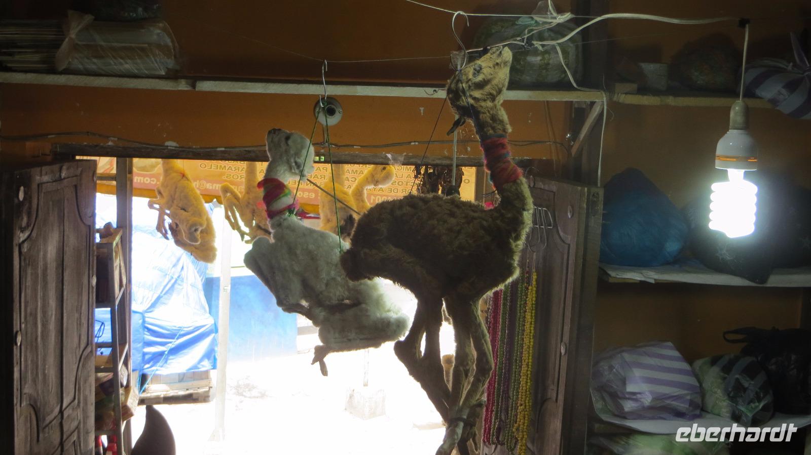 Kurz machten wir unsere Augen zu, zählten 10, 9,8.......3, 2, 1 und waren plötzlich in La Paz!! Eine richtig große Stadt gelegen in einem Canyon und in einer Höhe zwischen 3100 und 4100 Metern. Bei einem Besuch des Hexenmarktes lernten wir wieder verschiedene Rituale kennen und entdeckten Glücks-und Wunschelemente