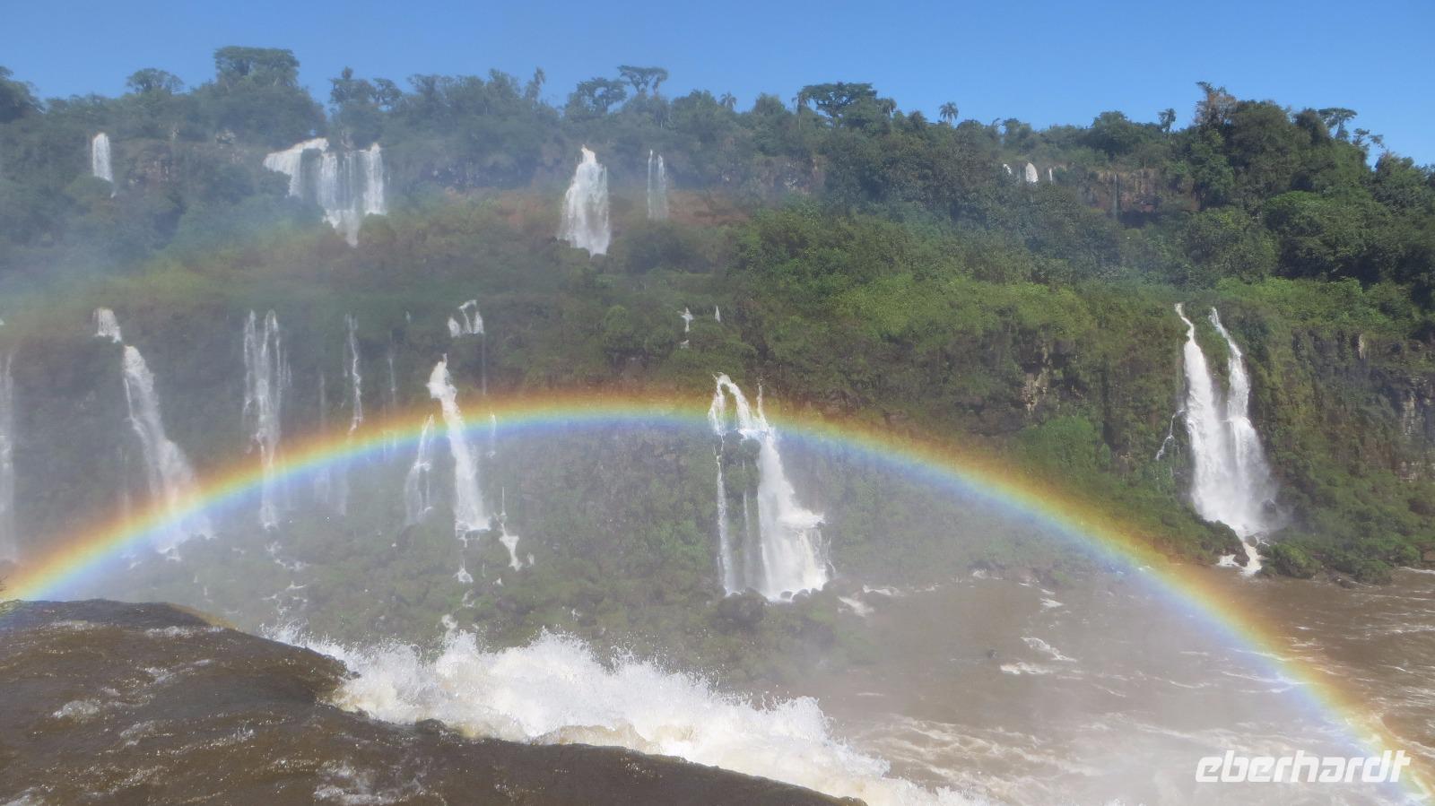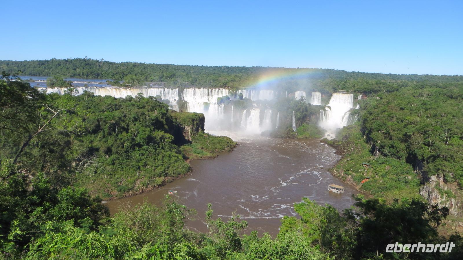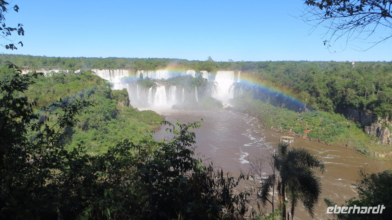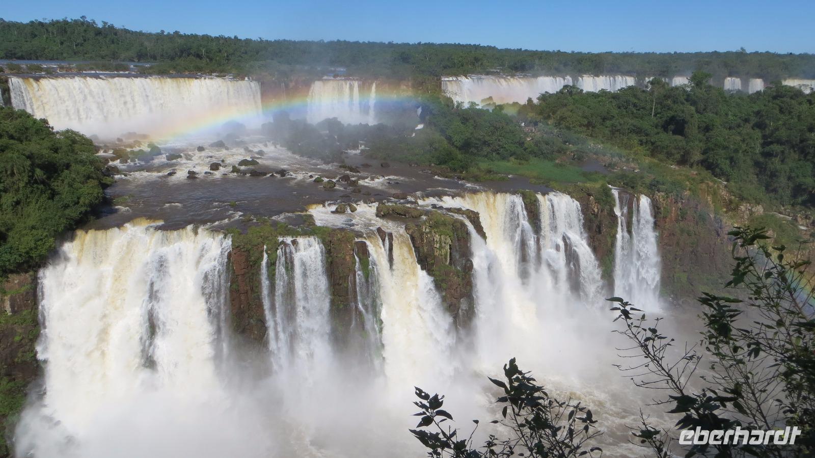 Nach unserem fruchtigen Frühstück fuhren wir zur brasilianischen Seite des Nationalparks Iguazu Wasserfälle und dem letzten Land auf unserer Reise durch Südamerika. Auf einer angenehmen Route durch den Wald neben dem Fluss bestaunten wir diese gigantischen Wasserfälle, die durch das herrliche Wetter einen Regenbogen nach dem anderen zauberten. Die Fälle haben Namen wie „ Le Trois Mosqueteirs", „La Gran Garganta" oder La Garganta del Diablo".