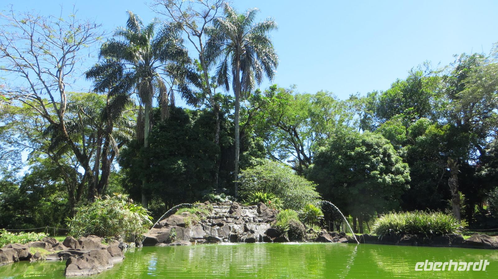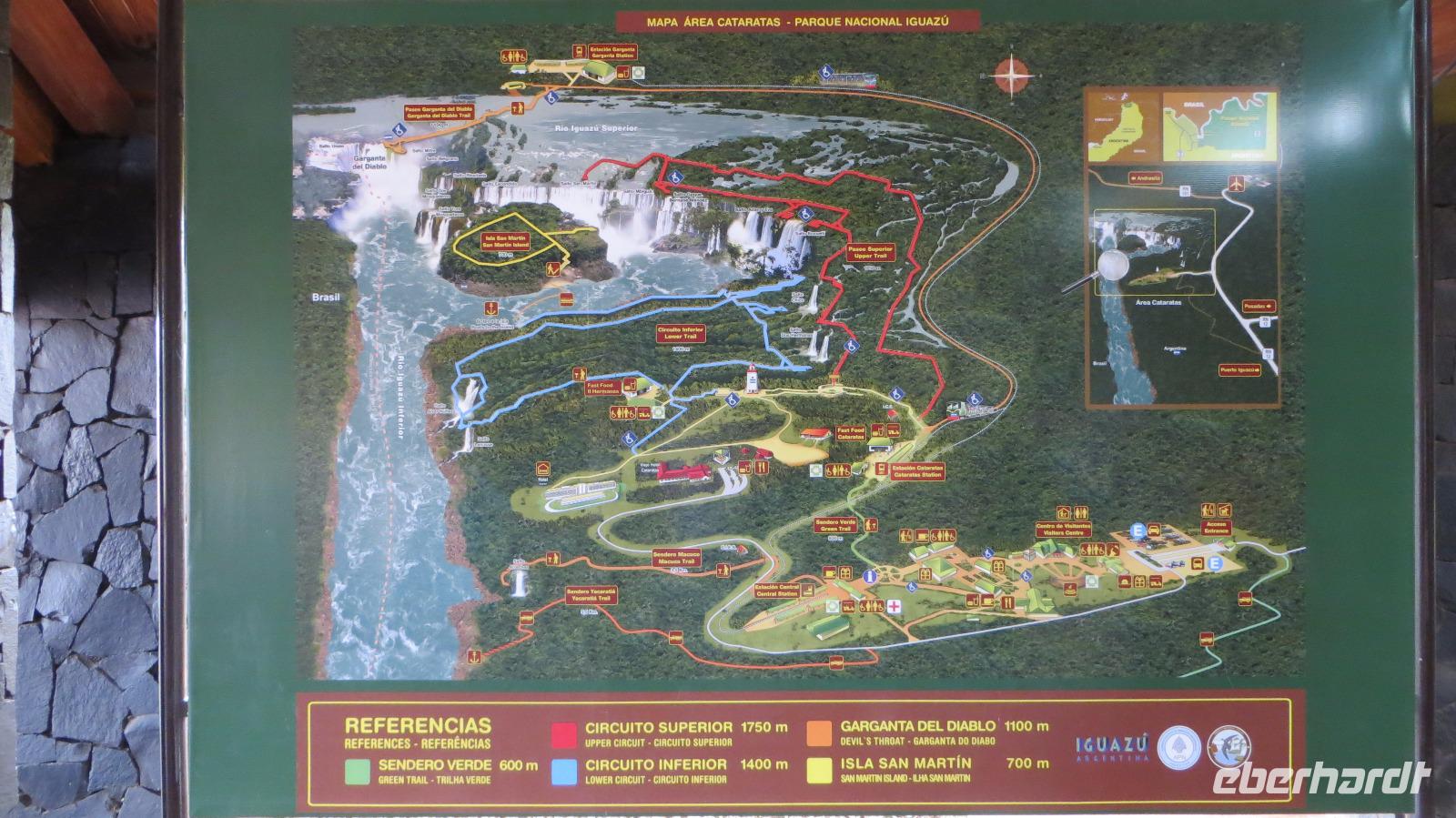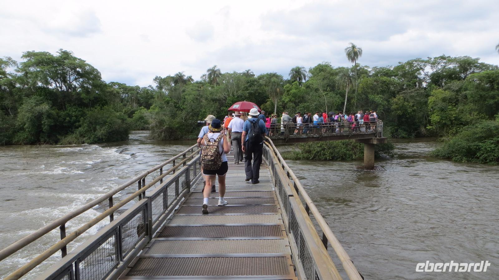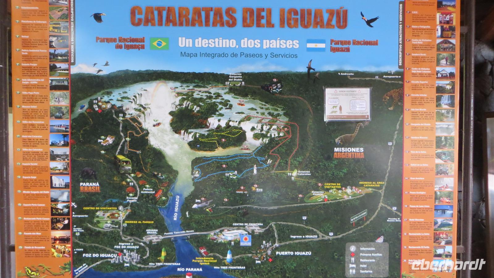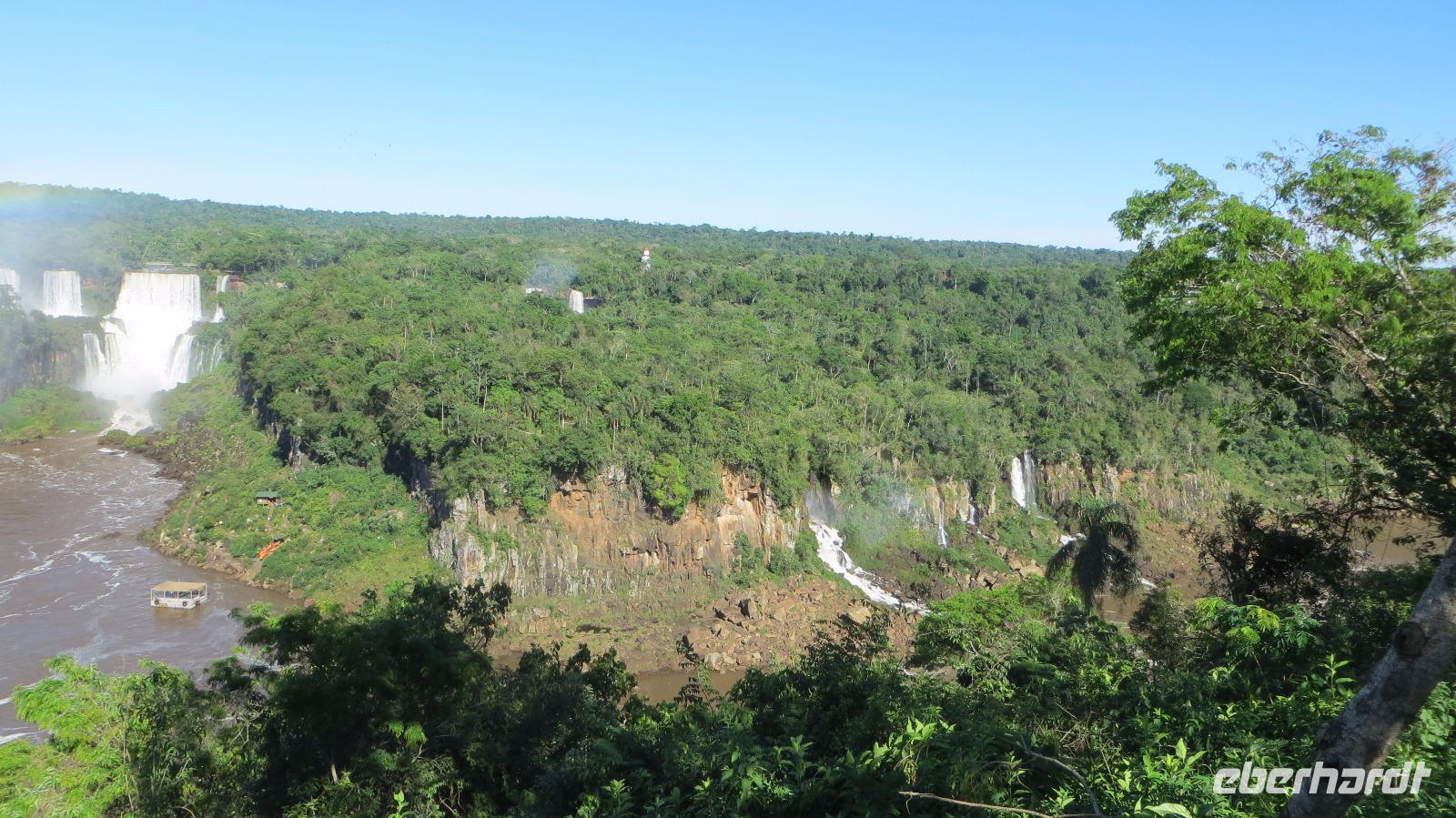 Nach unserem fruchtigen Frühstück fuhren wir zur brasilianischen Seite des Nationalparks Iguazu Wasserfälle und dem letzten Land auf unserer Reise durch Südamerika. Auf einer angenehmen Route durch den Wald neben dem Fluss bestaunten wir diese gigantischen Wasserfälle, die durch das herrliche Wetter einen Regenbogen nach dem anderen zauberten. Die Fälle haben Namen wie „ Le Trois Mosqueteirs", „La Gran Garganta" oder La Garganta del Diablo".