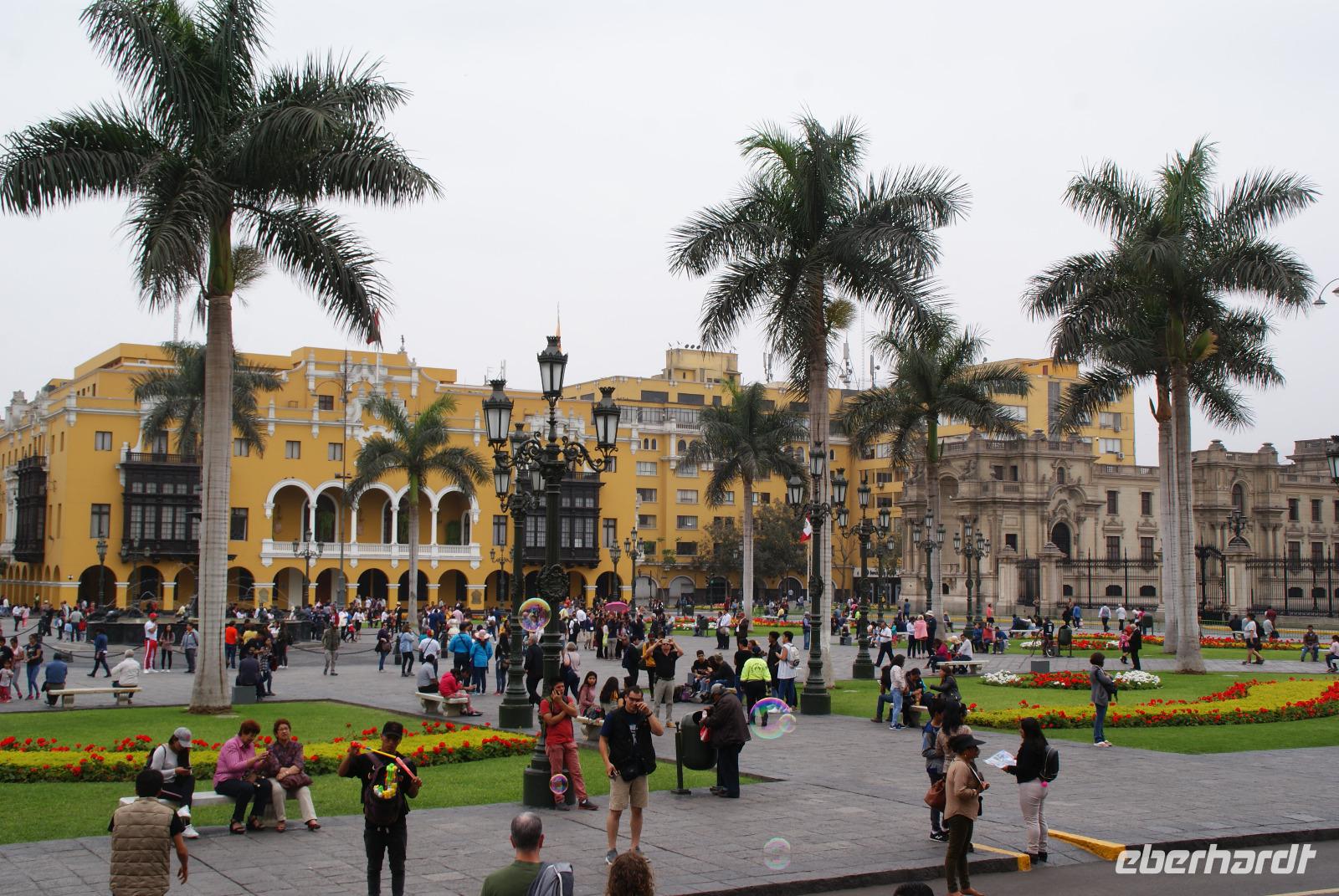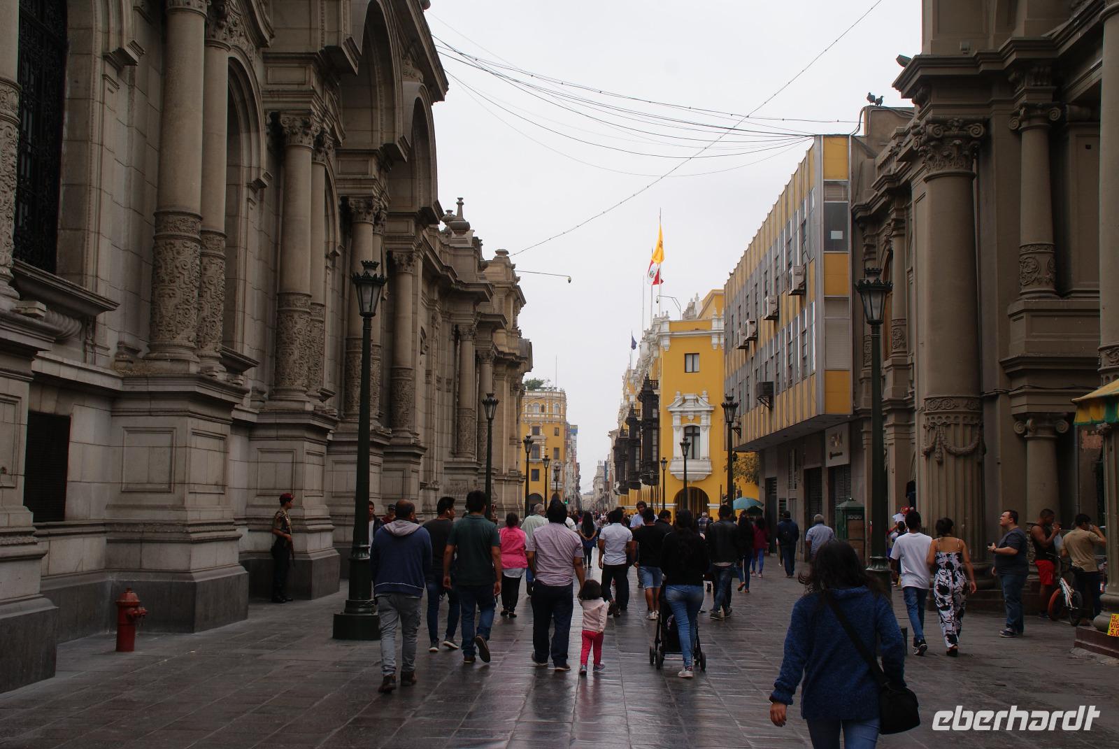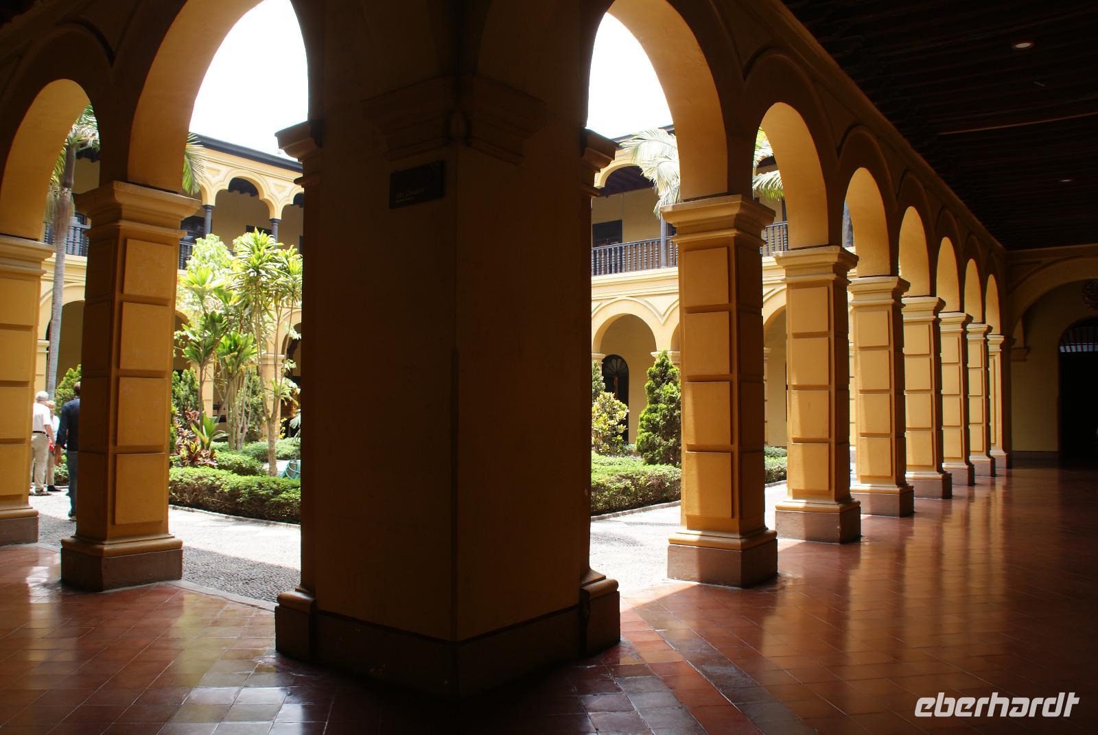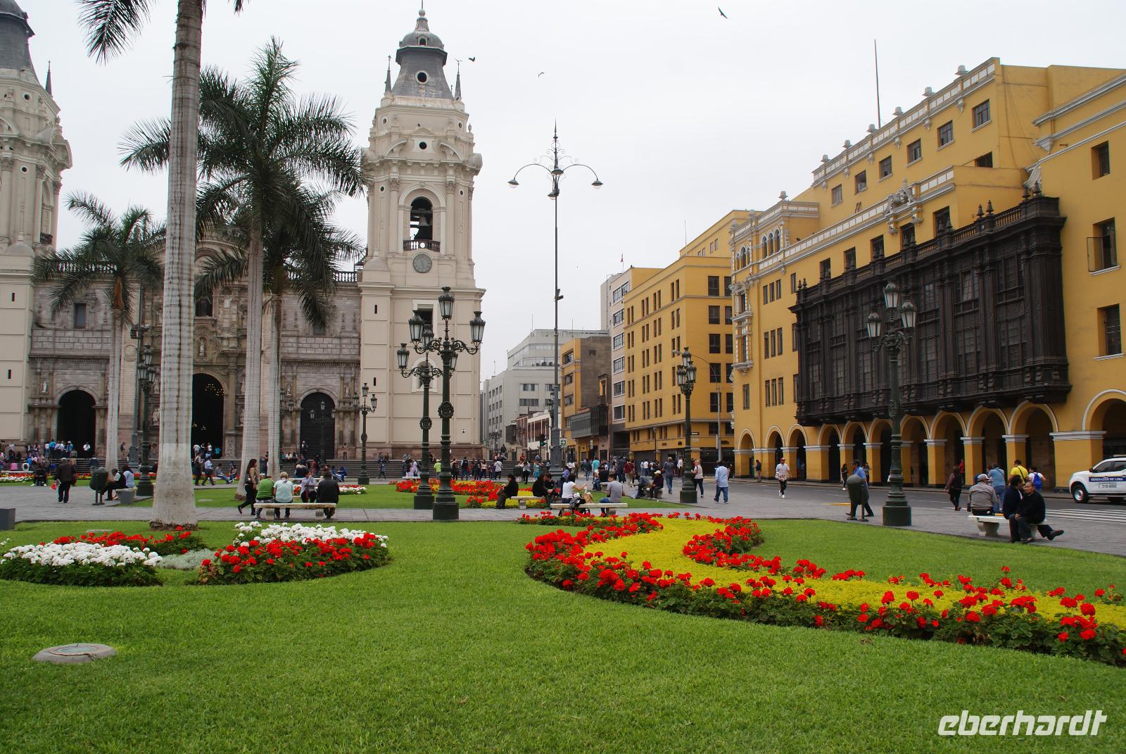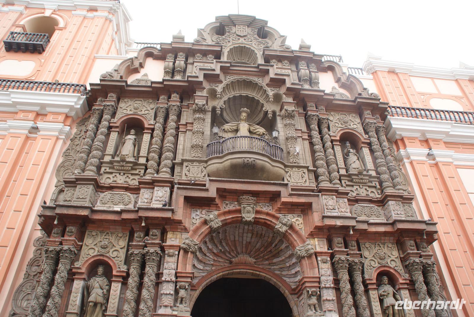Geschlafen wie die Steine treffen wir uns ausgeruht zum tollen Frühstück des Casa Andina Hotels und begeben uns mit Silvia und Busfahrer Adrian auf Citytour. Wir erfahren, dass die Region um Lima 120 Km lang und 30 Km breit ist und die Altstadt 1988 zum Weltkulturerbe ernannt wurde. Einen Fotostopp machen wir an der 23 m hohen Tempelpyramide Huaca Pucllana (Huaca= Zeremonienort/Heiliger Ort), das 5 Hektar große Gelände als Wahrzeichen von Miraflores gilt. Sie wurde aus Lehmziegeln errichtet, die wie Bücher aneinandergereiht zu sehen sind. Auf der Fahrt in die Altstadt sehen wir bereits viele schöne afrikanische Tulpenbäume und Jacarandas, die schön rot und lila für uns leuchten. Unsere Fahrt führt uns vorbei am Fußballstadion, verschiedene Botschaften, Plaza de Libertad, dem italienischen Kunstmuseum, dem Justizpalast und wir halten am Plaza San Martin um u.a. in einer Wechselstube uns mit der Landeswährung Sol zu versorgen. Ein Spaziergang erfolgt zum Plaza Major und wir werfen einen Blick in die wunderschöne Kathedralbasilika St. Johannes, deren Grundstein im Jahr 1535 durch Francisco Pizarro gelegt wurde. Gegenüberliegend befindet sich das Rathaus der Stadt, welches im traditionellen Gelb erstrahlt und wir schlendern durch die wunderschönen Gassen der Altstadt bis zum Dominikanerkloster Santo Domingo, welches wir anschließend besichtigen. Dieses wurde im Jahr 1535 gegründet und wir sehen die Chorstühle mit Sitzklappen, die tollen Azulejos (Kacheln) aus dem Jahr 1606 sowie die imposante Bibliothek, an deren Stelle 1551 die erste Universität Südamerikas entstand. Anschließend fahren wir zurück nach Miraflores und erkunden am Nachmittag den Stadtteil auf eigene Faust. Ein schöner Spaziergang führt uns zum Larcomar an die Küste und im tollen Restaurant La Bonbonniere gibt es für uns einen Mittagssnack mit besonders toller Aussicht direkt auf die unter uns liegende Küste und den Pazifik. Abends werden wir bei La Dama Juana zum Abendessen und einer tollen Folkloreshow erwartet. Ein riesiges peruanisches Buffet mit unzähligen Köstlichkeiten und ein tolles Programm runden den Aufenthalt in Lima ab.