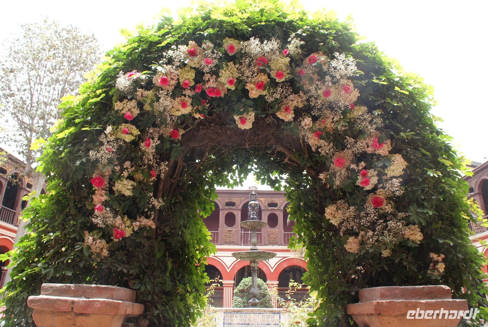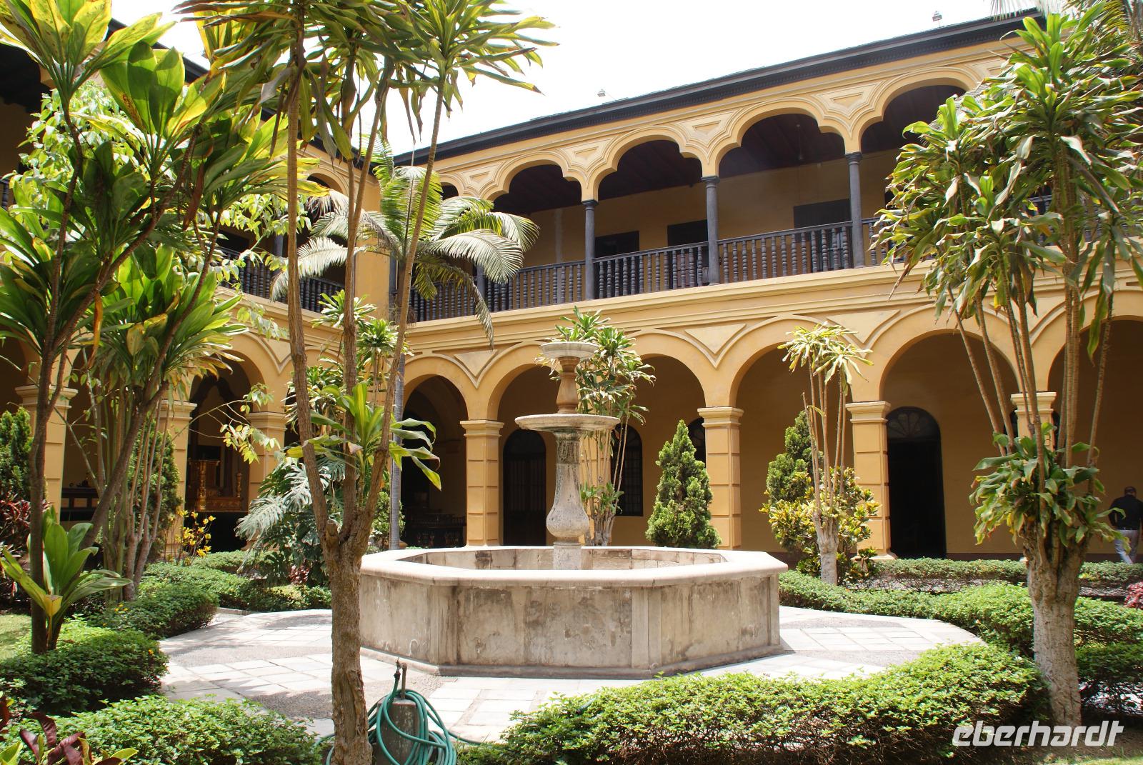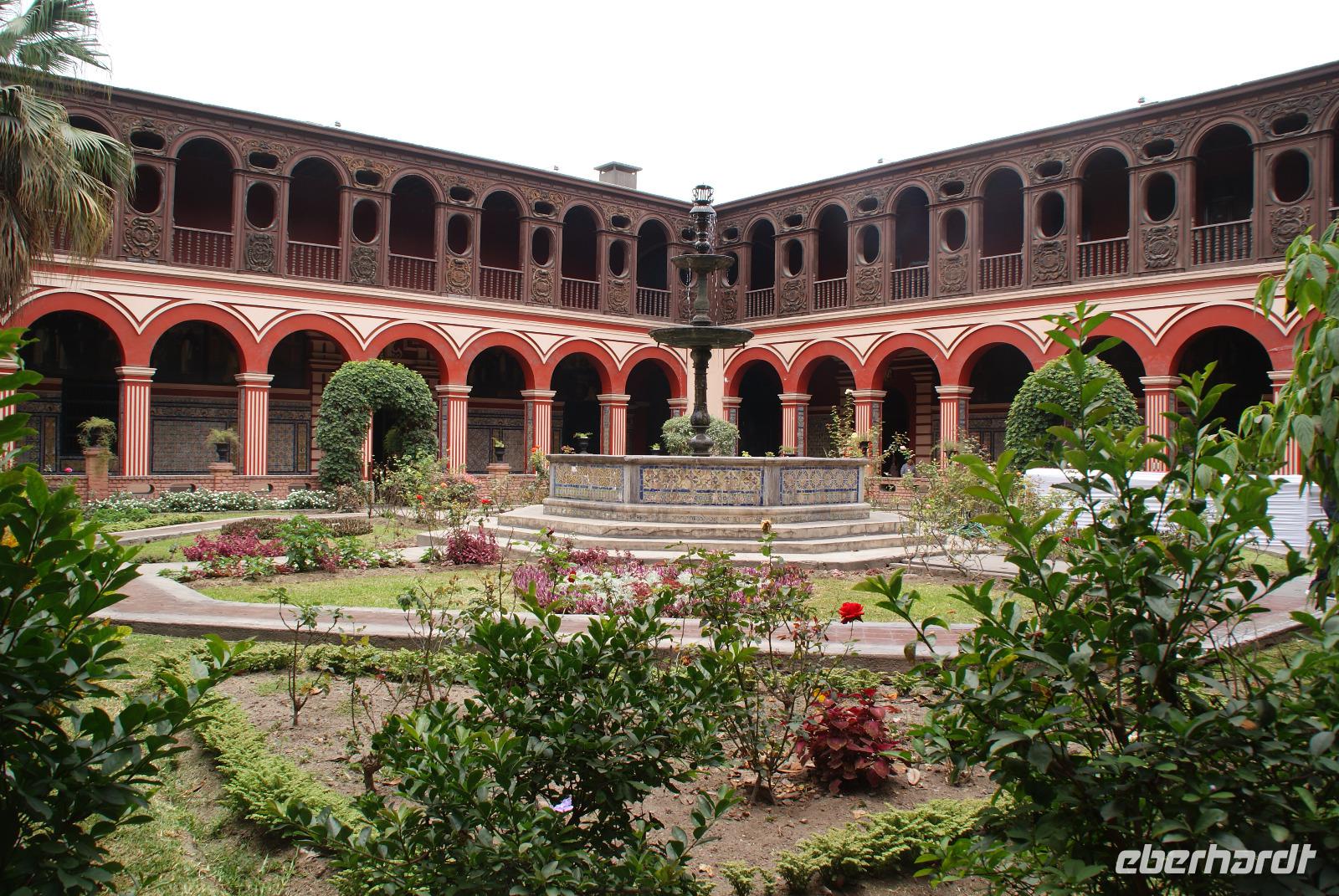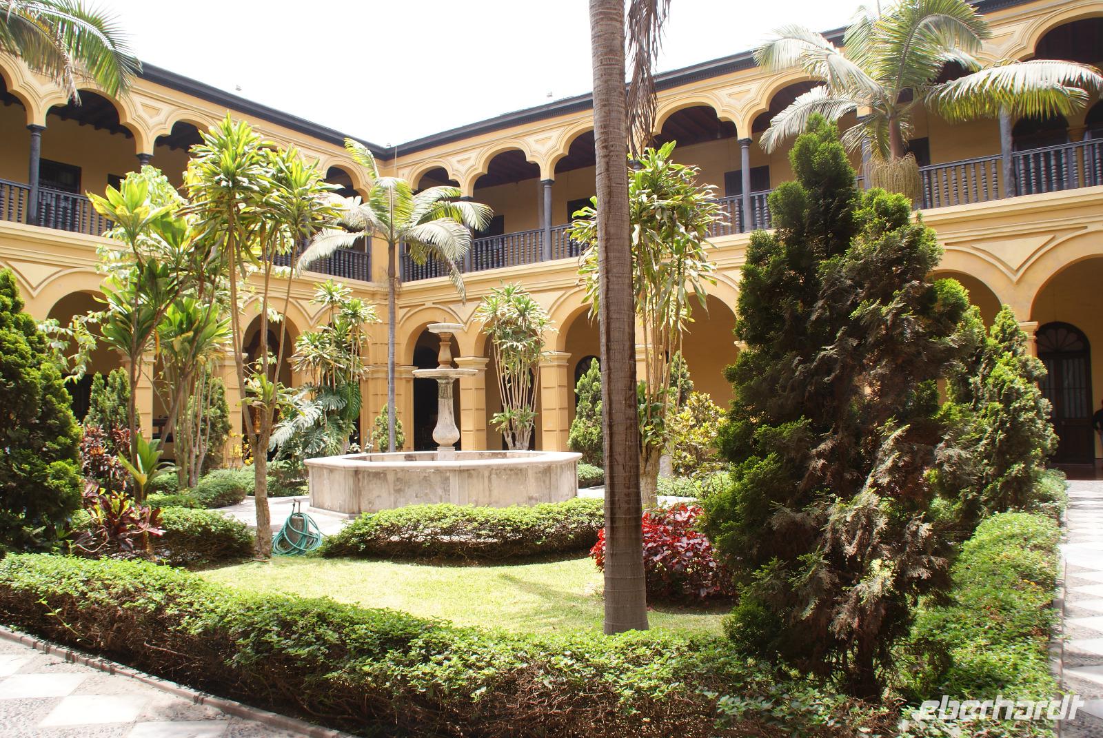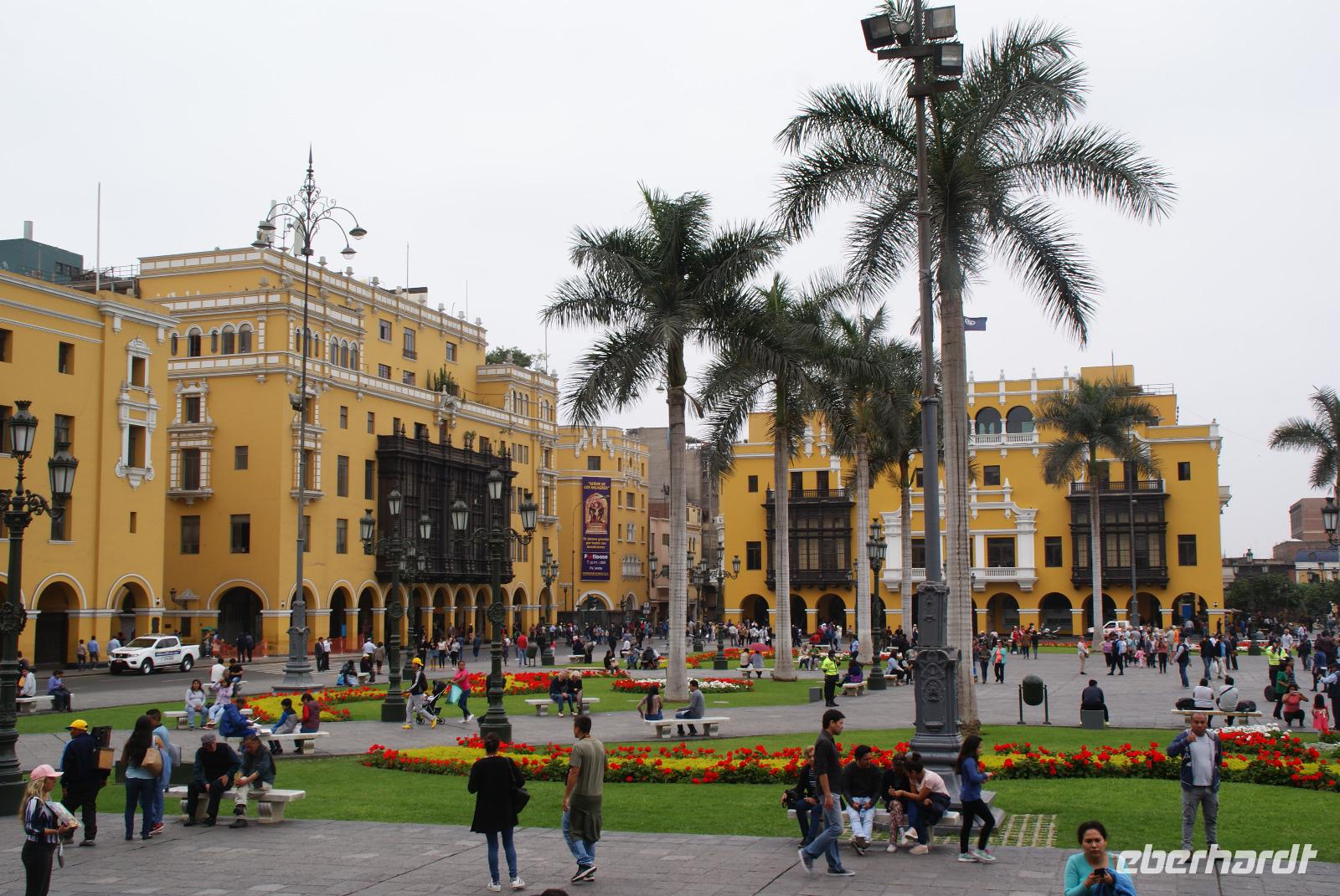 Geschlafen wie die Steine treffen wir uns ausgeruht zum tollen Frühstück des Casa Andina Hotels und begeben uns mit Silvia und Busfahrer Adrian auf Citytour. Wir erfahren, dass die Region um Lima 120 Km lang und 30 Km breit ist und die Altstadt 1988 zum Weltkulturerbe ernannt wurde. Einen Fotostopp machen wir an der 23 m hohen Tempelpyramide Huaca Pucllana (Huaca= Zeremonienort/Heiliger Ort), das 5 Hektar große Gelände als Wahrzeichen von Miraflores gilt. Sie wurde aus Lehmziegeln errichtet, die wie Bücher aneinandergereiht zu sehen sind. Auf der Fahrt in die Altstadt sehen wir bereits viele schöne afrikanische Tulpenbäume und Jacarandas, die schön rot und lila für uns leuchten. Unsere Fahrt führt uns vorbei am Fußballstadion, verschiedene Botschaften, Plaza de Libertad, dem italienischen Kunstmuseum, dem Justizpalast und wir halten am Plaza San Martin um u.a. in einer Wechselstube uns mit der Landeswährung Sol zu versorgen. Ein Spaziergang erfolgt zum Plaza Major und wir werfen einen Blick in die wunderschöne Kathedralbasilika St. Johannes, deren Grundstein im Jahr 1535 durch Francisco Pizarro gelegt wurde. Gegenüberliegend befindet sich das Rathaus der Stadt, welches im traditionellen Gelb erstrahlt und wir schlendern durch die wunderschönen Gassen der Altstadt bis zum Dominikanerkloster Santo Domingo, welches wir anschließend besichtigen. Dieses wurde im Jahr 1535 gegründet und wir sehen die Chorstühle mit Sitzklappen, die tollen Azulejos (Kacheln) aus dem Jahr 1606 sowie die imposante Bibliothek, an deren Stelle 1551 die erste Universität Südamerikas entstand. Anschließend fahren wir zurück nach Miraflores und erkunden am Nachmittag den Stadtteil auf eigene Faust. Ein schöner Spaziergang führt uns zum Larcomar an die Küste und im tollen Restaurant La Bonbonniere gibt es für uns einen Mittagssnack mit besonders toller Aussicht direkt auf die unter uns liegende Küste und den Pazifik. Abends werden wir bei La Dama Juana zum Abendessen und einer tollen Folkloreshow erwartet. Ein riesiges peruanisches Buffet mit unzähligen Köstlichkeiten und ein tolles Programm runden den Aufenthalt in Lima ab.