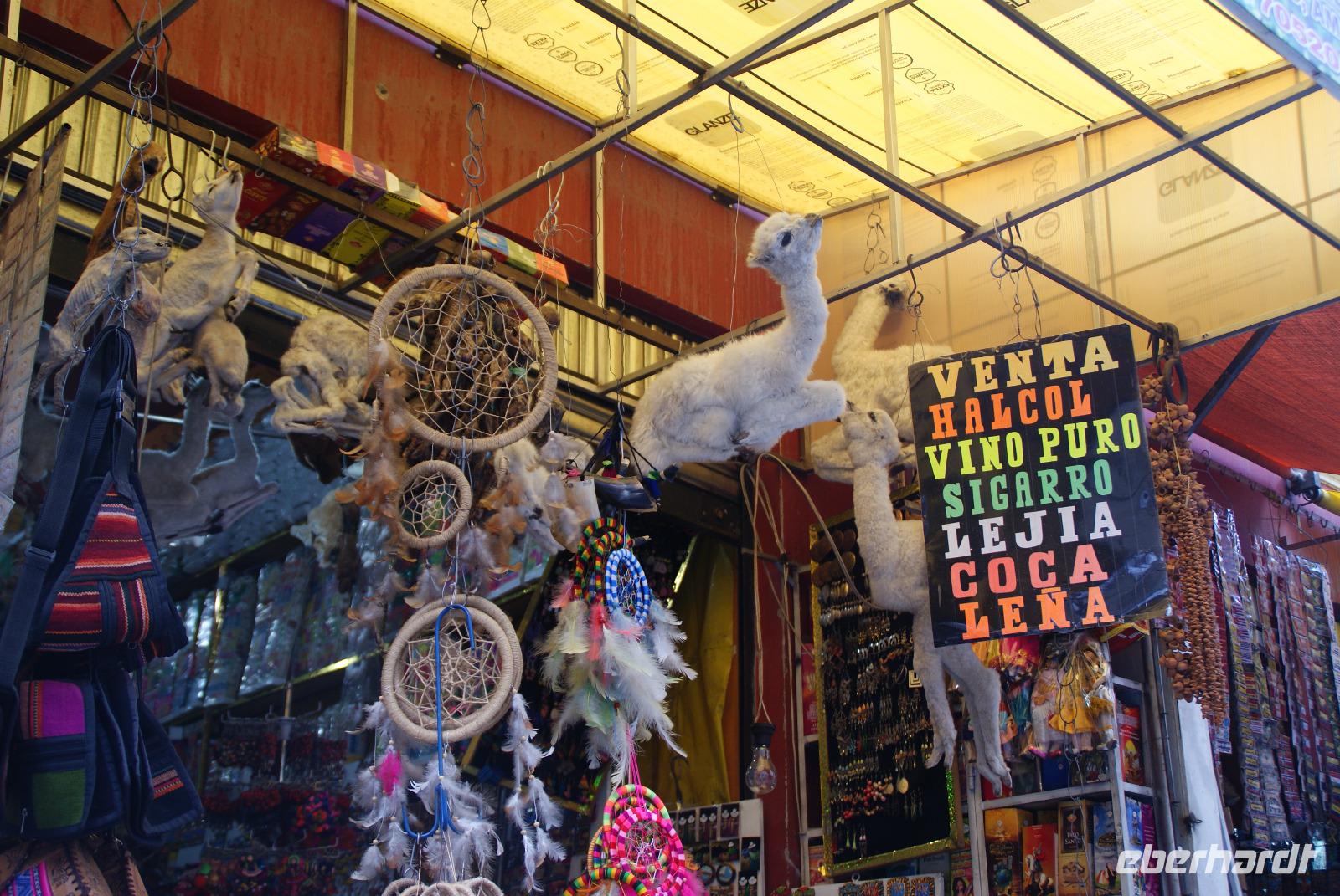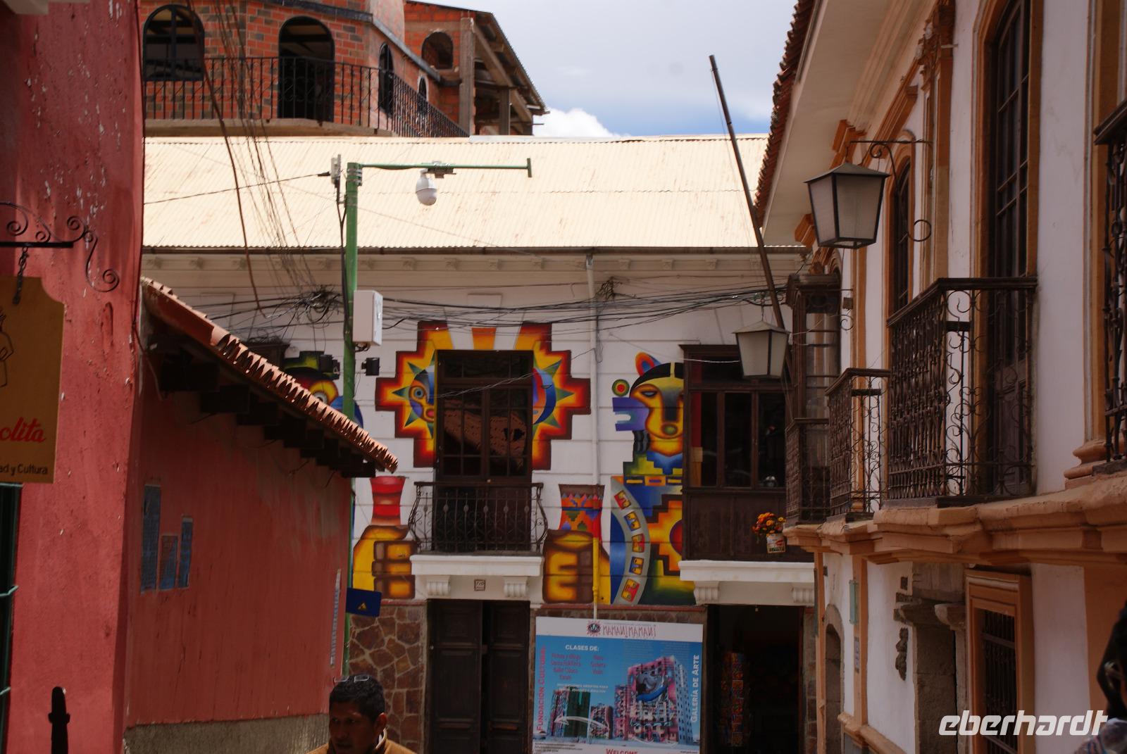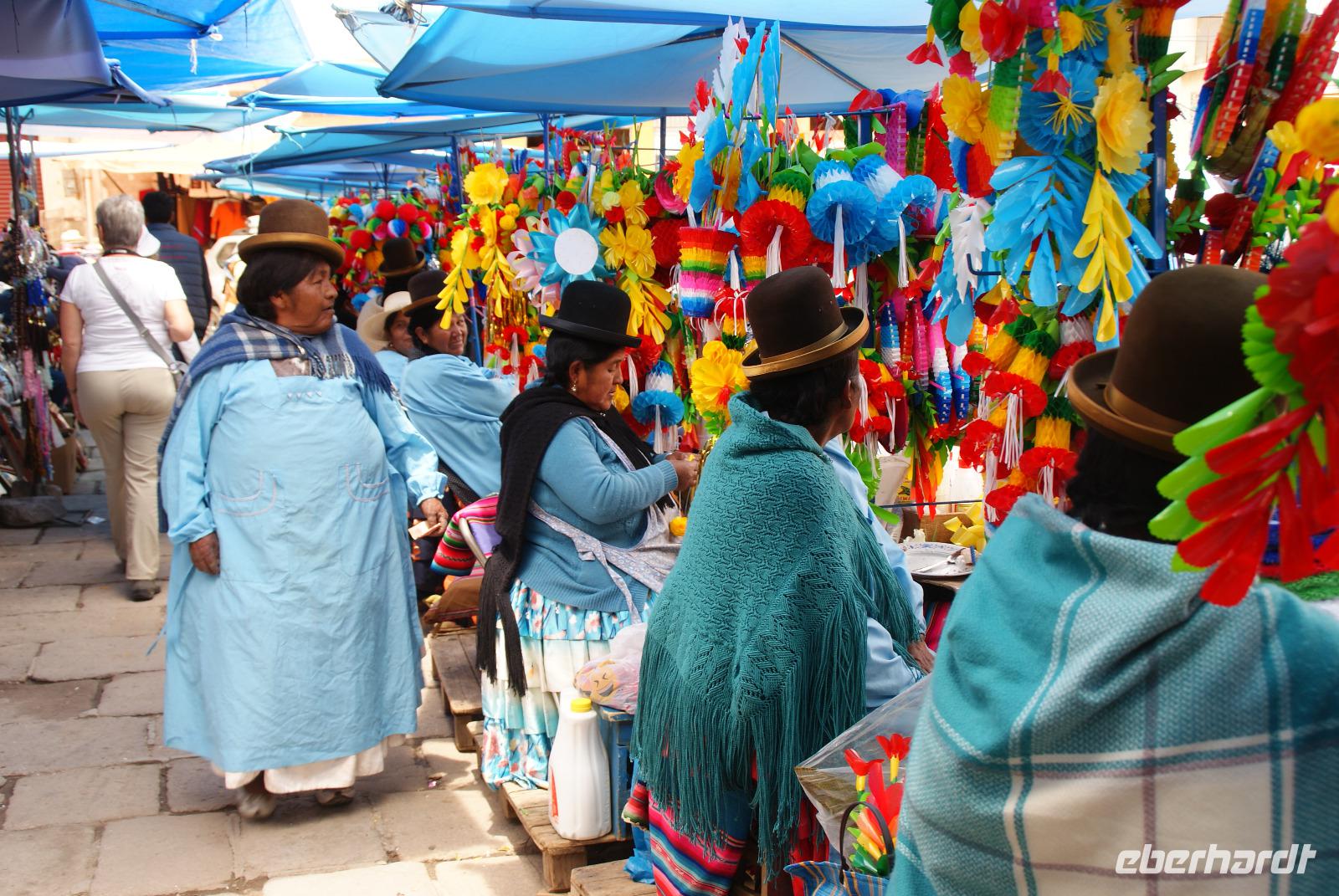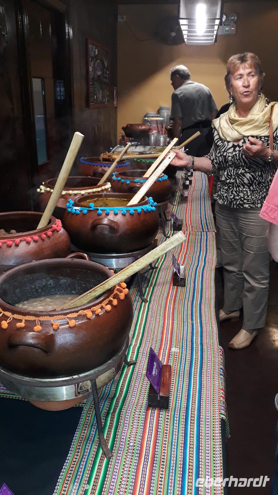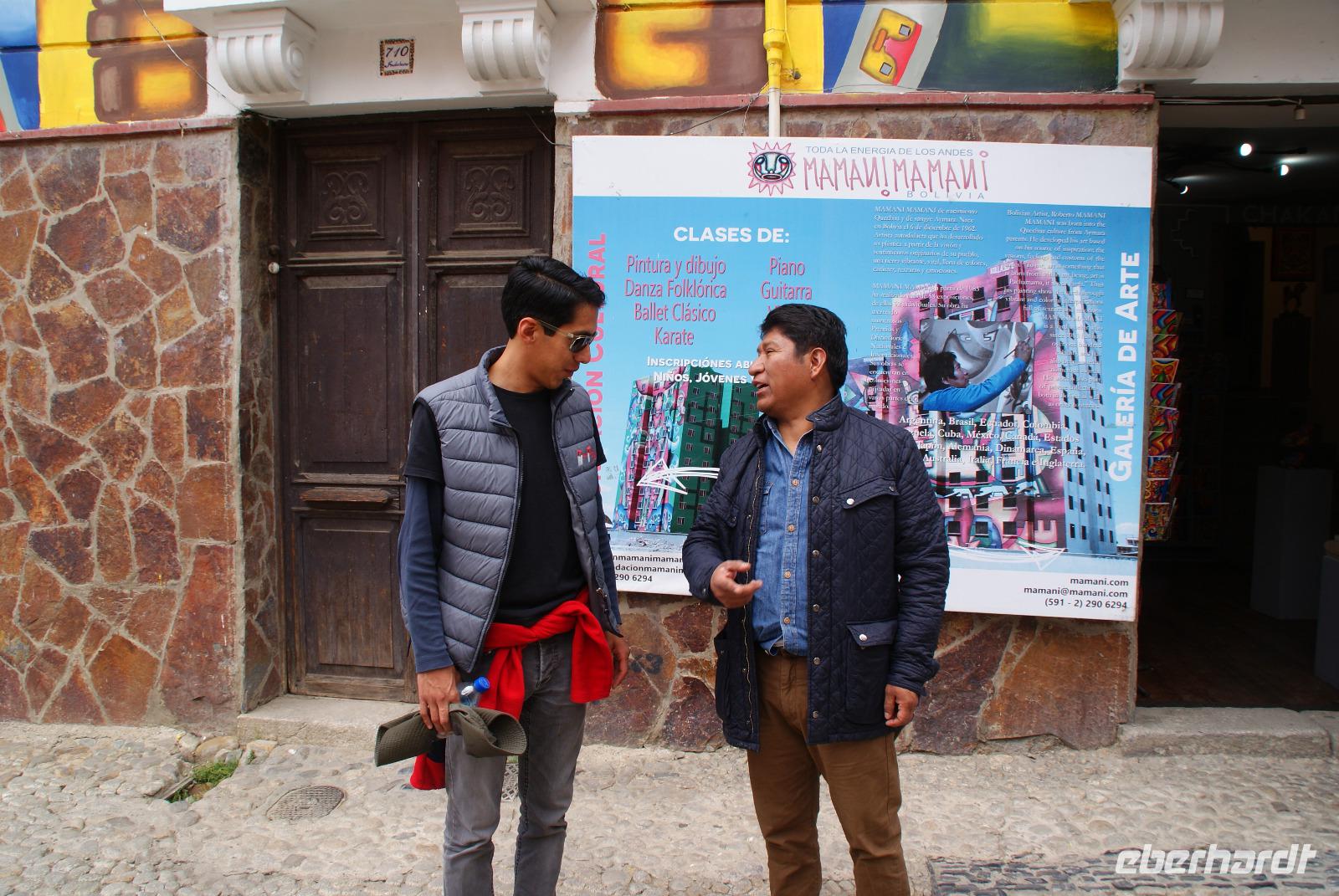 Wir erwachen bei strahlendem Sonnenschein und unglaublicher Kulisse mit Blick auf den Titicacasee. Gut gefrühstückt brechen wir auf und fahren nach La Paz, dem Regierungssitz Boliviens, welches 1,2 Millionen Einwohner fasst. Zunächst stoppen wir jedoch für wie Martin es sagt „Fotoalarm", denn wir haben einen grandiosen Ausblick auf die Königberge, die um die 6000m hoch und schneebedeckt sind. Einfach toll dieser Kontrast zur übrigen Landschaft. Weiter geht's und bald darauf kommen wir in El Alto, der Oberstadt von La Paz an. Diese ist ebenfalls eine riesen Stadt für sich, die bis 1985 zu La Paz gehörte und als die größte indigene Stadt der Welt mit aktuell 1 Mio Einwohner gilt. Martin zeigt uns die interessante Bauweise, wo ganze Häuser auf den Dächern von mehrstöckigen Gebäuden thronen. Hier wird für uns eine Überraschung bereitgehalten und wir fahren mit der erst vor wenigen Jahren erbauten Seilbahn der Firma Doppelmayr hinunter nach La Paz. So überwinden wir innerhalb von 40 Min. Fahrt eine Höhendistanz von 700m hinunter in die Unterstadt. Ein Wahnsinnsausblick bietet sich uns und wir haben von den Gondeln aus die Möglichkeit, diese riesen Stadt in all ihren Dimensionen zu bestaunen. Unten angekommen, sorgen wir zunächst für unser Mittagessen und folgen der Empfehlung unseres Reiseleiters und kosten die köstlichen Saltenas, verschieden gefüllte Teigtaschen. Anschließend besichtigen wir die interessanten Formationen des Mondtals. Dieses befindet sich 10 Km südöstlich von La Paz (= der Frieden) und besteht aus unzähligen Felsen, Felsformationen und Erdhügeln. Benannt wurden diese nach Nils Armstrong, der sie mit der Landschaft auf dem Mond verglich. Doch nun zurück ins spanische Viertel von La Paz und schon bald schlendern wir durch die Jaen Straße, die aus dem 17. Jahrhundert stammt und noch viele schöne alte und gut erhaltene Bauten vorzuweisen hat. An dessen Ende stoßen wir auf die Galerie des berühmten Malers Mamani Mamani und haben das große Glück diesen persönlich anzutreffen. Wir werden herzlich empfangen und auf seinen Wunsch machen wir mit ihm ein schönes gemeinsames Foto. Wir hören, dass dieser ein enger Freund des Präsidenten Evo Morales ist und befinden uns somit in prominenter Gesellschaft. Weiter geht die Stadtbesichtigung zum Plaza Murillo, an dem man des Weiteren auch die Kathedrale, den historischen und modernen Präsidentenpalast und das Parlament bestaunen kann. Eine tolle Kulisse, die wir bei bestem Wetter genießen. Nun wird es gruselig, wir begeben uns zum Hexenmarkt und im Haus einer Hexe führt uns Martin in die verschiedenen Rituale und Gebräuche der „brujas" ein. Wir entdecken gruselige Utensilien wie beispielsweise Lamaföten. Schnell ziehen wir weiter und genießen erst mal einen Kaffee in geselliger Runde. Abschließend werfen wir noch einen Blick auf die St. Francisco Kirche und checken anschließend in unser Ritz Apart Hotel ein. Ein Abendessen im Haus beendet unseren Aufenthalt in Bolivien und morgen früh heißt es auf zu neuen Abenteuern-Chile, wir kommen!