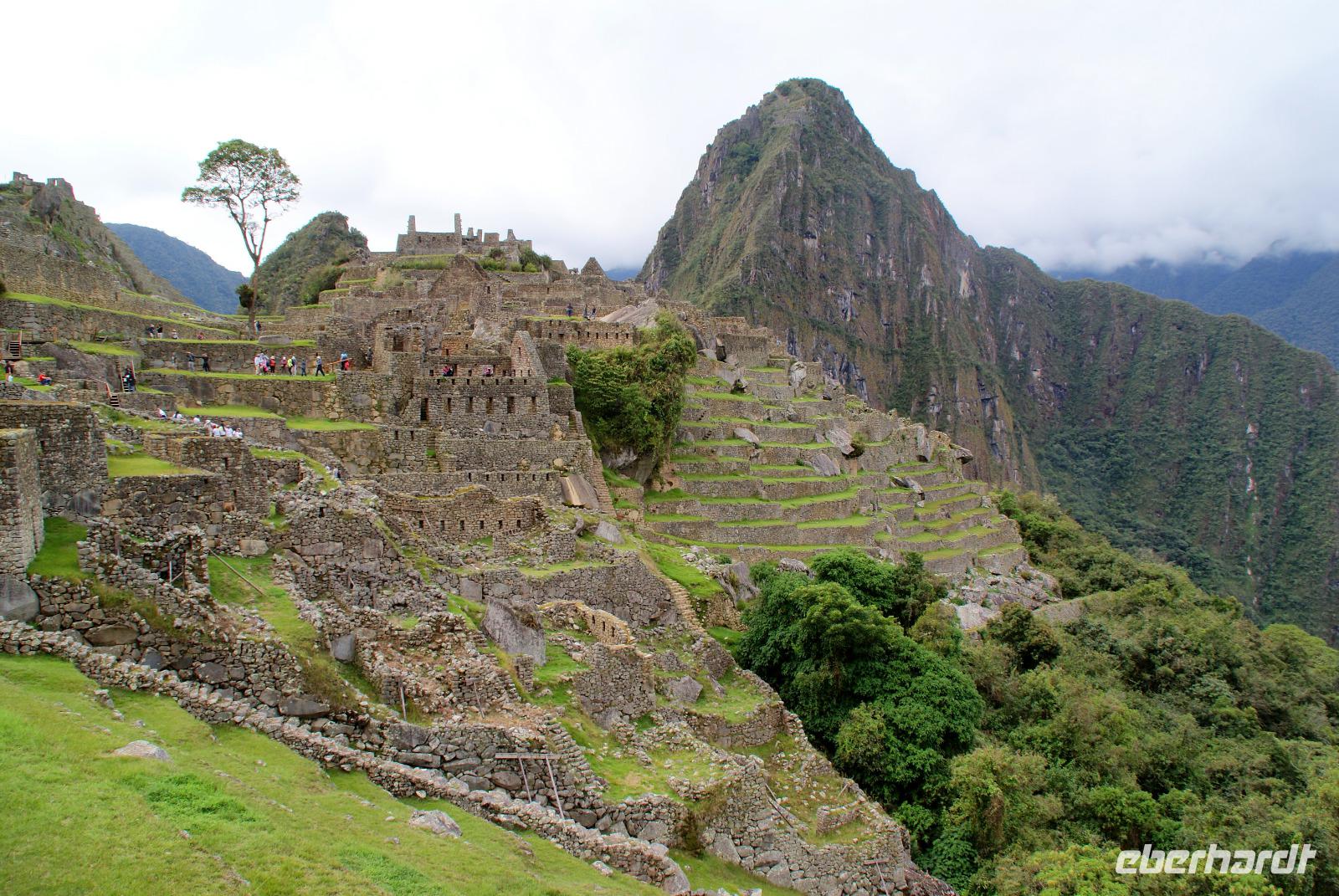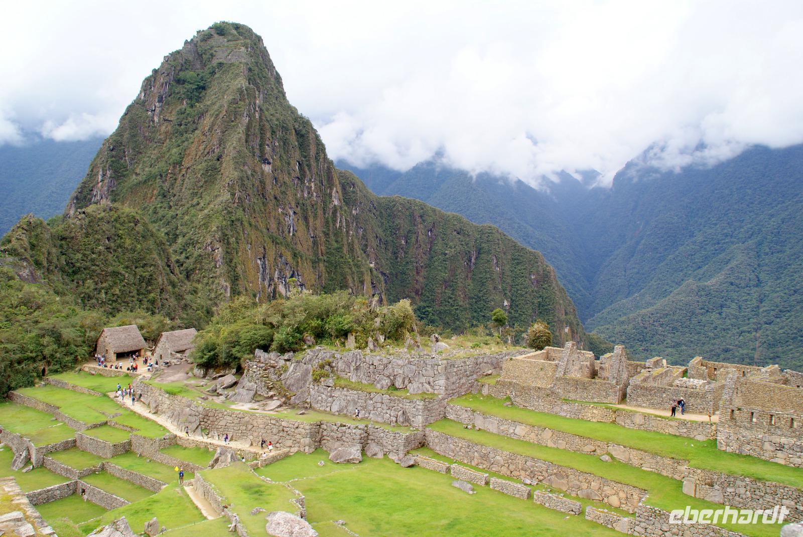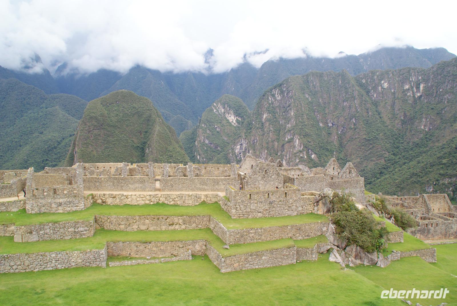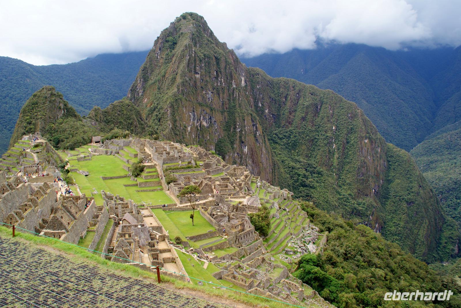 Bestens gefrühstückt verlassen wir die schöne Hazienda und fahren per Bus mit Caesar und Lucas nach Ollantaytambo, dem Bahnhof von wo aus der Perurail Zug nach Aguas Calientes fährt. Eine wunderschöne 1.5-stündige Zugfahrt führt uns malerisch durch eine grüne Schlucht, von wo wir auch immer den berühmten Inka Trail sehen. Auf diesem kann man sich einer 4-tägigen und 40 Km langen, geführten Trekking Tour zum Machu Picchu anschließen. Pünktlich kommen wir in Aguas Calientes an, gehen zu unserem Hotel El Mapi, erledigen die Formalitäten, deponieren unser Gepäck und starten zur Auffahrt zur Ruinenstadt Machu Picchu. Ein Shuttlebus bringt uns in 20 Minuten nach oben und wir stehen vor einem der größten Highlights dieser besonderen Reise. Zunächst gehen wir zu einem Aussichtspunkt und dürfen alles erst mal in Ruhe fotografieren und auf uns wirken lassen. Lucas erzählt uns ausführlich die Geschichte Machu Picchus und auch die verschiedenen Theorien, wer hier gewohnt hat und warum dieser Ort nach nur ca. 100 Jahren wieder verlassen wurde. Wir erfahren, dass die Anlage Machu Picchu alter Berg bedeutet, wobei man bei der klassischen Ansicht auf den „Wayna Picchu", den jungen Berg schaut. Die Stadt Machu Picchu wurde 1450 erbaut und umfasste in ihrer Hochzeit bis zu 1000 Bewohner. Wir spazieren durch die verschiedenen Bereiche und Häuser, sehen Versammlungs-und Opferplätze und auch Häuser, die originalgetreu wieder mit Dächern gedeckt wurden. Eine tolle Atmosphäre und es entstehen unzählige schöne Aufnahmen. Am Nachmittag kehren wir wieder per Bus nach Aguas Calientes vom beeindruckenden Ausflug zurück und nun genießt jeder nach Gusto den restlichen Nachmittag in diesem quirligen Örtchen. Ein schönes Abendessen im Hotel rundet den ereignisreichen Tag ab...