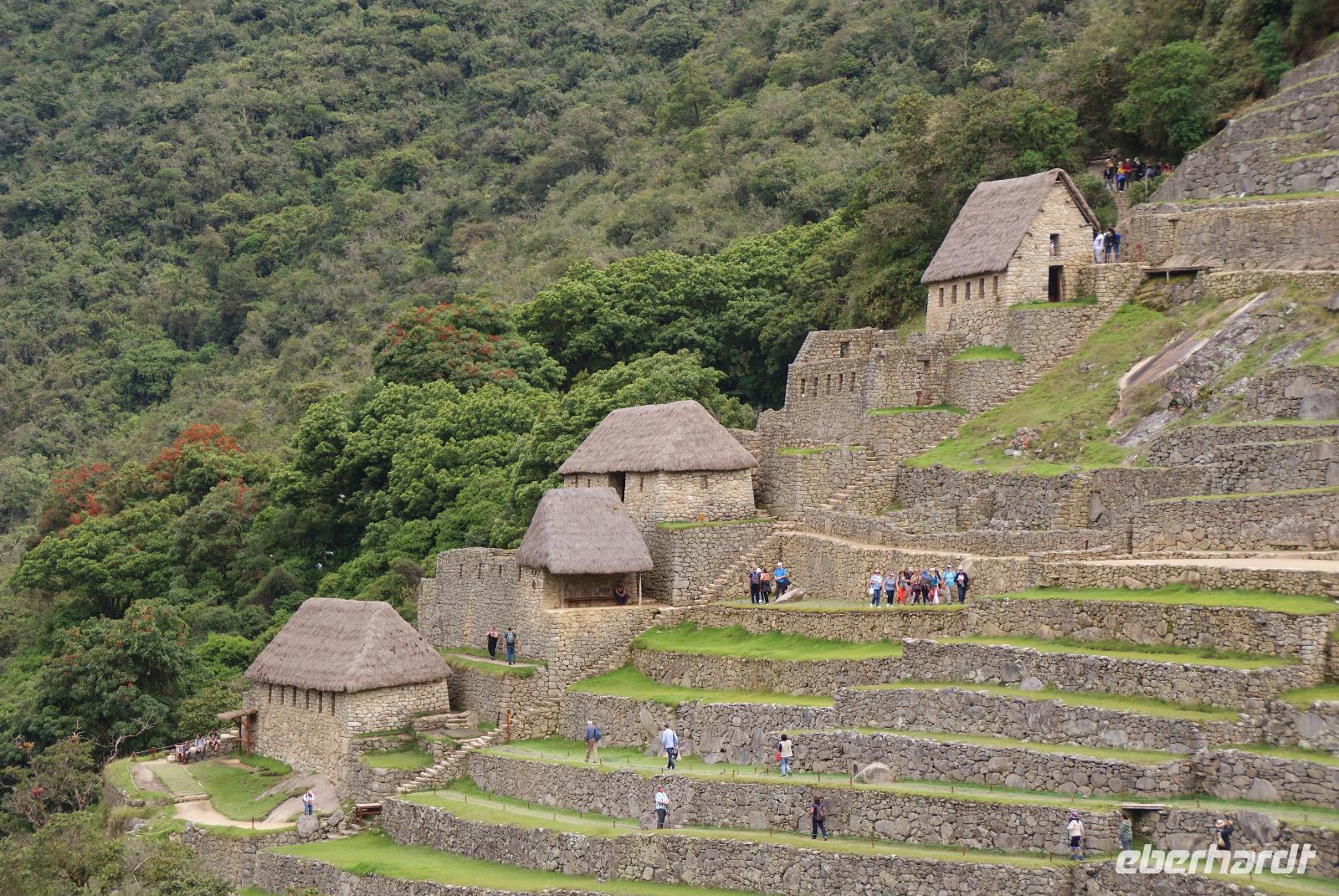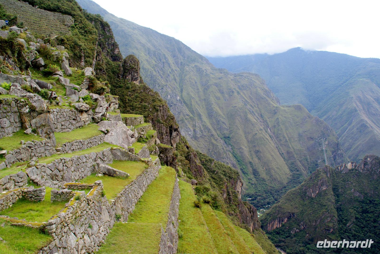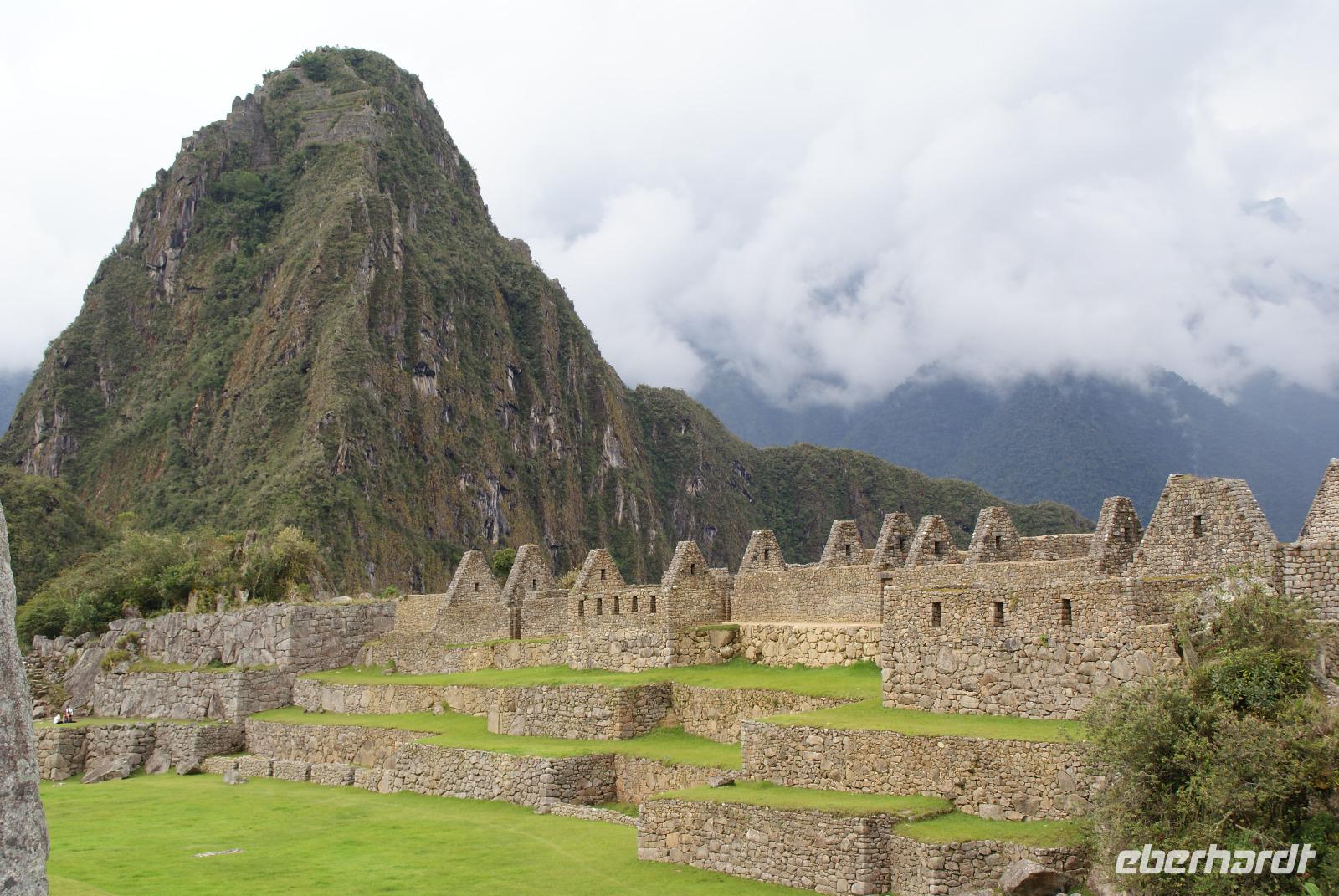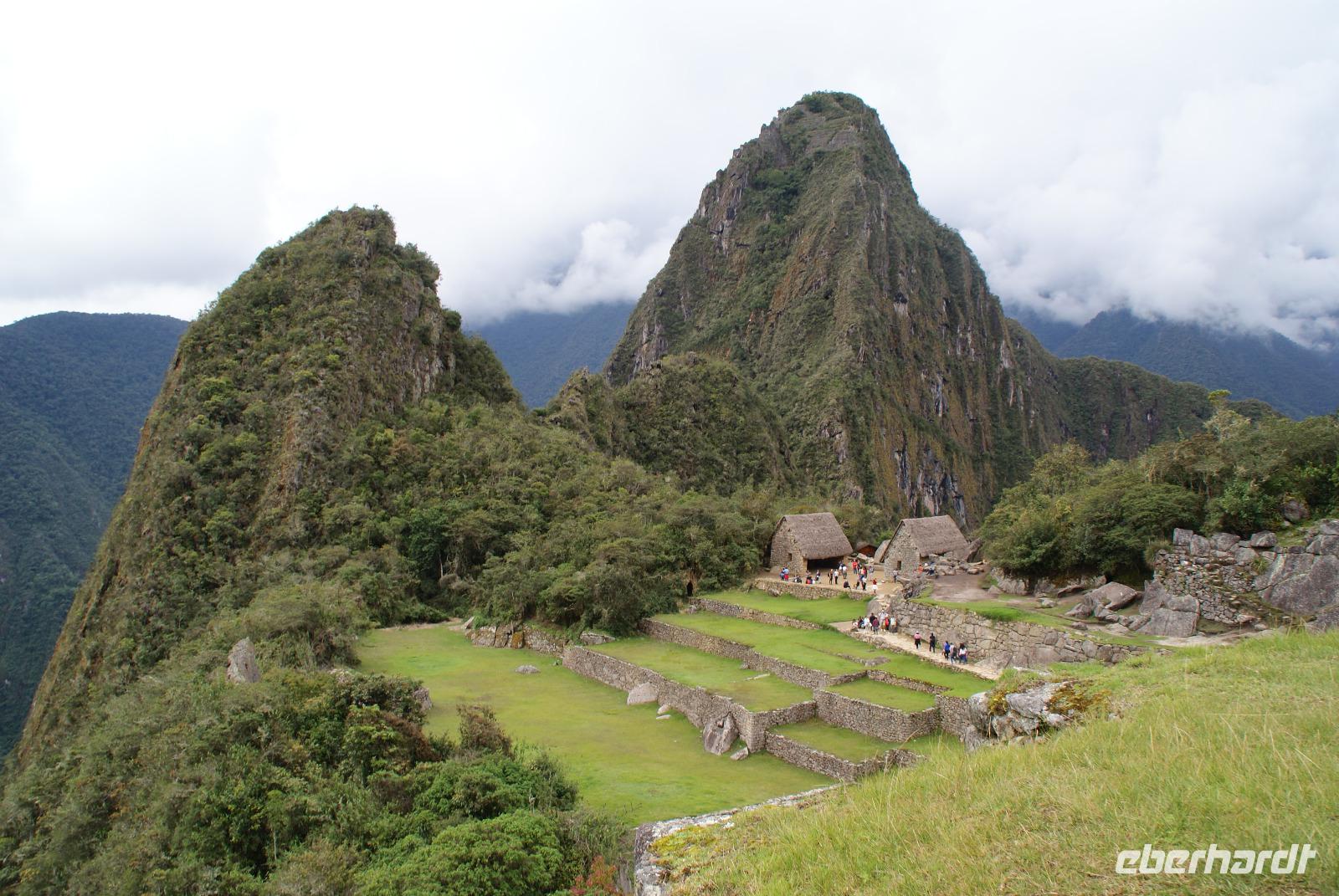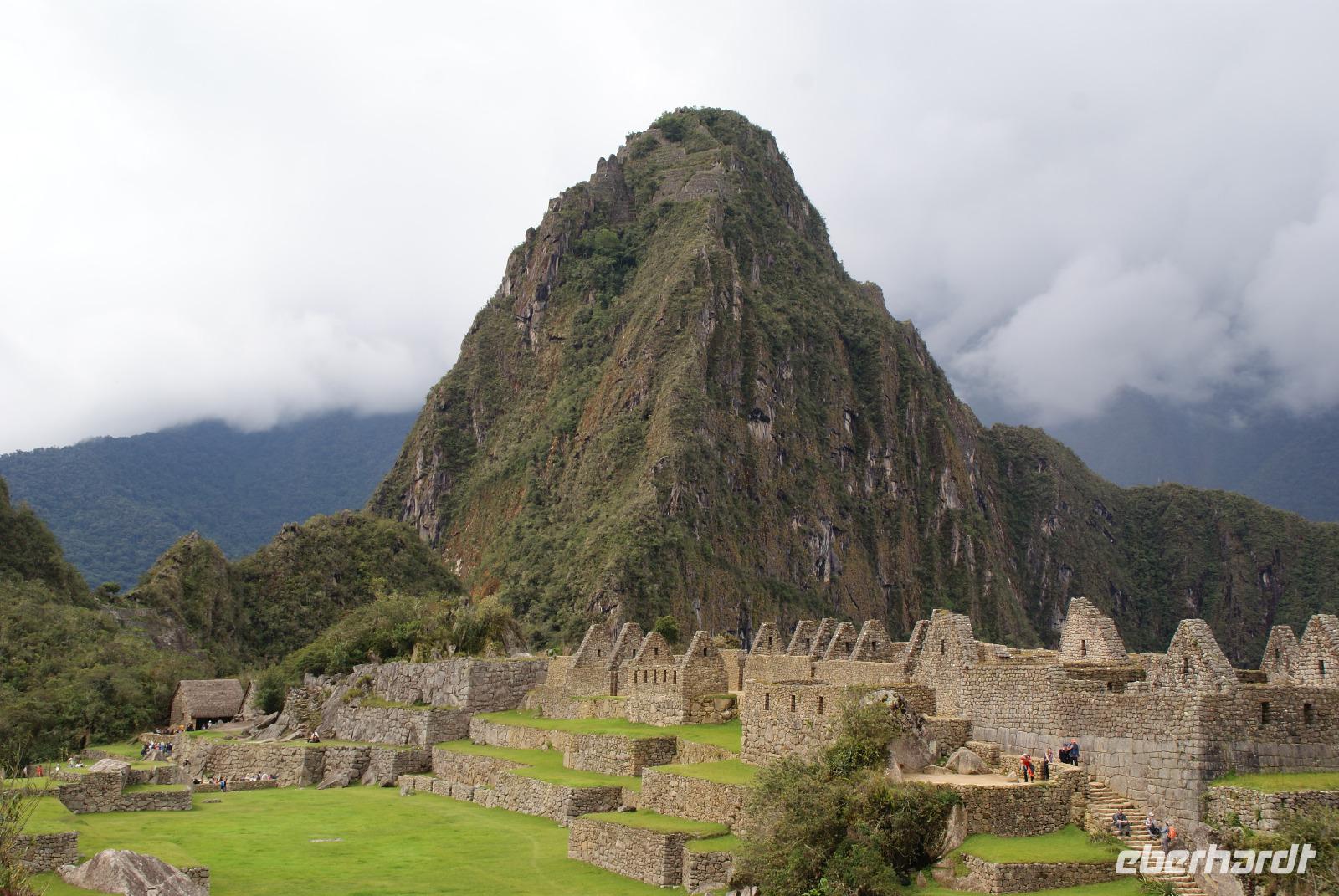 Bestens gefrühstückt verlassen wir die schöne Hazienda und fahren per Bus mit Caesar und Lucas nach Ollantaytambo, dem Bahnhof von wo aus der Perurail Zug nach Aguas Calientes fährt. Eine wunderschöne 1.5-stündige Zugfahrt führt uns malerisch durch eine grüne Schlucht, von wo wir auch immer den berühmten Inka Trail sehen. Auf diesem kann man sich einer 4-tägigen und 40 Km langen, geführten Trekking Tour zum Machu Picchu anschließen. Pünktlich kommen wir in Aguas Calientes an, gehen zu unserem Hotel El Mapi, erledigen die Formalitäten, deponieren unser Gepäck und starten zur Auffahrt zur Ruinenstadt Machu Picchu. Ein Shuttlebus bringt uns in 20 Minuten nach oben und wir stehen vor einem der größten Highlights dieser besonderen Reise. Zunächst gehen wir zu einem Aussichtspunkt und dürfen alles erst mal in Ruhe fotografieren und auf uns wirken lassen. Lucas erzählt uns ausführlich die Geschichte Machu Picchus und auch die verschiedenen Theorien, wer hier gewohnt hat und warum dieser Ort nach nur ca. 100 Jahren wieder verlassen wurde. Wir erfahren, dass die Anlage Machu Picchu alter Berg bedeutet, wobei man bei der klassischen Ansicht auf den „Wayna Picchu", den jungen Berg schaut. Die Stadt Machu Picchu wurde 1450 erbaut und umfasste in ihrer Hochzeit bis zu 1000 Bewohner. Wir spazieren durch die verschiedenen Bereiche und Häuser, sehen Versammlungs-und Opferplätze und auch Häuser, die originalgetreu wieder mit Dächern gedeckt wurden. Eine tolle Atmosphäre und es entstehen unzählige schöne Aufnahmen. Am Nachmittag kehren wir wieder per Bus nach Aguas Calientes vom beeindruckenden Ausflug zurück und nun genießt jeder nach Gusto den restlichen Nachmittag in diesem quirligen Örtchen. Ein schönes Abendessen im Hotel rundet den ereignisreichen Tag ab...