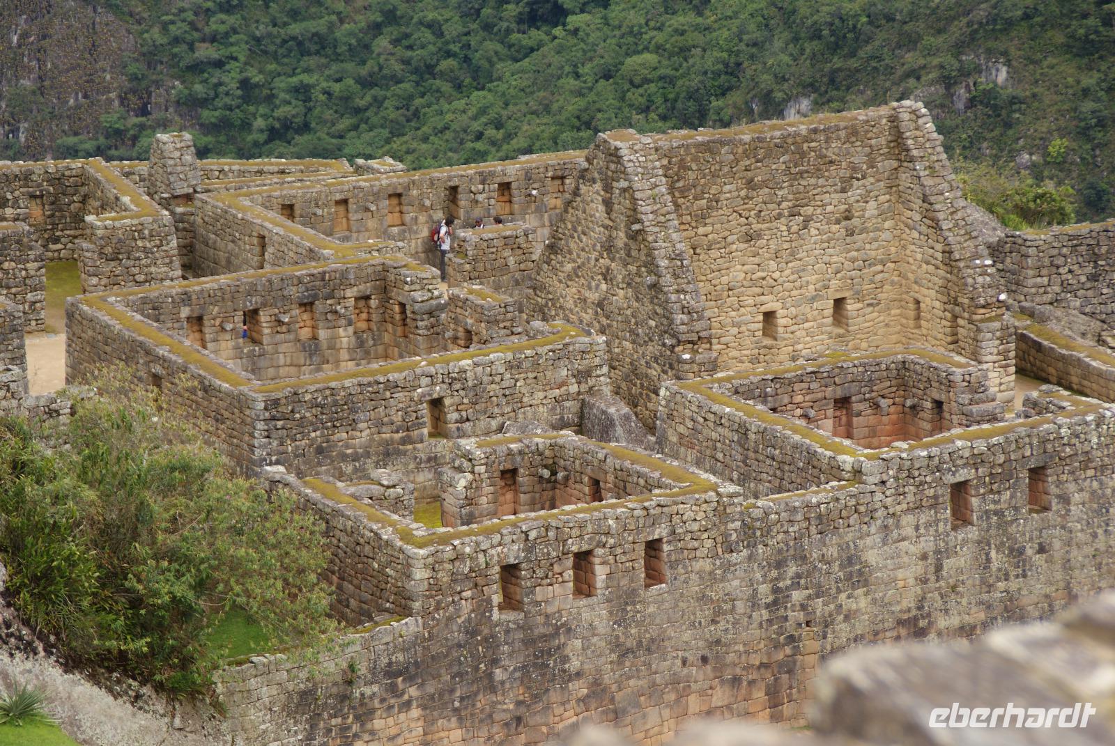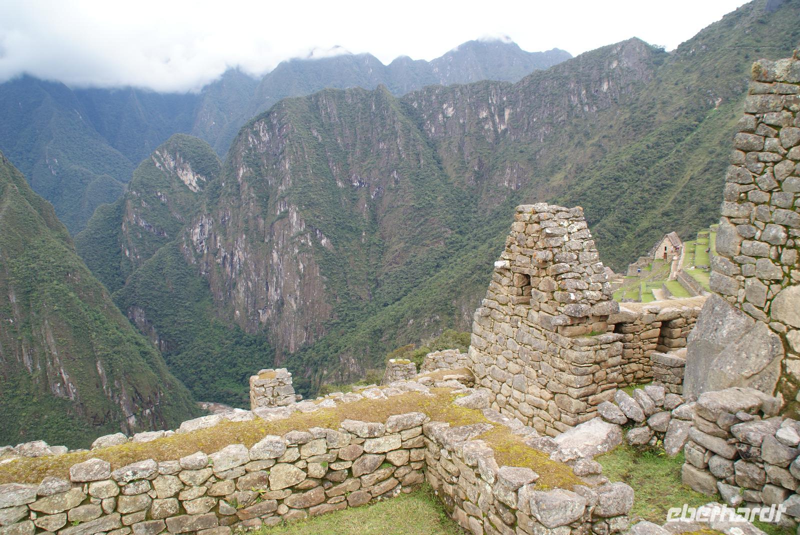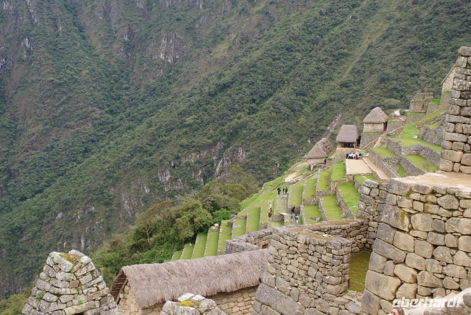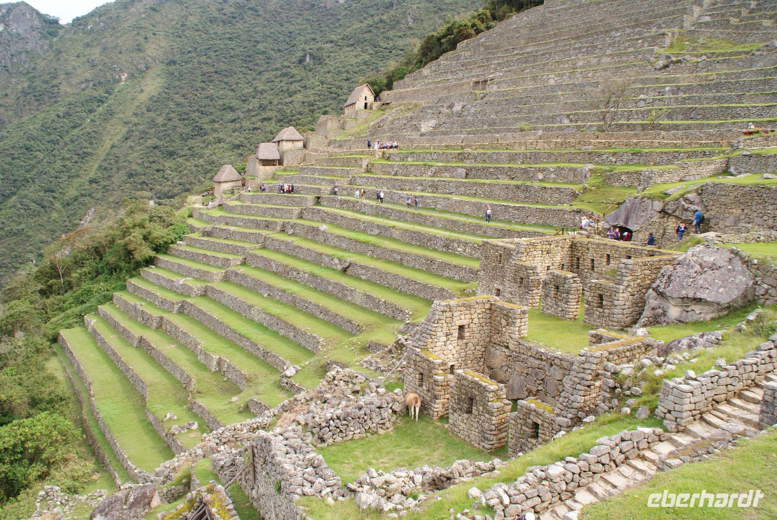 Bestens gefrühstückt verlassen wir die schöne Hazienda und fahren per Bus mit Caesar und Lucas nach Ollantaytambo, dem Bahnhof von wo aus der Perurail Zug nach Aguas Calientes fährt. Eine wunderschöne 1.5-stündige Zugfahrt führt uns malerisch durch eine grüne Schlucht, von wo wir auch immer den berühmten Inka Trail sehen. Auf diesem kann man sich einer 4-tägigen und 40 Km langen, geführten Trekking Tour zum Machu Picchu anschließen. Pünktlich kommen wir in Aguas Calientes an, gehen zu unserem Hotel El Mapi, erledigen die Formalitäten, deponieren unser Gepäck und starten zur Auffahrt zur Ruinenstadt Machu Picchu. Ein Shuttlebus bringt uns in 20 Minuten nach oben und wir stehen vor einem der größten Highlights dieser besonderen Reise. Zunächst gehen wir zu einem Aussichtspunkt und dürfen alles erst mal in Ruhe fotografieren und auf uns wirken lassen. Lucas erzählt uns ausführlich die Geschichte Machu Picchus und auch die verschiedenen Theorien, wer hier gewohnt hat und warum dieser Ort nach nur ca. 100 Jahren wieder verlassen wurde. Wir erfahren, dass die Anlage Machu Picchu alter Berg bedeutet, wobei man bei der klassischen Ansicht auf den „Wayna Picchu", den jungen Berg schaut. Die Stadt Machu Picchu wurde 1450 erbaut und umfasste in ihrer Hochzeit bis zu 1000 Bewohner. Wir spazieren durch die verschiedenen Bereiche und Häuser, sehen Versammlungs-und Opferplätze und auch Häuser, die originalgetreu wieder mit Dächern gedeckt wurden. Eine tolle Atmosphäre und es entstehen unzählige schöne Aufnahmen. Am Nachmittag kehren wir wieder per Bus nach Aguas Calientes vom beeindruckenden Ausflug zurück und nun genießt jeder nach Gusto den restlichen Nachmittag in diesem quirligen Örtchen. Ein schönes Abendessen im Hotel rundet den ereignisreichen Tag ab...