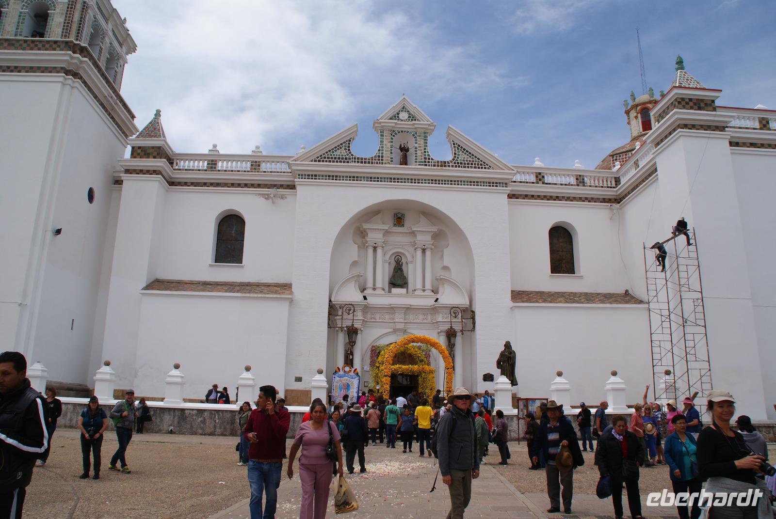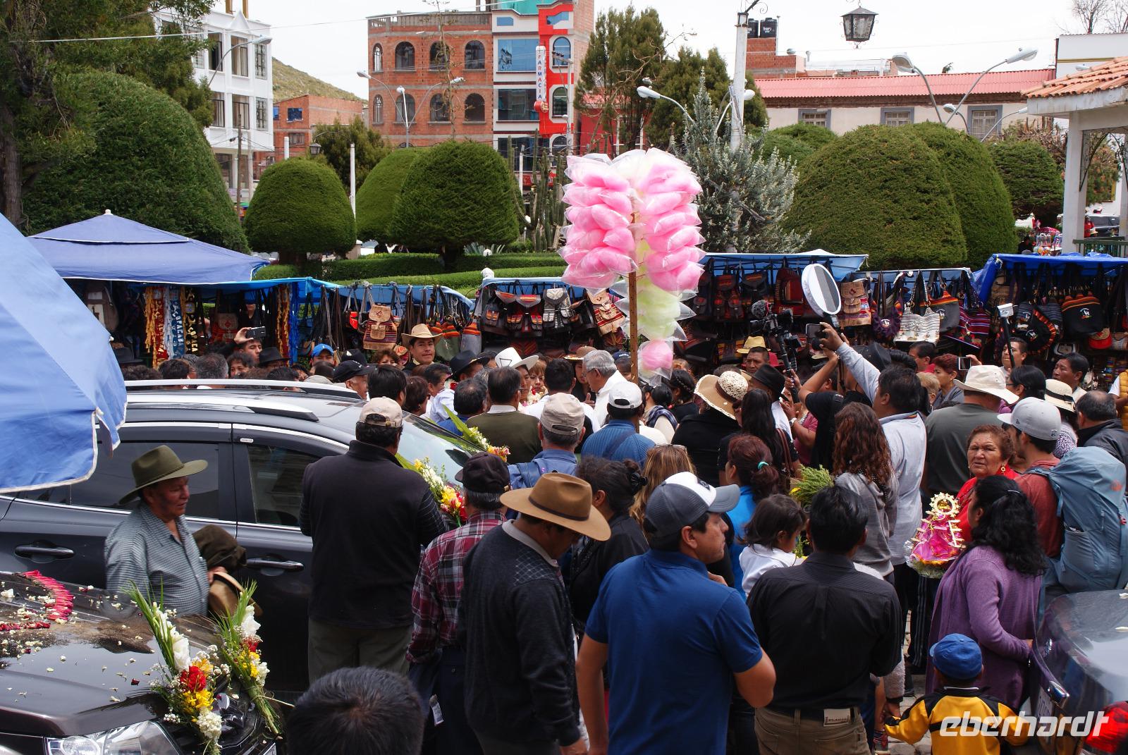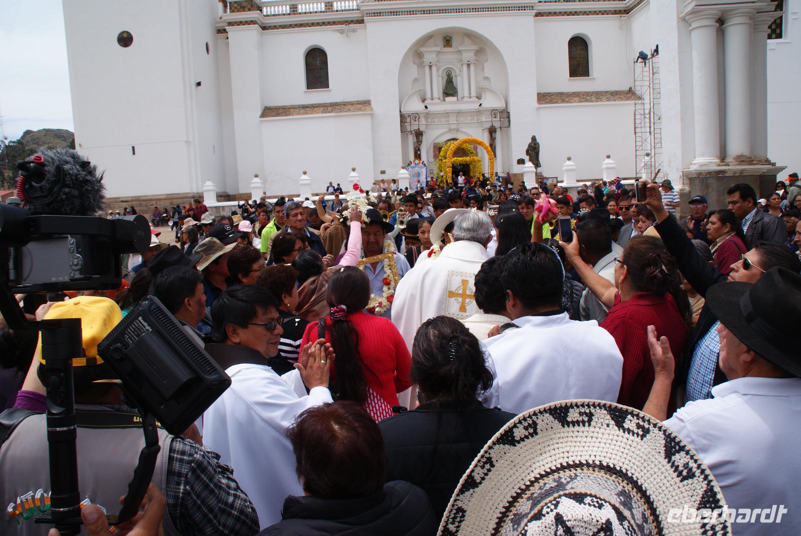 Heute frühstücken wir mit herrlichem Blick auf den Titicacasee. Bestes Wetter erwartet uns und mit unserer Reiseleiterin Inka, die uns bis zur bolivianischen Grenze bringt, starten wir in den Tag. Mit vielen interessanten Informationen versüßt uns Inka die Zeit, die uns in Peru noch bleibt. So erfahren wir, dass der Ort Puno 350 Jahre alt ist und um 1668 gegründet wurde. Heute ist Markttag und wir sehen viele Menschen, die ihre Ware zum Markt bringen oder bereits gekaufte Schafe abtransportieren. Nach alter Tradition stellt man einen Glücksbringer ins Fenster, der mit dem wichtigsten behangen, für gute Geschäfte sorgen soll. Inka berichtet, dass der Titicacasee zwischen 8-12 Grad hat und die Luft hier im Winter bis zu -10 Grad werden kann. Somit wächst hier auch nur bedingt etwas wie beispielsweise Zwiebeln, Kartoffeln, Quinoa. Puno und Umgebung ist außerdem bekannt für die Forellenzucht. Auf dem Weg zur Grenze sehen wir viele gelbe Kanister, die darauf hinweisen, dass hier auf dem Schwarzmarkt Benzin aus Bolivien verkauft wird. Wir passieren den kleinen Ort Juli, der einst als kleines Rom bekannt wurde. Leider ist heute außer 2-3 Kirchen nichts mehr vom italienischen Charme sichtbar. Wir erreichen die Grenze und reisen zu Fuß aus Peru aus und zu Fuß in Bolivien ein. Unser Gepäck reist per Handkarren mit uns und in Bolivien angekommen werden wir von unserem neuen Reiseleiter Martin herzlich empfangen. Unser erstes Ziel im neuen Land ist der Ort Copacabana, wo wir die berühmte Kirche ansteuern. Wir staunen nicht schlecht, welch Spektakel uns empfängt. Genau zur richtigen Zeit verlässt eine Gruppe die Kirche, wird mit lauter Musik und Böllern begleitet, wir mittendrin. Ein Spaziergang durch den Ort und bald darauf fahren wir per Boot zur Sonneninsel, wo wir in einem Eco Resort zu Mittag erwartet werden. Vorab müssen wir jedoch die alten Inkatreppen nach oben und wir sind mal wieder ziemlich außer Puste. Nach dem idyllischen Aufenthalt geht unsere Reise weiter zur Mondinsel, wo ein Besuch des Jungfrauentempels erfolgt. Das nächste Highlight sollte folgen und unser Programm führt uns zu den Urus, den schwimmenden Inseln mit dessen Bewohnern. Ein beeindruckender Aufenthalt bei diesen besonderen Menschen und deren Lebensweise. Im Hotel angekommen ziehen die meisten von uns nochmals mit Reiseleiter Martin zu den verschiedenen Museen, die uns hier umgeben. Nach einem absolut erlebnisreichen Tag sehen wir uns beim Abendessen im Hotel und Live Musik wieder.