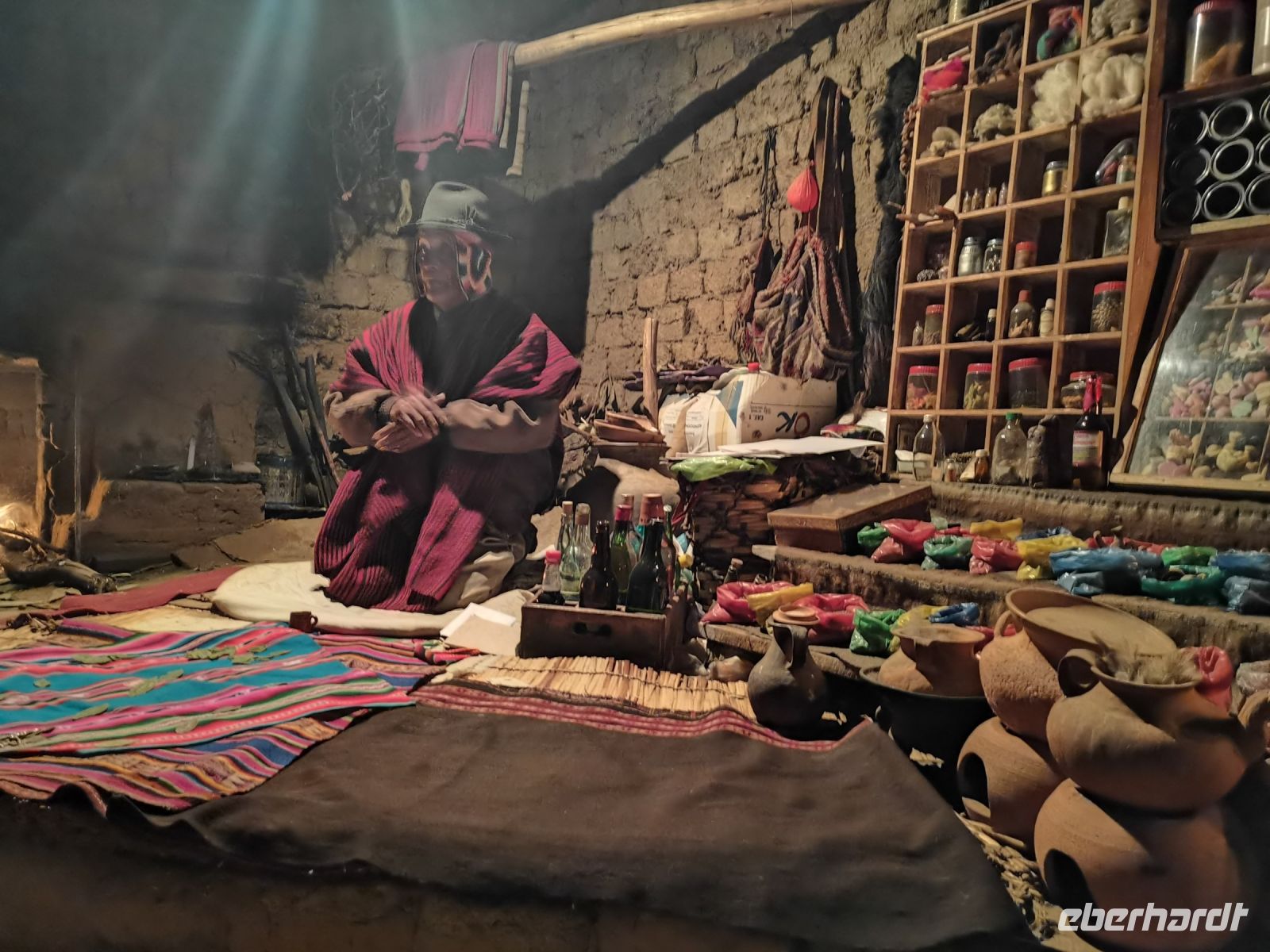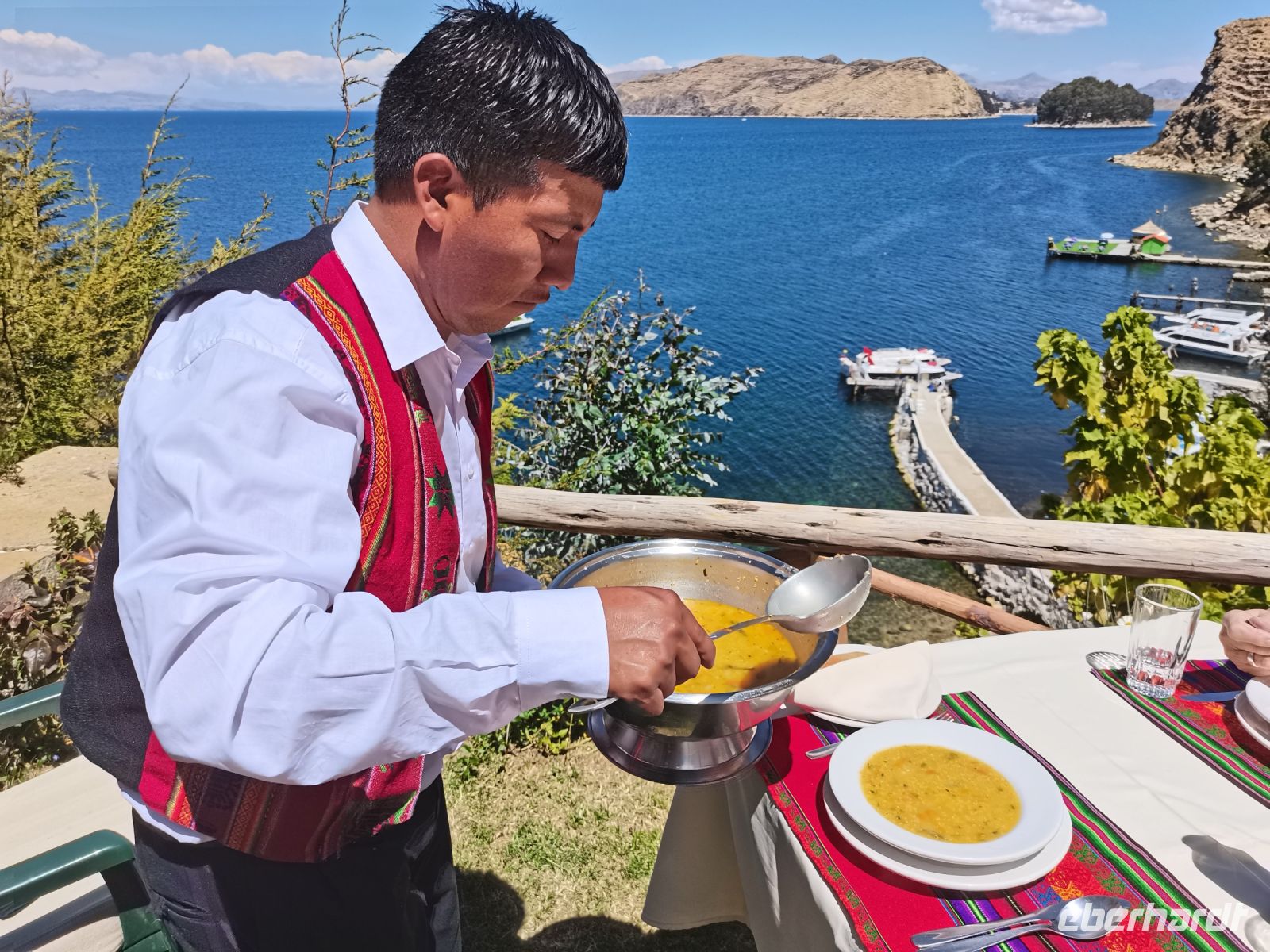 Die Sonne scheint schon morgens am rund 3810 Meter hohen Titicaca-See, dem Meer der Anden, und höchstgelegenen schiffbaren Gewässer der Welt. Hier soll die Hochkultur der Anden entstanden sein. Den See teilen sich Perú und Bolivien. Unser neuer Reiseleiter holt uns im Hotel ab, um uns zur Grenze nach Bolivien zu bringen, wo wir noch einen weiteren Tag am Titicaca-See verbringen werden. Mit seiner herzlichen Art erzählt er uns auf der zweieinhalbstündigen Fahrt herrliche Geschichten über die Lebensart der indigenen Aymaras, die hier oben in den Anden leben. Wir fahren vorbei an Vieh- und Lebensmittelmärkten, auf denen noch Tauschhandel betrieben wird. Heizung gibt es hier nicht, nicht nur daher erklärt sich die Vielzahl der Röcke, die die Frauen zu ihren Melonen-Hüten tragen. Mehr Details kann ich an dieser Stelle nicht verraten, man muss die spannenden Geschichten von unserem Reiseleiter einfach selbst gehört haben. Nach der kurzweiligen Fahrt überqueren wir die Grenze zu Fuß. Ein bolivianischer Reiseleiter empfängt uns in den Wallfahrtsort Copacabana am Ufer des Sees. Sofort sind wir übermannt von den bunten Farben, Traditionen und der lebendigen Stimmung. Wir besuchen einen Markt und probieren einige typische Produkte. Viele Arten Quinoa, unzählige Kartoffelsorten, Mais und Saubohnen stammen aus den Anden. Nach der kurzen Besichtigung der Kathedrale, in der gerade eine Messe stattfindet, begeben wir uns zum Tragflügelboot, das uns über den See zur Sonnen- und Mondinsel bringt. Der Wellengang ist trotz Sonnenschein heute sehr hoch, weshalb wir den Besuch der schwimmenden Insel der Uru auf den nächsten Tag verschieben. Wir fahren mit dem Boot direkt nach Huatajata. Nach dem Check-In können wir das Eco-Dorf um unser Hotel besuchen. Das Museum hält Informationen über die indigenen Kulturen und eine Ausstellung bereit. Wir sehen einen Film über die Heiler aus Huatajata und dürfen anschließend bei einer Zeremonie mit dem Schamanen des Ortes Fragen an das Orakel stellen. Den erlebnisreichen Tag schließen wir mit einem Abendessen im Hotel ab.