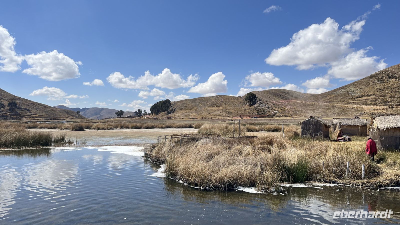 Cusco verschwand nach und nach in der Ferne, es folgten Weiden und Weiler, bis wir tiefer ins Altiplano kamen und diese seltener wurden. Das Programm sah lange Strecken mit dem Bus vor, landschaftlich sehr schön, das muss ich sagen. Die technischen Pausen, entweder für Fotos von schönen Bergen und riesigen Ebenen, die wir uns nicht entgehen lassen konnten, wechselten sich ab mit einem besonderen Besuch der einzigartigen Kirche von "Andahuaylillas" und den Ruinen von "Raqchi" oder dem Verkauf von Kunsthandwerk. Bereits in der Abenddämmerung kamen wir in Puno an, das voller Bewegung und Geschäftigkeit schien, mit den typischen Bewegungen der Arbeiter, die nach Hause gehen und anderen, die ihren Arbeitstag erst zu beginnen scheinen. Unzählige Fahrzeuge und das riesige bevölkerte Gebiet wirkte wie ein Spektakel als wir aus den ruhigen Bergen kamen. Allmählich nahm die Hektik ab, und wir näherten uns unserem Hotel am Ufer des Sees, wo wir uns ausruhen und neue Kraft für den bevorstehenden Tag schöpfen konnten.