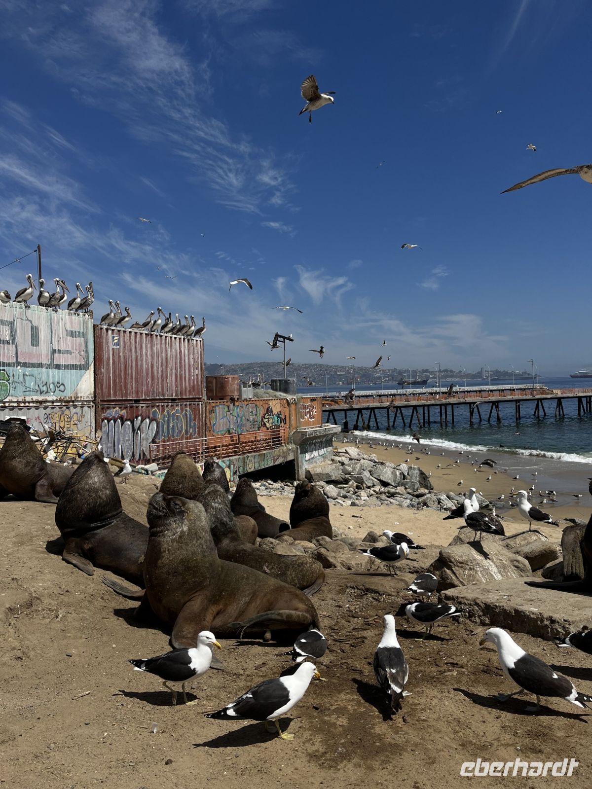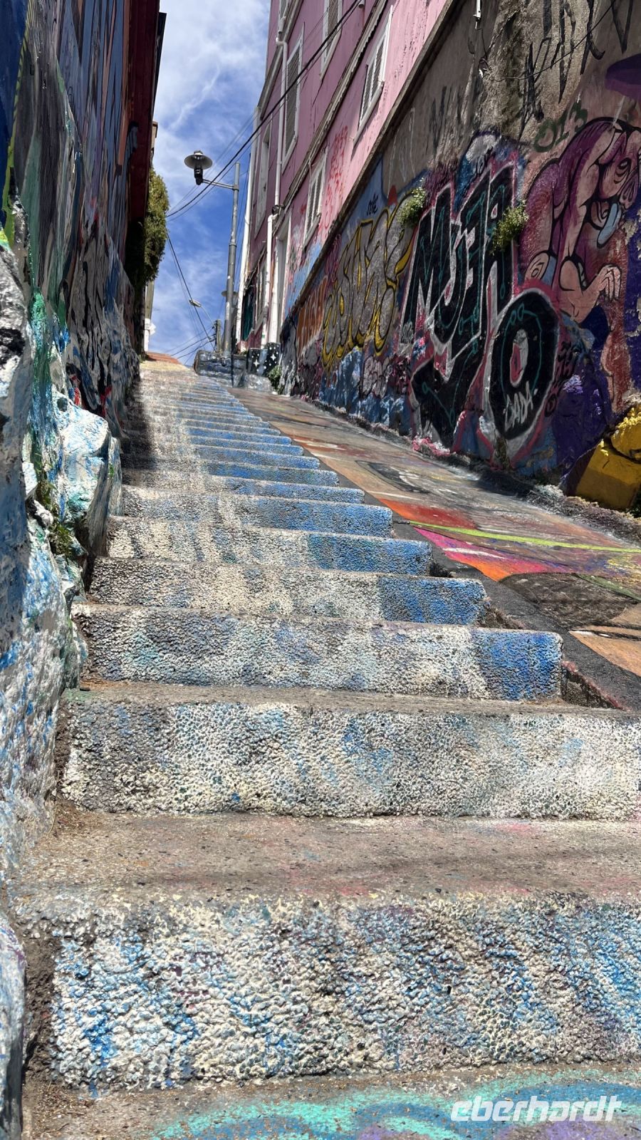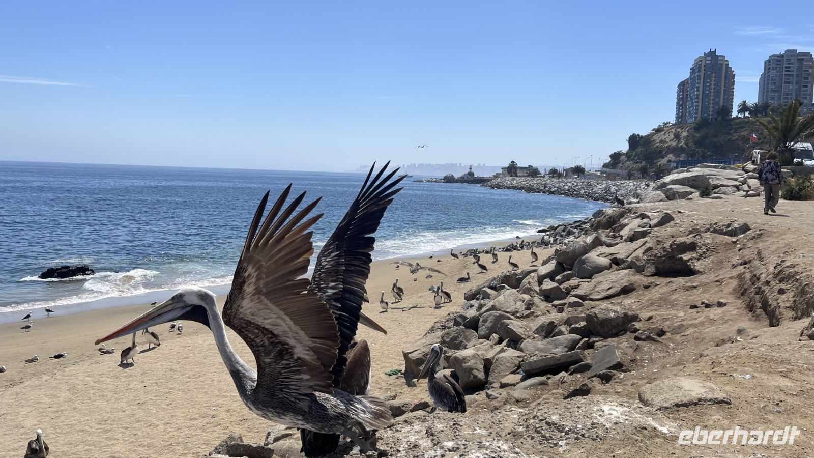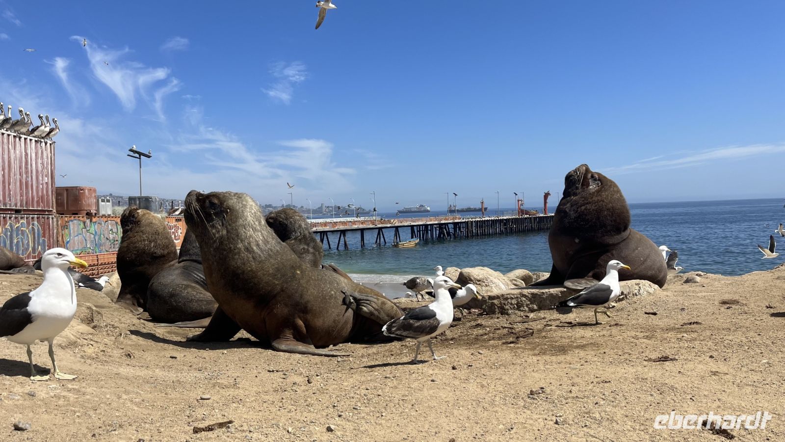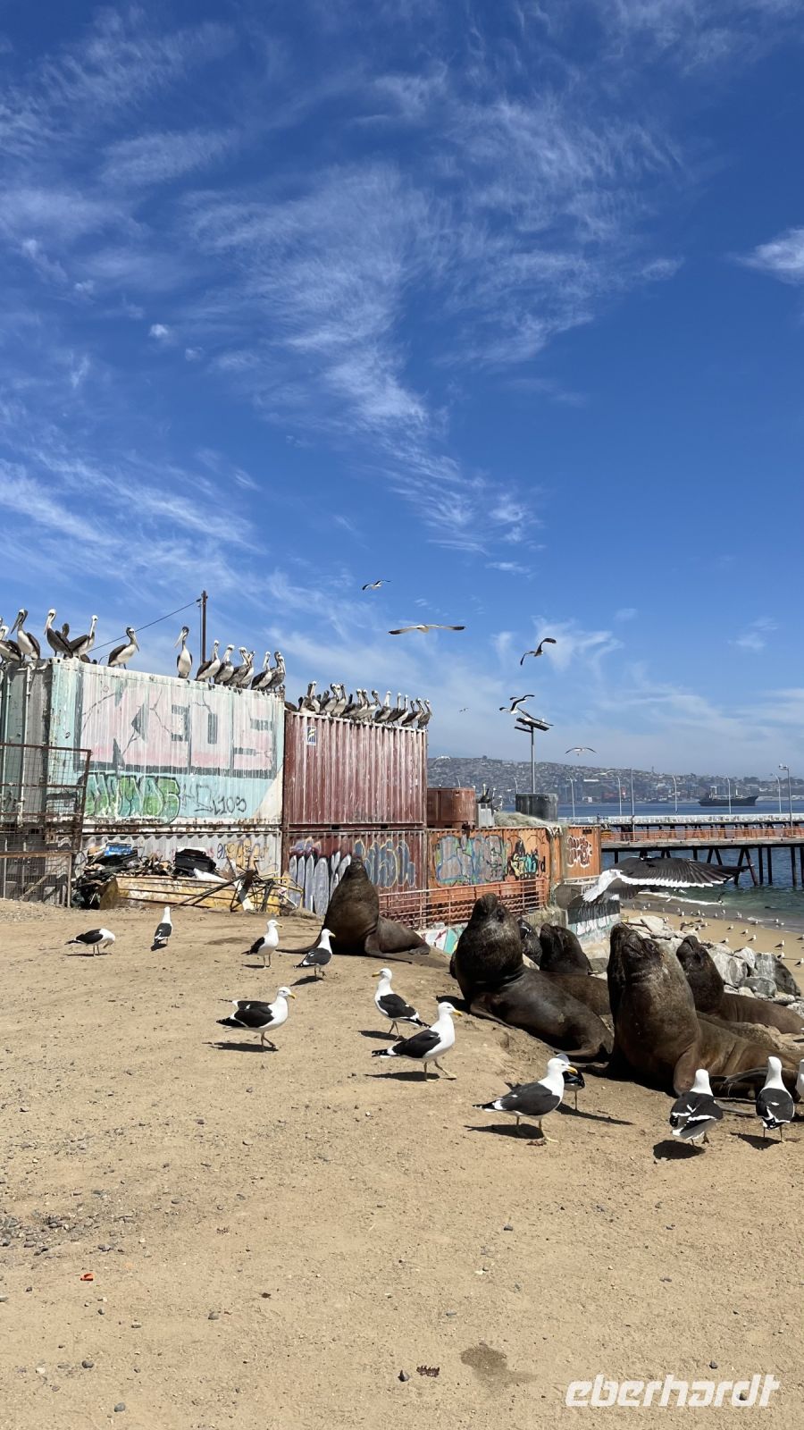 Nach einer kurzen Beratung in der Gruppe einigten wir uns auf einige Änderungen für den Tag, immer unter der Leitung unserer sehr freundlichen und zuvorkommenden örtlichen Führerin. Zunächst besuchten wir "La Quinta Vergara", einen wunderschönen Palast mit herrlichen Gärten und einem großen Amphitheater, das in Lateinamerika für die Ausrichtung eines großen Musikfestivals bekannt ist. Danach bummelten wir zum Strand, den nahe gelegenen Pier entlang und fuhren dann zum Fischerpier, wo wir eine große Anzahl von Seelöwen und Pelikanen beobachten konnten, die sich am Strand drängten. Ihre Größe und Anzahl ist wirklich beeindruckend. Das war nur ein Zwischenstopp, denn wir hatten noch eine weitere Station in unserem neuen Plan. Ein Ausflug in die Umgebung von "Cerro Concepción", einem malerischen Ort der Boheme, mit seiner ganz besonderen Art für Restaurationen und einem großen gastronomischen und künstlerischen Angebot. Das Ende unseres Besuchs in Valparaiso nahte, und kurz darauf machten wir uns auf den Rückweg nach Santiago.