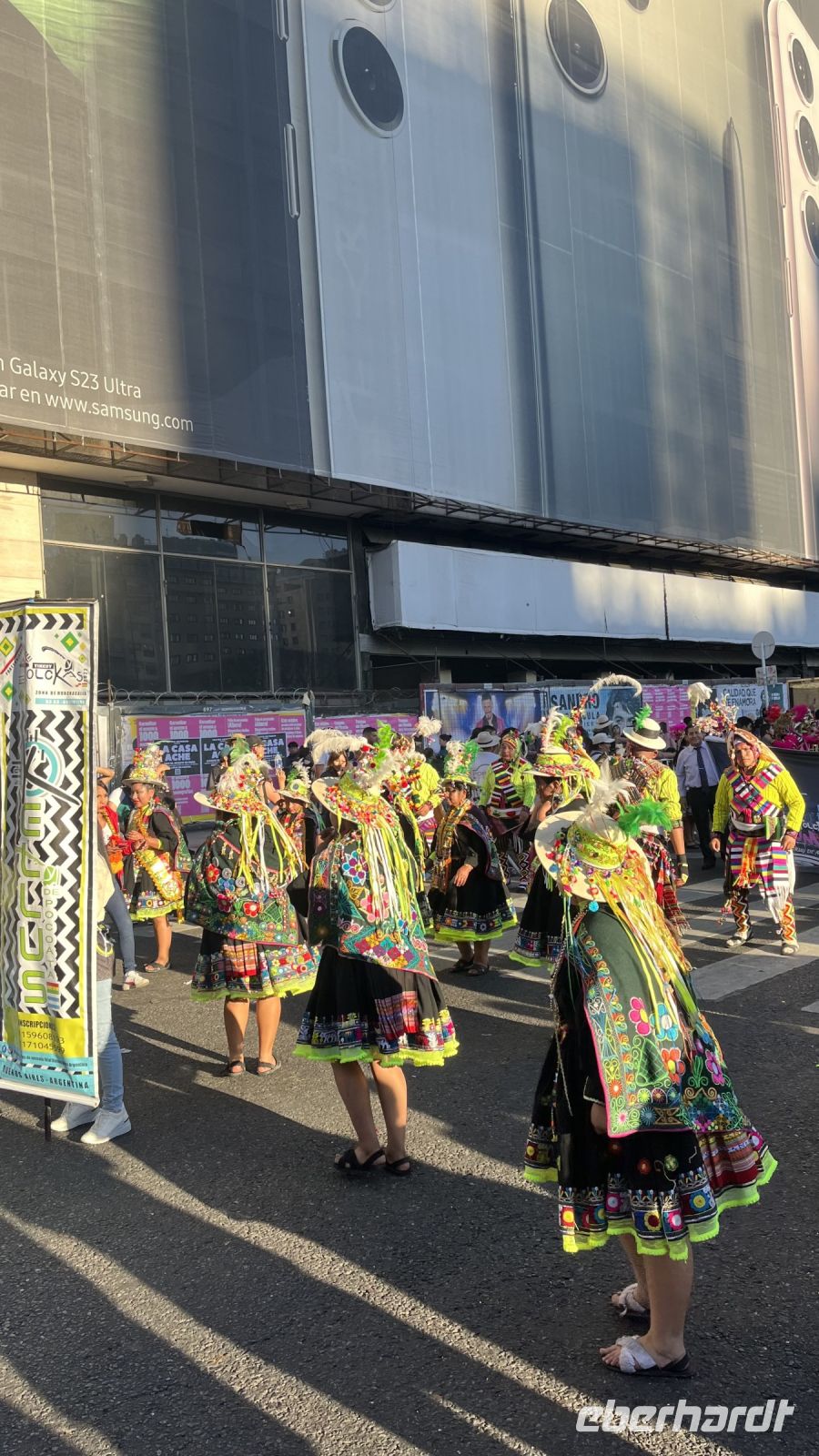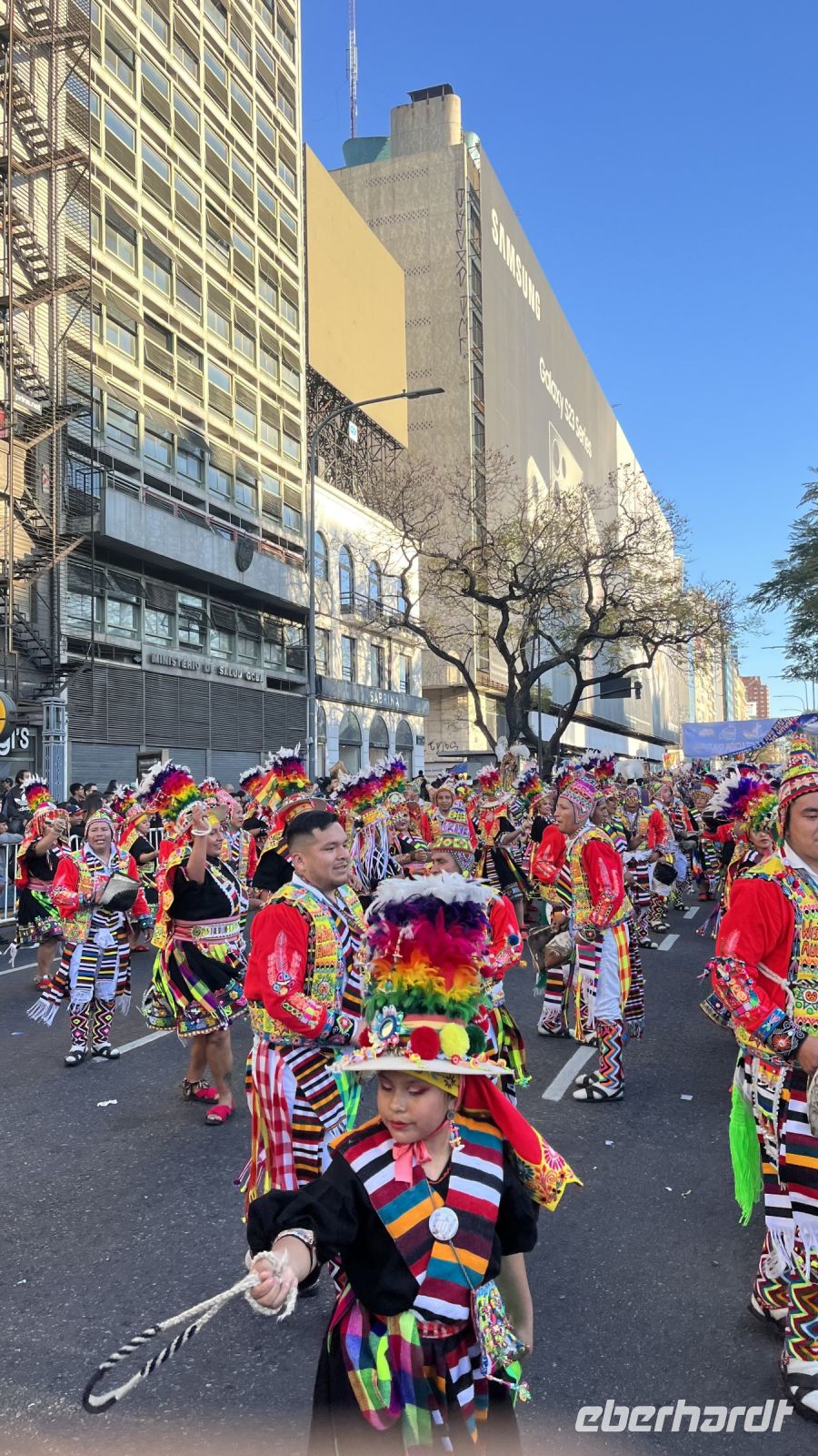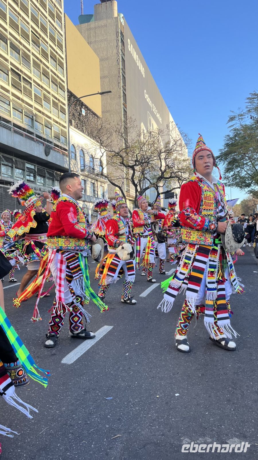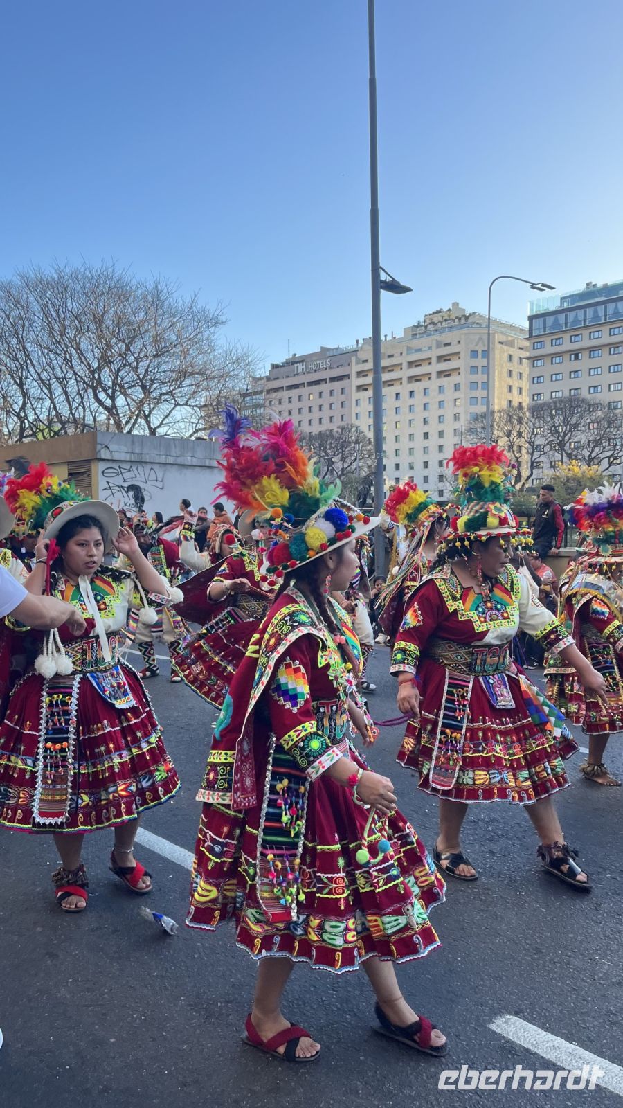 Wir flogen über die Anden, großartige Aussichten, manchmal konnte man die Berge so nah spüren, konnte Details im Gelände erkennen, was den Überflug noch interessanter macht. Wir kamen in "Buenos Aires" an! Alles verlief normal, bis die Gleise auf dem Weg zum Hotel gesperrt wurden. Irgendetwas geschah, was es uns schwer machte, dorthin zu gelangen. Und zu unserer Überraschung fand direkt vor der Tür des Hotels ein riesiger Karneval statt. Die ganze Straße und die umliegenden Straßen waren aus diesem Grund gesperrt. Wir beeilten uns, unser Gepäck abzustellen und machten uns umgehend auf den Weg, um an diesem Fest teilzunehmen. Mitten im Getümmel kehrten wir in der Abenddämmerung ins Hotel zurück, um uns für das Abendessen fertig zu machen. Wir kehrten sehr zufrieden mit den weltberühmten argentinischen Steaks zurück und waren froh, schlafen zu können, nachdem wir befürchtet hatten, dass sich die Musik auf den Straßen auch bis in die frühen Morgenstunden hinziehen würde.