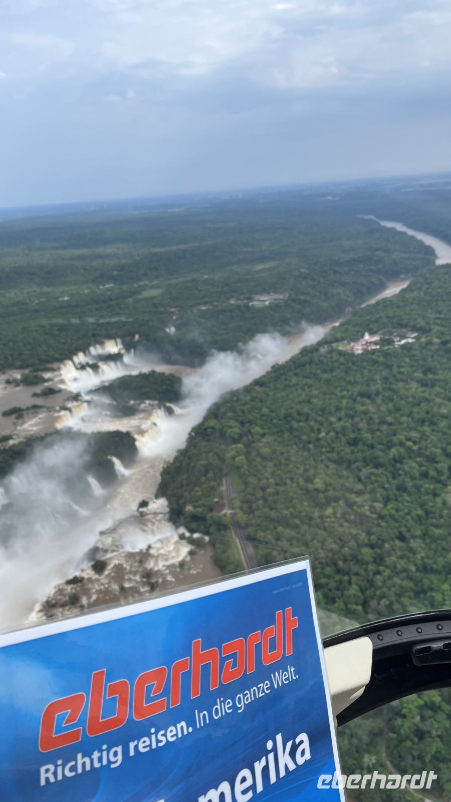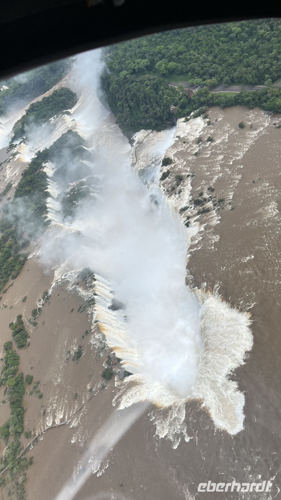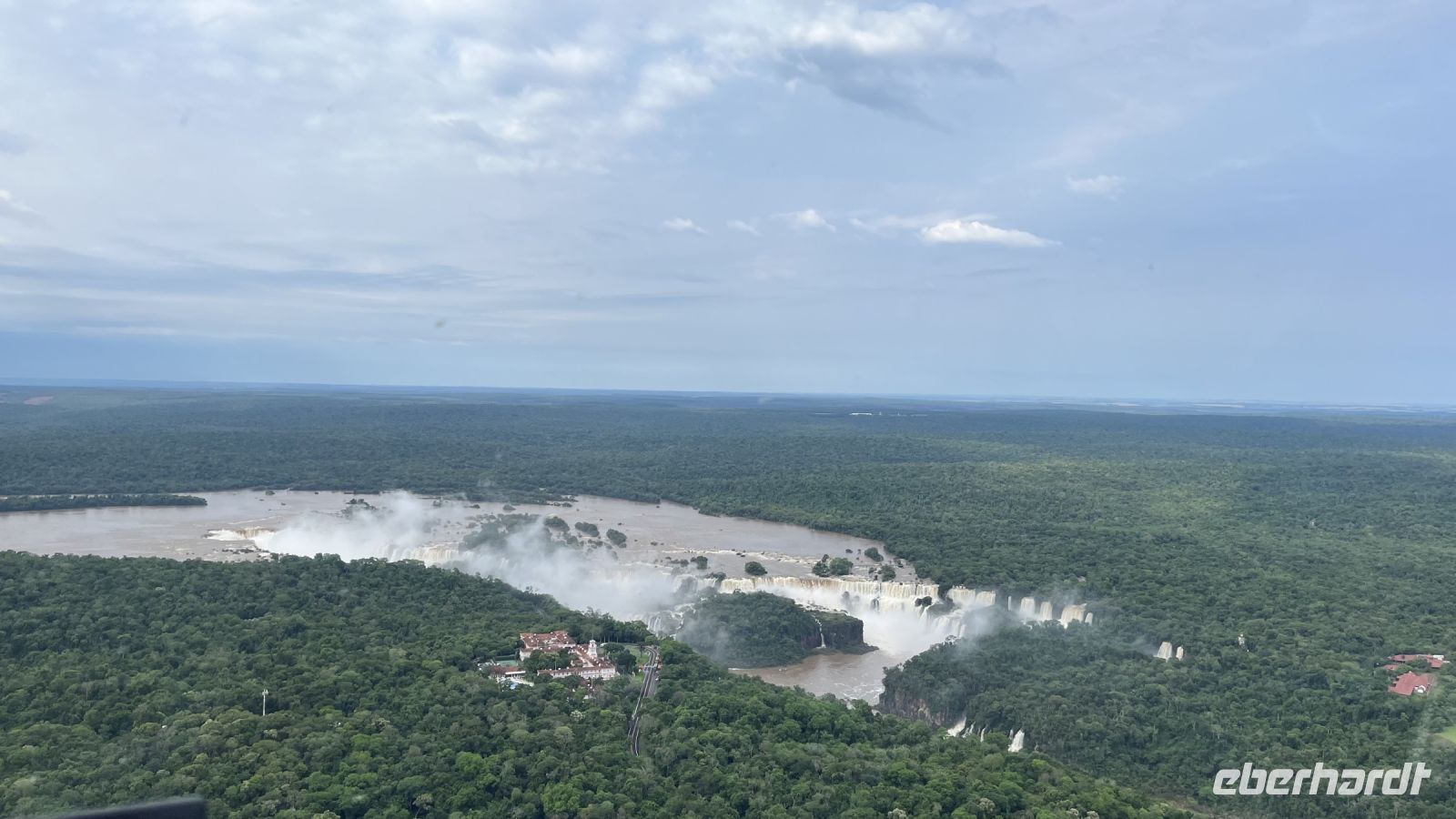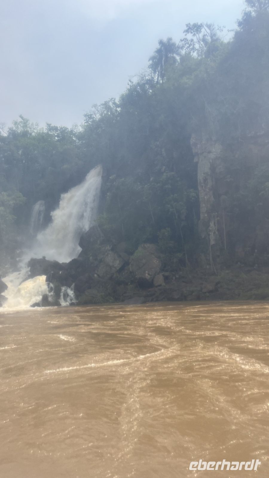 Wenn ich diesen Tag in irgendeiner Weise beschreiben könnte, wäre es eine Mischung aus wildem Adrenalin, Ehrfurcht und Freude. Der erste Halt des Tages war der Hubschrauberlandeplatz. Von dort aus flogen wir über den Dschungel, bis wir uns diesem riesigen, 3 km langen Wasserfall näherten, der komplett mit Wasser gefüllt war und sich in seinem 80 Meter hohen Fall wütend brach. Was für eine Aussicht! Eine großartige Perspektive auf dieses Naturjuwel, die den Preis für den Flug auf jeden Fall wert ist. Gut gelaunt machten wir uns auf den Weg, um diese Pracht von der brasilianischen Seite aus näher zu betrachten. Plattformen, Brücken und Wege, die erstaunlich nahe an die Wasserfälle herankommen, die so ungestüm sind, dass der Wassernebel über ihre Nähe hinausreicht und alles wie der mächtigste Regen benetzt. Eine Fotoszene folgt auf eine Erinnerungsszene, und so ging unsere Reise den ganzen Vormittag weiter. Am Nachmittag sollte das Adrenalin den Hauptgang bilden, denn unsere Bootsfahrt war ein wirkliches Abenteuer. Wir vergaßen also jede Versicherung und jedes Unglück und stiegen in die ersten Reihen eines kleinen Bootes mit starkem Motor, das zwischen den Flusskämmen fast schwebte, dem weißen Rauschen entgegen, das plötzlich alles einhüllte. Mit dem Herzen in den Händen und immer noch schreiend vor Ekstase hätten wir gerne noch ein paar Runden gedreht, aber es war Zeit, zum Hotel zurückzukehren.