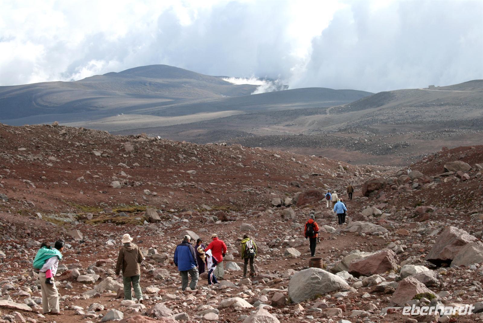 Es wurde immer kälter und wir sichteten die ersten Vicunas, die zur Familie der Kamele gehören. Wir stiegen an der 1. Schutzhütte auf sage und schreibe 4.800 Metern Höhe aus. Jetzt sollte ein weiterer Höhepunkt der Reise folgen: Die Besteigung des Chimborazo, dem höchsten Berg Ecuadors, bis auf 5.000 Meter Höhe. Wenn man öfter trinkt und immer mal anhält, ist es kein Problem, den Berg bis zur 2. Schutzhütte zu bezwingen. Alle haben es geschafft! Und fielen sich erschöpft und glücklich in die Arme.