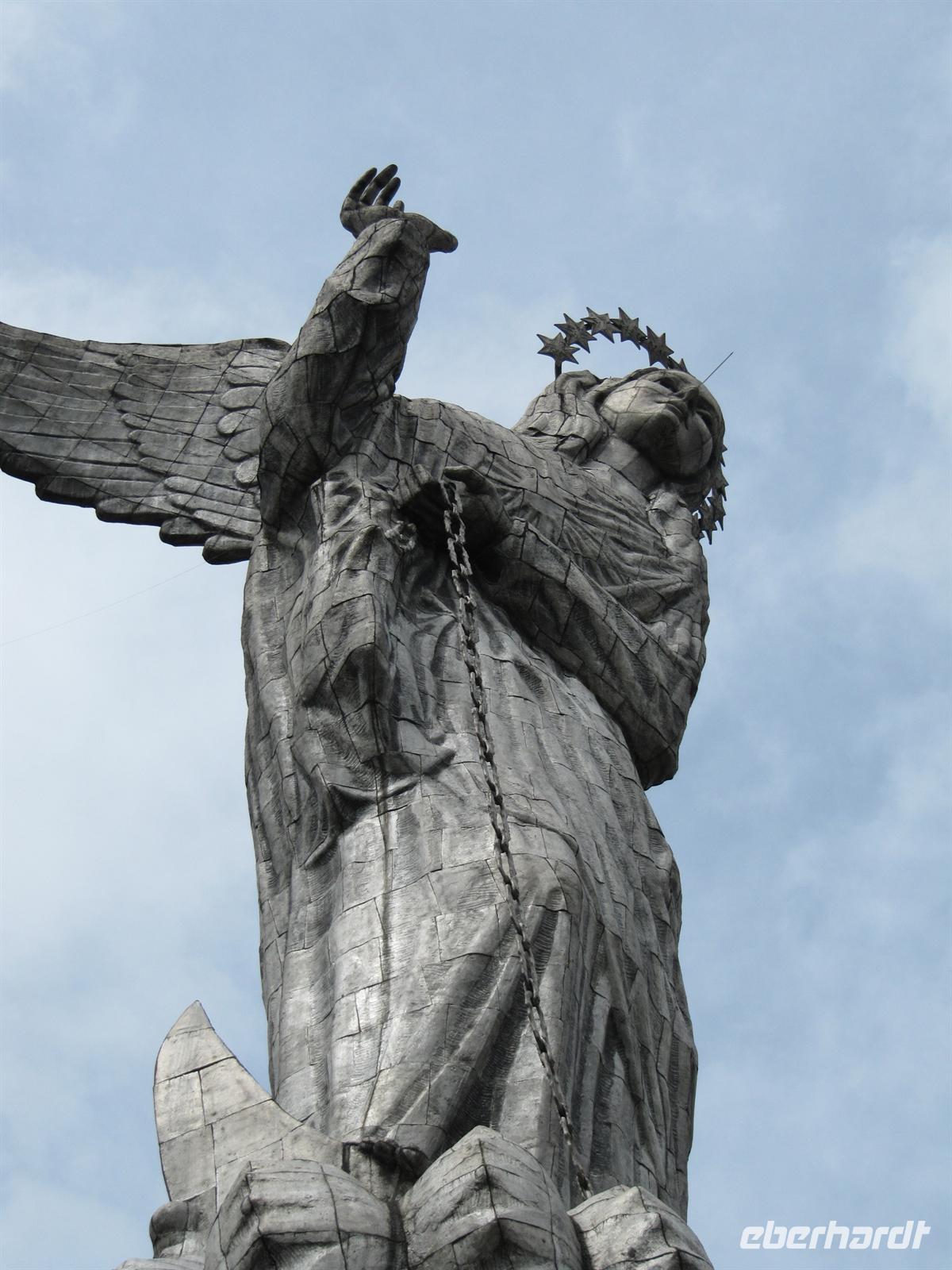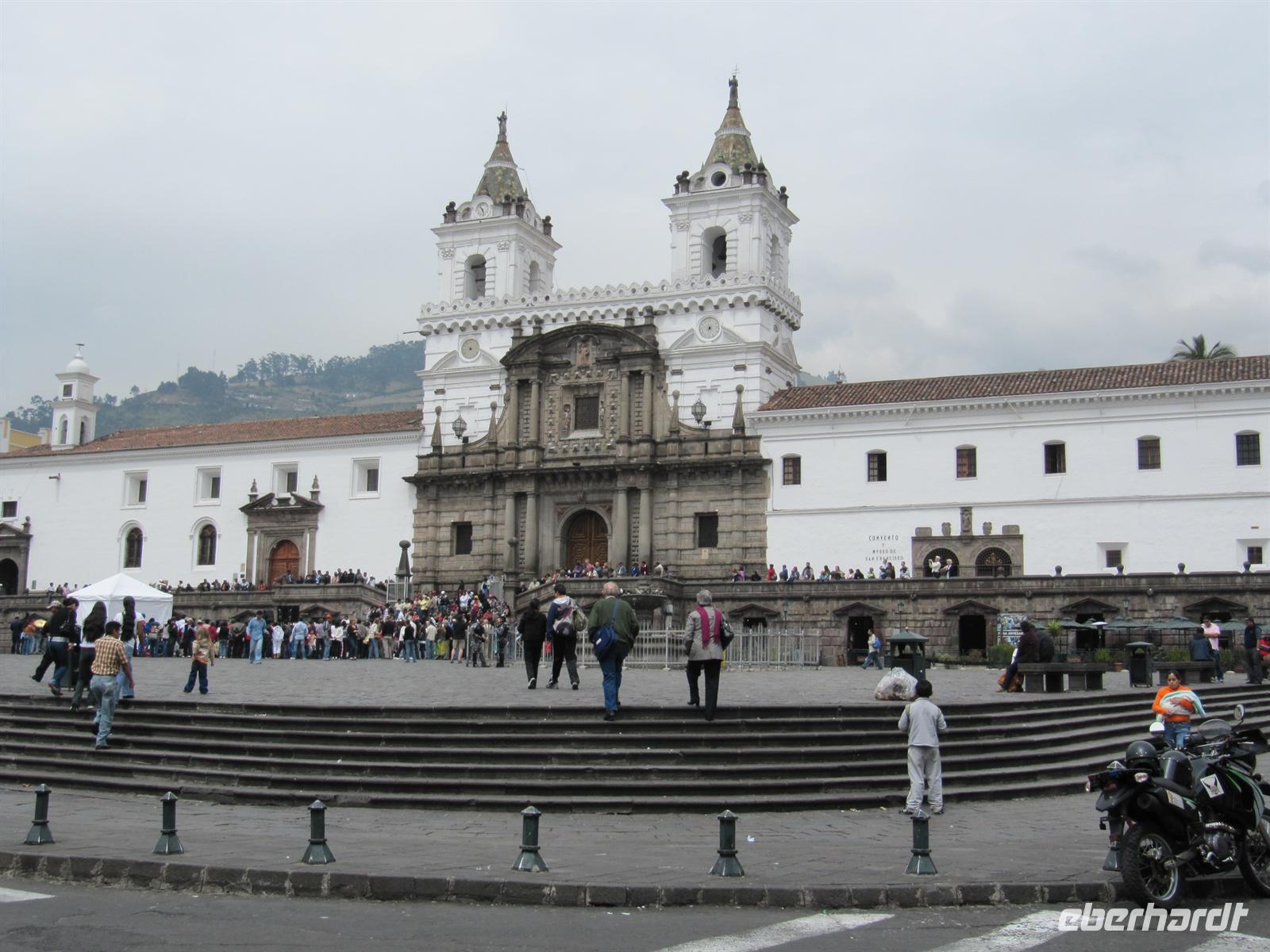Am nächsten Morgen trafen wir 8.00 Uhr unseren Reiseleiter Richard. Er hat deutsche Vorfahren, ist in Ecuador aufgewachsen, in Quito in die deutsche Schule gegangen und lebt seit seiner Kindheit in Ecuador. Seinen Stolz auf das Land hat er uns immer wieder gezeigt und es war spannend, seinen Erzählungen zu lauschen. Zunächst fuhren wir auf den Vulkankegel „El Panecillo“, der hoch über der Altstadt von Quito thront. Dessen Spitze ziert die Statue der Virgen de Quito. Die überdimensionale Engels- oder Marienfigur ist ein Wahrzeichen der Stadt. Von deren Fuß bietet sich ein atemberaubender Blick über die Millionenstadt. Nun fuhren wir mit dem Bus wieder in die Altstadt. Am Plaza San Francisco vor der imposanten gleichnamigen Kirche verließen wir unseren Bus und bummelten nun zu Fuß durch die quirligen Gassen. Immer wieder gab es viel zu sehen wie Otavalo-Indianer, die ihre Bilder oder ihre Webarbeiten anboten, oder viele Straßenmusikanten. Unser Weg führte uns zum Präsidentenpalast und zum Plaza Grande. Am Sonntag ist die Altstadt autofrei und auf vielen Plätzen traten Folkloregruppen auf. Die fröhliche lebenslustige Musik und die knallbunten Kostüme zogen uns unweigerlich in ihren Bann und wir ließen uns gern zum Mitmachen animieren. Diese Musik strahlt wirkliche Lebensfreude aus. Überhaupt sind die Ecuadorianer sehr freundliche und offene Menschen.