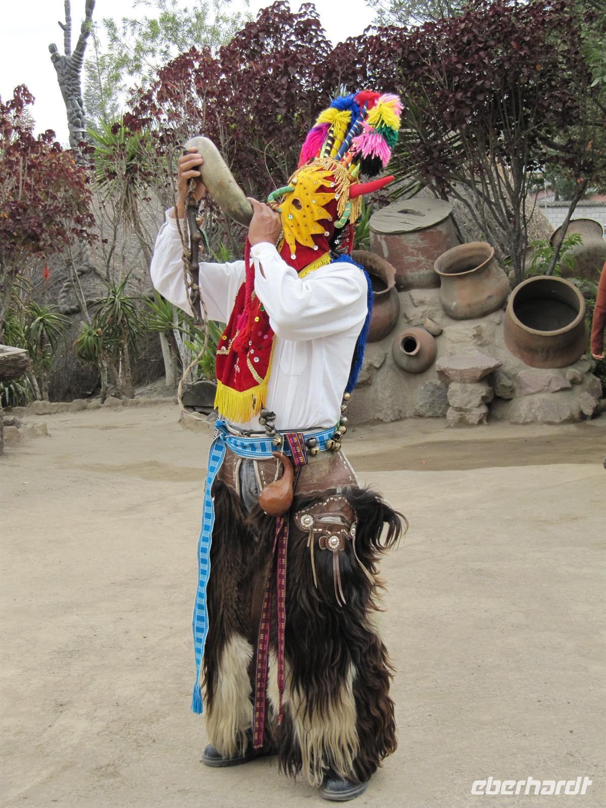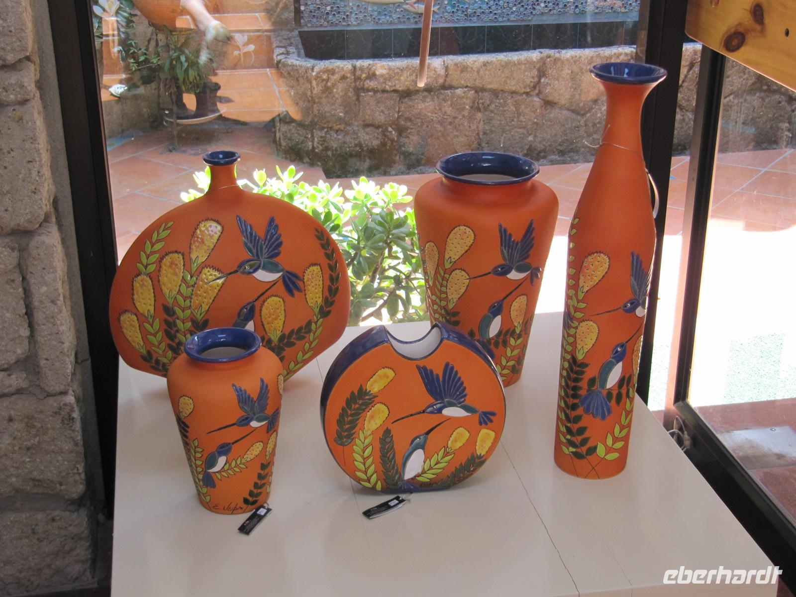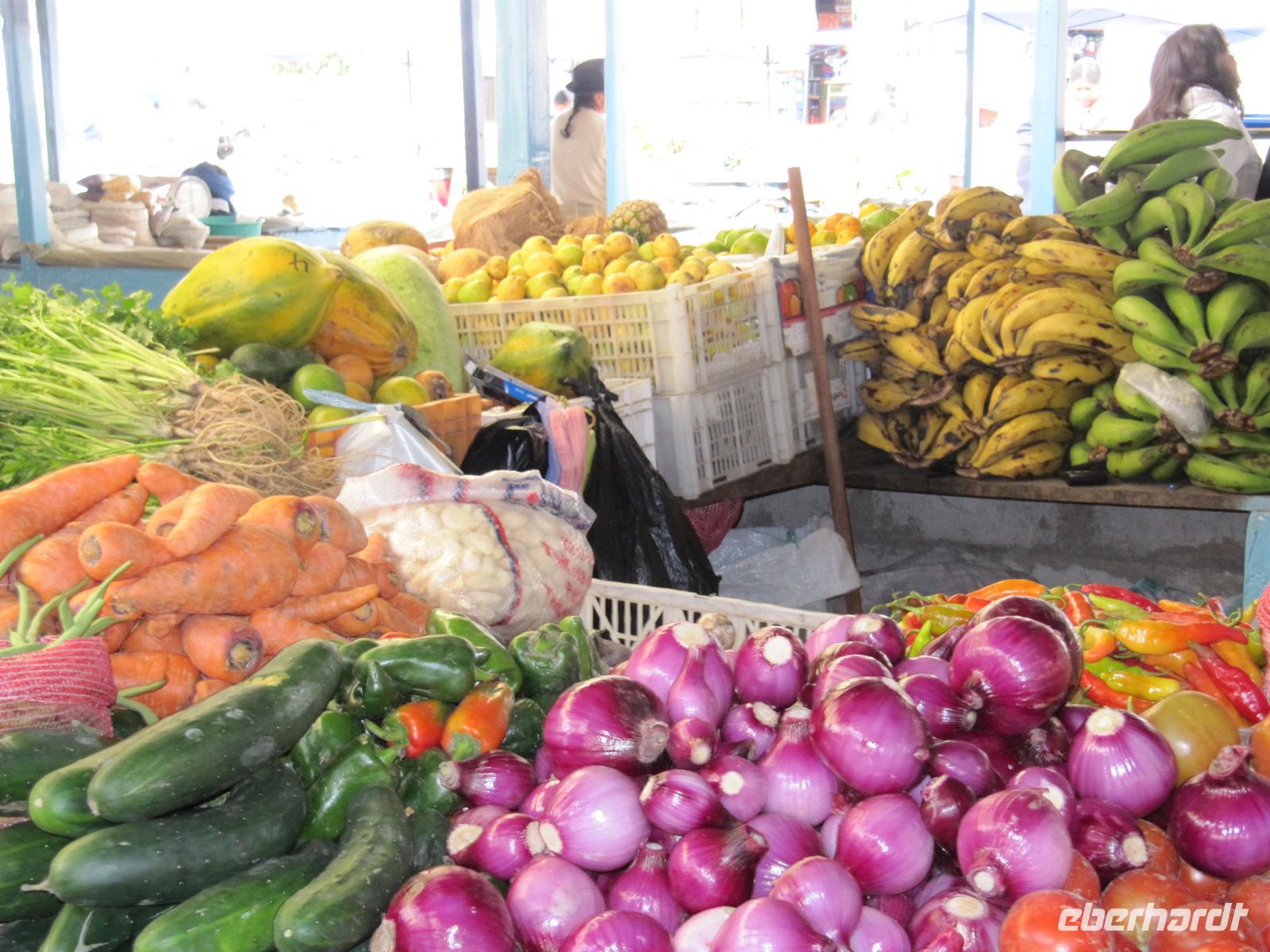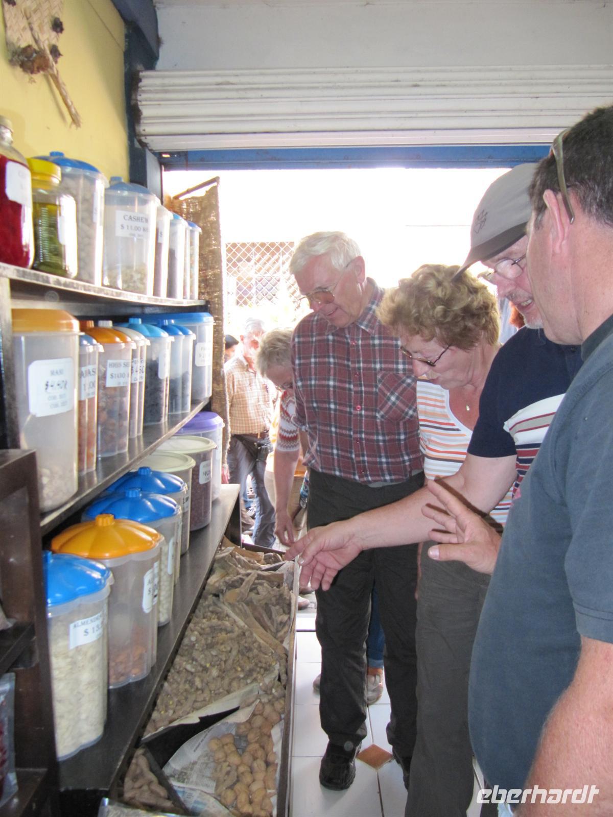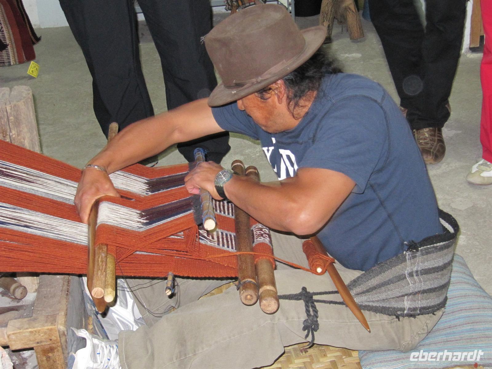Richard holte uns 7.00 Uhr vom Hotel ab und wir fuhren gen Norden zunächst nach Caldoron. Hier schauten wir einer geschickten Künstlerin zu, wie sie aus Salzteig filigrane kleine Kunstwerke zauberte. Wir überquerten nochmals den Äquator und stoßen mit Äquatorlikör an. Richard und ich übereichten jedem ein Eberhardt-Äquator-Diplom. Die Panamericana führt uns nach Otavalo. Wir besuchten den Lebensmittel-Markt, wo uns Richard viele exotische Früchte zeigte, und den Markt der Indios mit den bunten Textilien. Die Otavalo-Indios sind bekannt für ihre farbenfrohen Webarbeiten. In einer Weberei lernten wir, wir Wolle natürlich gefärbt wird und wie daraus Decken, Jacken, Ponchos und viele andere nützliche Dinge entstehen.