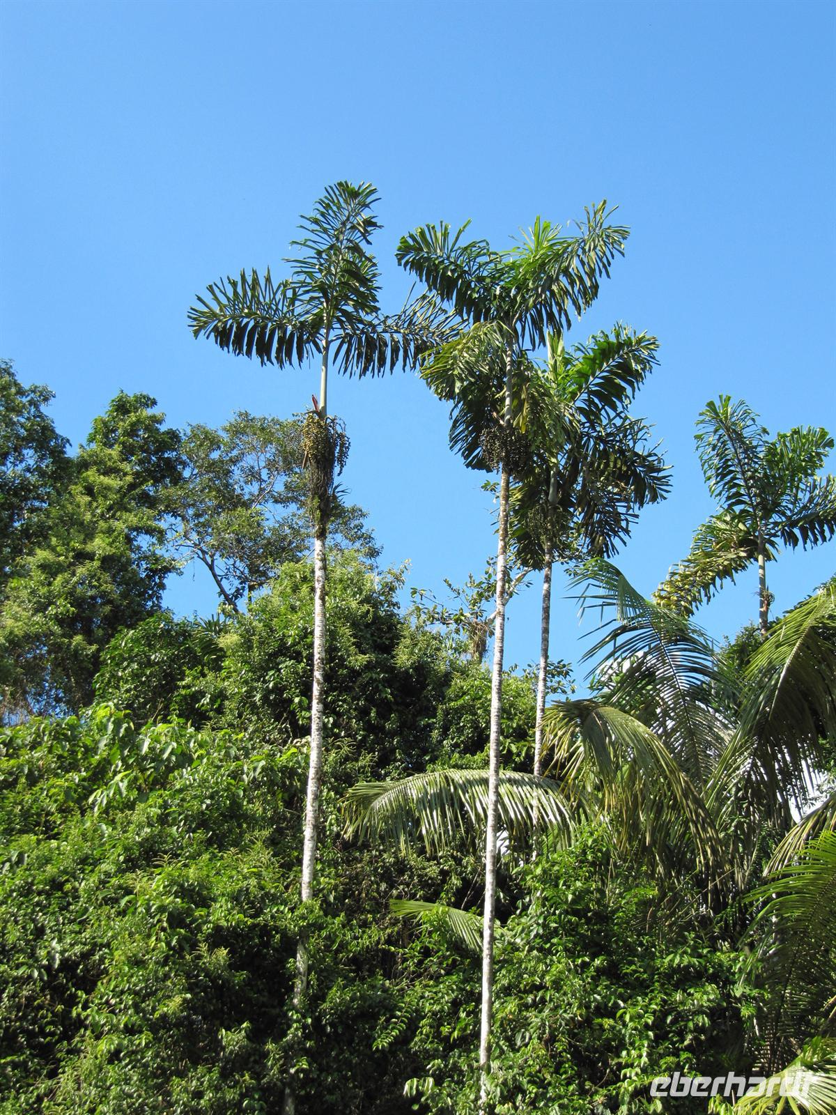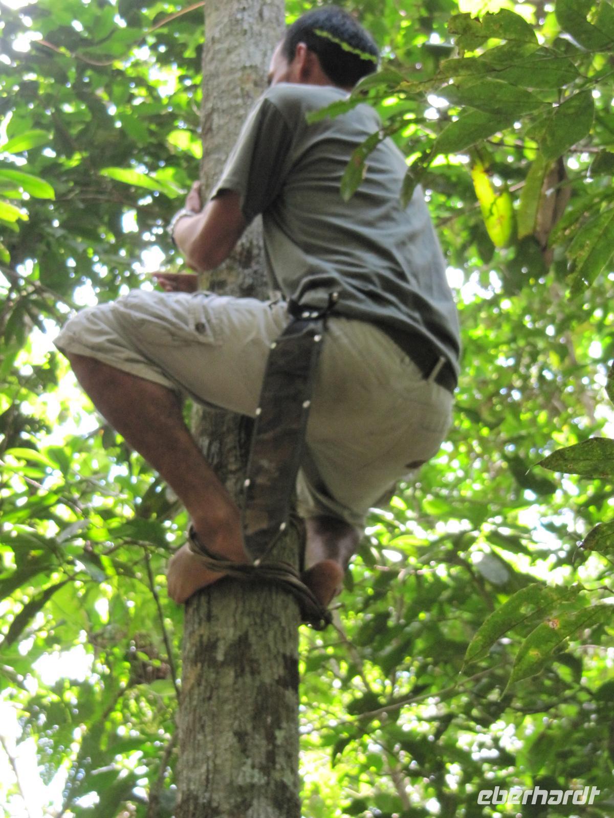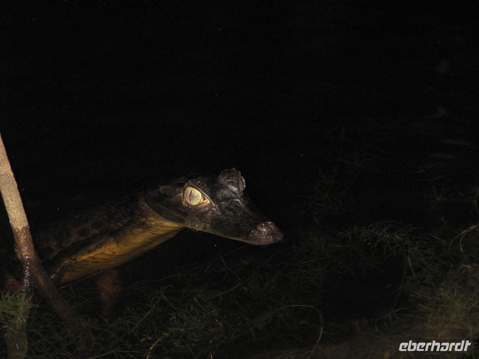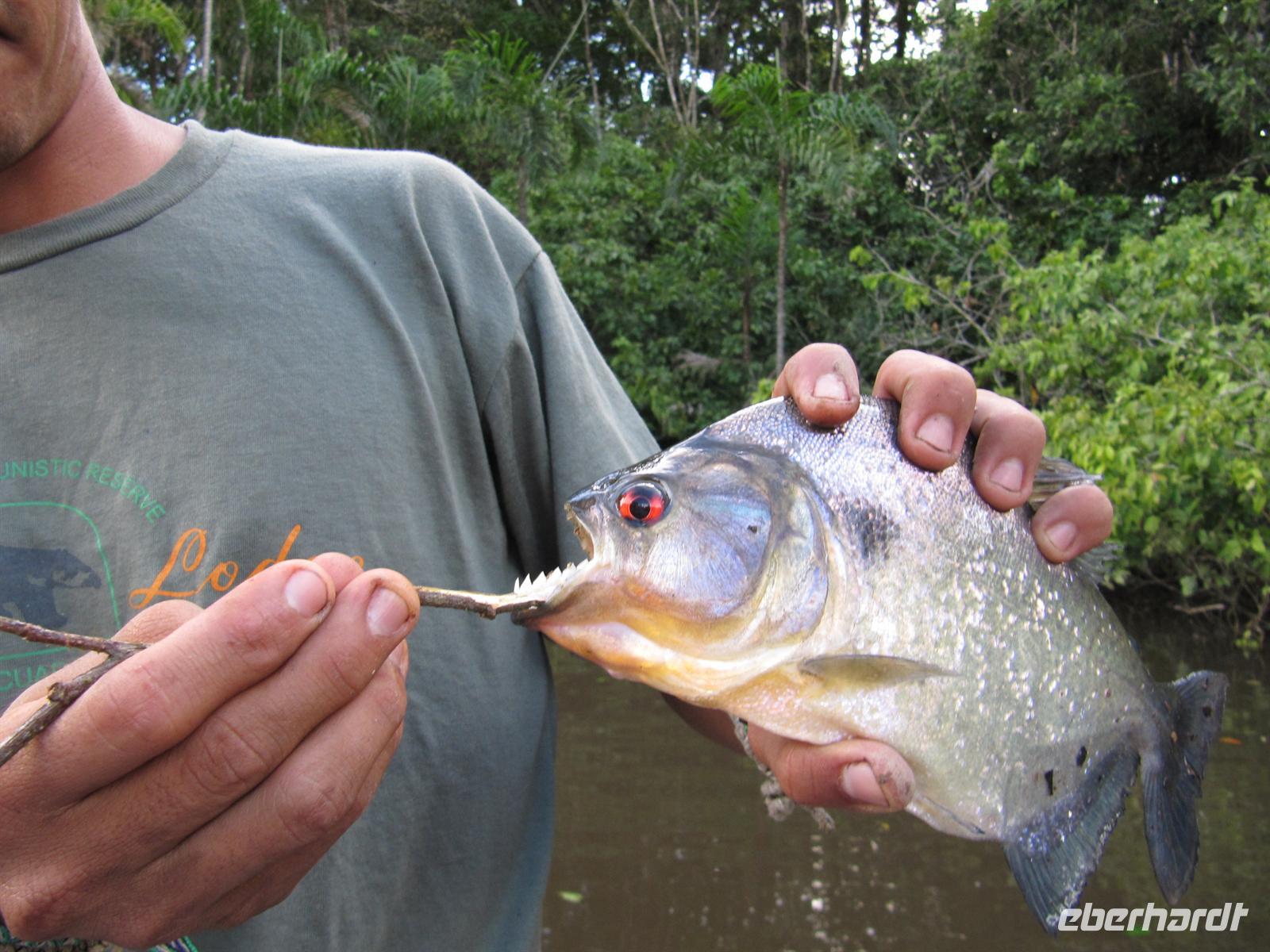 Am nächsten Morgen war die Nacht für alle unfreiwillig schon recht zeitig zu Ende, denn die Zikaden wollten uns unbedingt vorführen, dass sie perfekt die Geräusche von Kreissägen erzeugen können. Aber das tolle Wetter lockte uns sowieso aus den Betten. Nach dem fantastischen Frühstück mit frischen Früchten, Rührei, Käse und selbst gemachter Marmelade probierten wir die Gummistiefel. Diese und ein Regenponcho stellte uns das Lodge-Personal für unseren Aufenthalt im Regenwald zur Verfügung. Anschließend erzählte uns Diego noch Einiges über die Geschichte des zweitgrößten Nationalparkes Ecuadors. Jetzt ging es wieder per Kanu in die Lagune. Hier beobachteten wir Komorane, sahen Orchideen und manch andere interessante Pflanze. Danach sollten wir endlich den Regenwald hautnah erleben. Während einer kurzweiligen Wanderung zeigte uns Diego, wie die Indianer im Regenwald überleben können: Er flocht einen Rucksack aus Palmenblättern, baute eine Fackel aus Palmen und Harz, zeigte uns Pflanzen, die zum Färben genutzt werden, kletterte auf eine Palme, um die Früchte zu ernten, schnitt eine Angelrute … Dies war sehr interessant. Mit dem Boot ging es zur Lodge zurück, wo wir wieder zum Mittagessen erwartet wurden. Am Nachmittag versuchten wir uns als Angler. Wir sollten Piranhas fangen. Einer ging unserem Bootführer an die Angel und es war imposant zu sehen, was für scharfe Zähne er hatte. Mit Beginn der Dämmerung suchten wir Kaimane und hatten auch Glück. Ein kleiner Kaiman zeigte sich uns im Schein der Taschenlampe. Einige Mutige wagten dann auch noch ein Bad in der Lagune, bevor wir zur Lodge zurückkehrten.