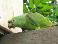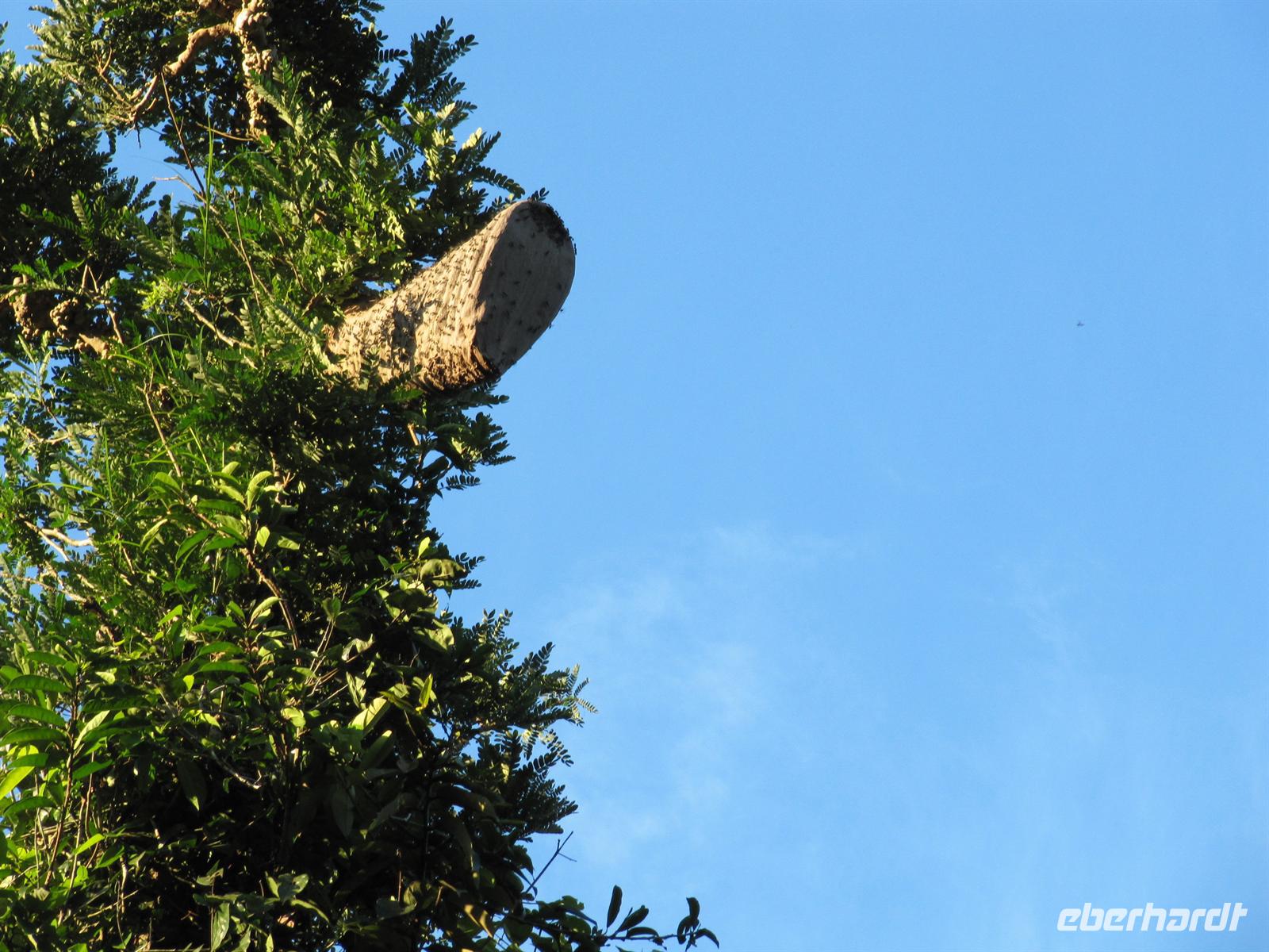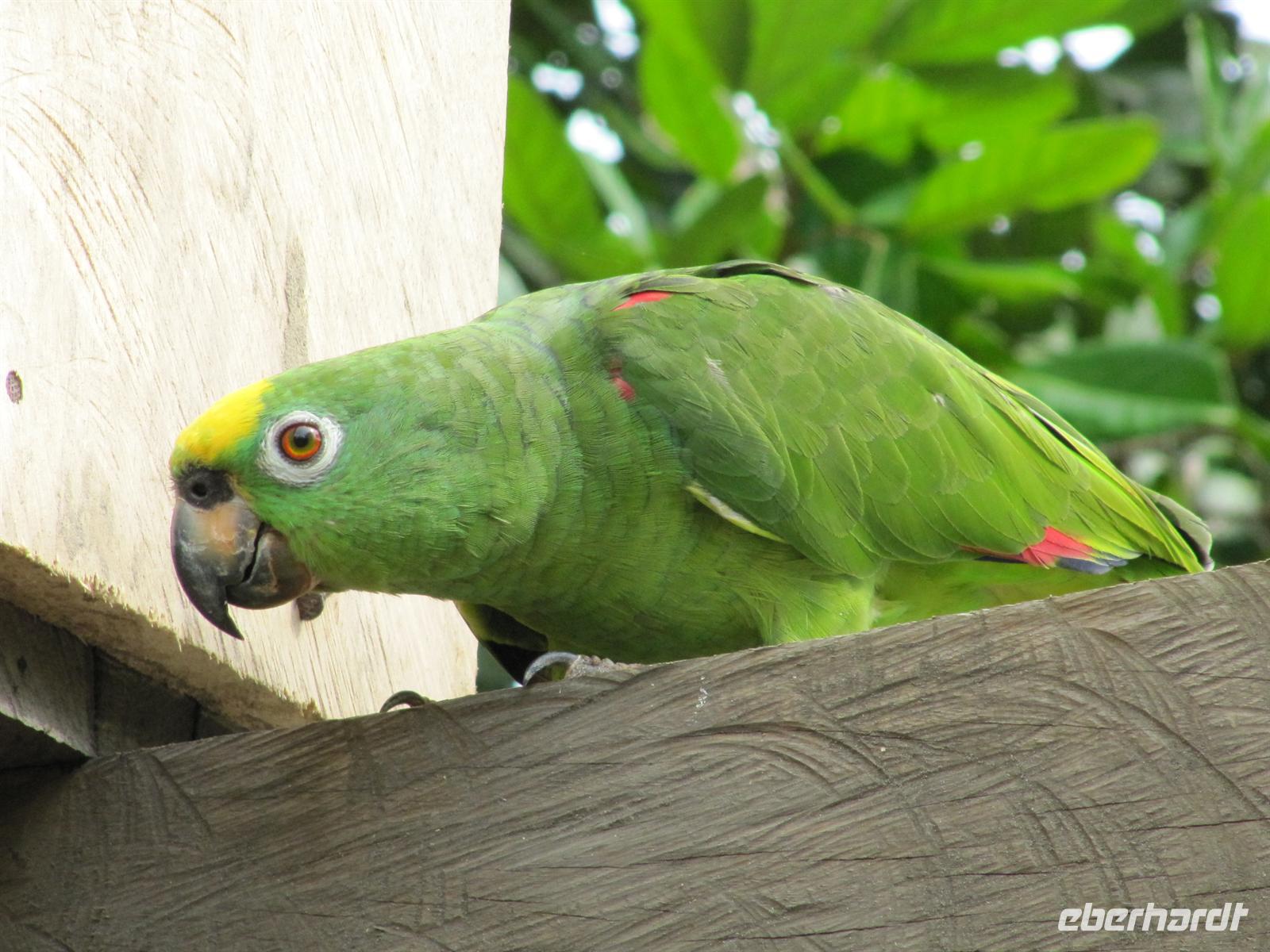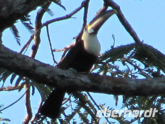 Am nächsten Morgen sind wir bereits gegen 6.00 Uhr in die Kanus gestiegen, haben uns treiben lassen und die erwachende Tierwelt beobachtet. Geier, Aras, Spechte und ein Eulenvogel begrüßten uns. Und ganz beeindruckend waren die Armeewespen. In ihren riesigen Nestern, die in Bäumen hängen, fangen sie an zu marschieren, wenn sie durch Lärm gestört werden. Das klingt wirklich, als würde eine Armee marschieren. Nach dem Frühstück brachte uns unser Bootführer dann in ein Indianerdorf. Dunkle Wolken zogen auf, aber da Diego keine Anstalten machte, Poncho und Gummistiefel anzuziehen, sahen wir auch keine Veranlassung, dies zu tun. Doch kurz bevor wir ankamen, begann ein heftiger Tropenregen und wir waren im Nu pitschnass. Auch das gehört zum Regenwald-Abenteuer! Ein Schamane erwartete uns und gab uns einen kleinen Einblick in seine Kunst und sein Leben. Zum Glück hatte es inzwischen auch wieder aufgehört zu regnen. An einem weiteren Dorf legten wir unsere Mittagspause ein. Das Küchenteam hatte uns Lunch mitgegeben, welches wir mit großem Appetit in der Natur aßen. Wir fuhren weiter bis Puerto Bolivar, einem weiteren Indianerdorf des Stammes der Siona. Hier ernteten wir Maniok und eine Indianerin rieb diesen, presste das Wasser aus, so dass Mehl entstand und daraus wurden auf einer Keramikplatte über offenem Feuer Fladen gebacken. Diese schmeckten mit Marmelade oder scharfer Soße sehr gut. Es ist beeindruckend unter welch einfachen Bedingungen die Indianer im Regenwald leben und die Früchte der Natur nutzen. Am späten Nachmittag kehrten wir zur Lodge zurück. Unterwegs sahen wir noch einige der größten Bäume des Regenwaldes, die Kabok-Bäume. Nach dem Abendessen verabschiedete sich die Crew von uns.