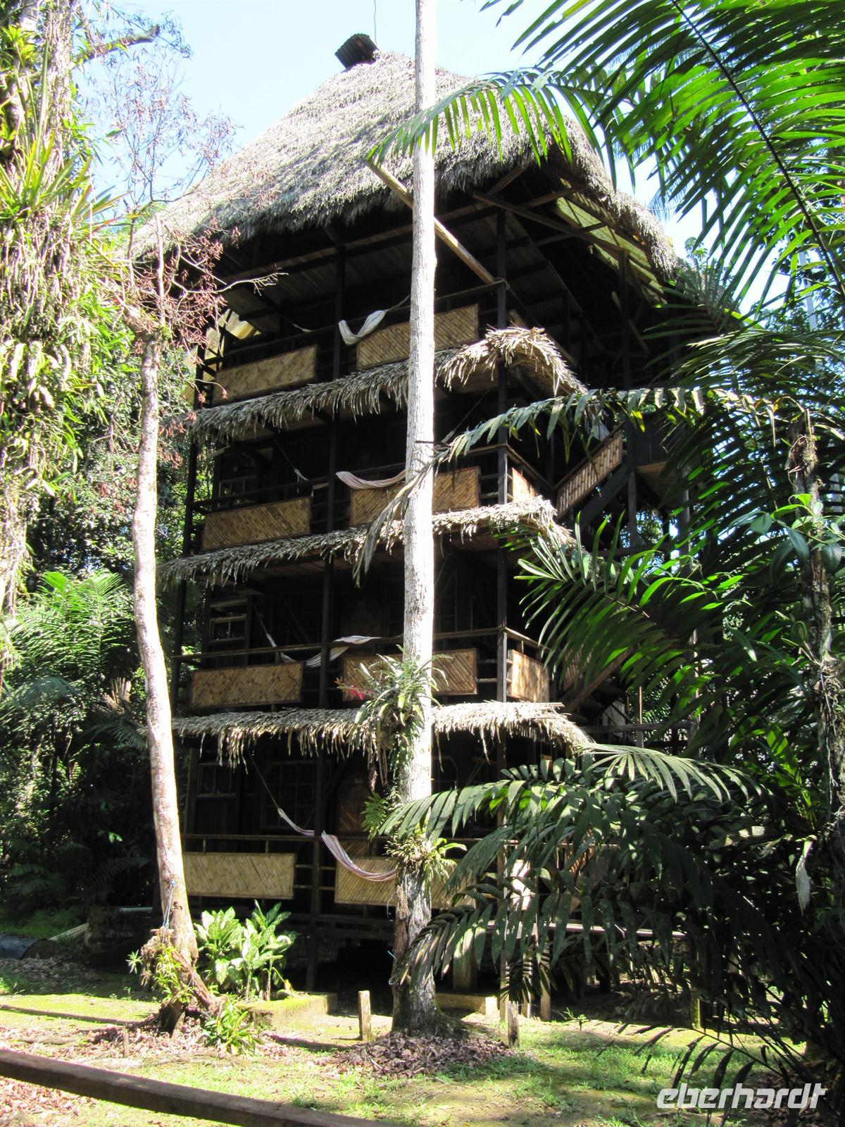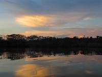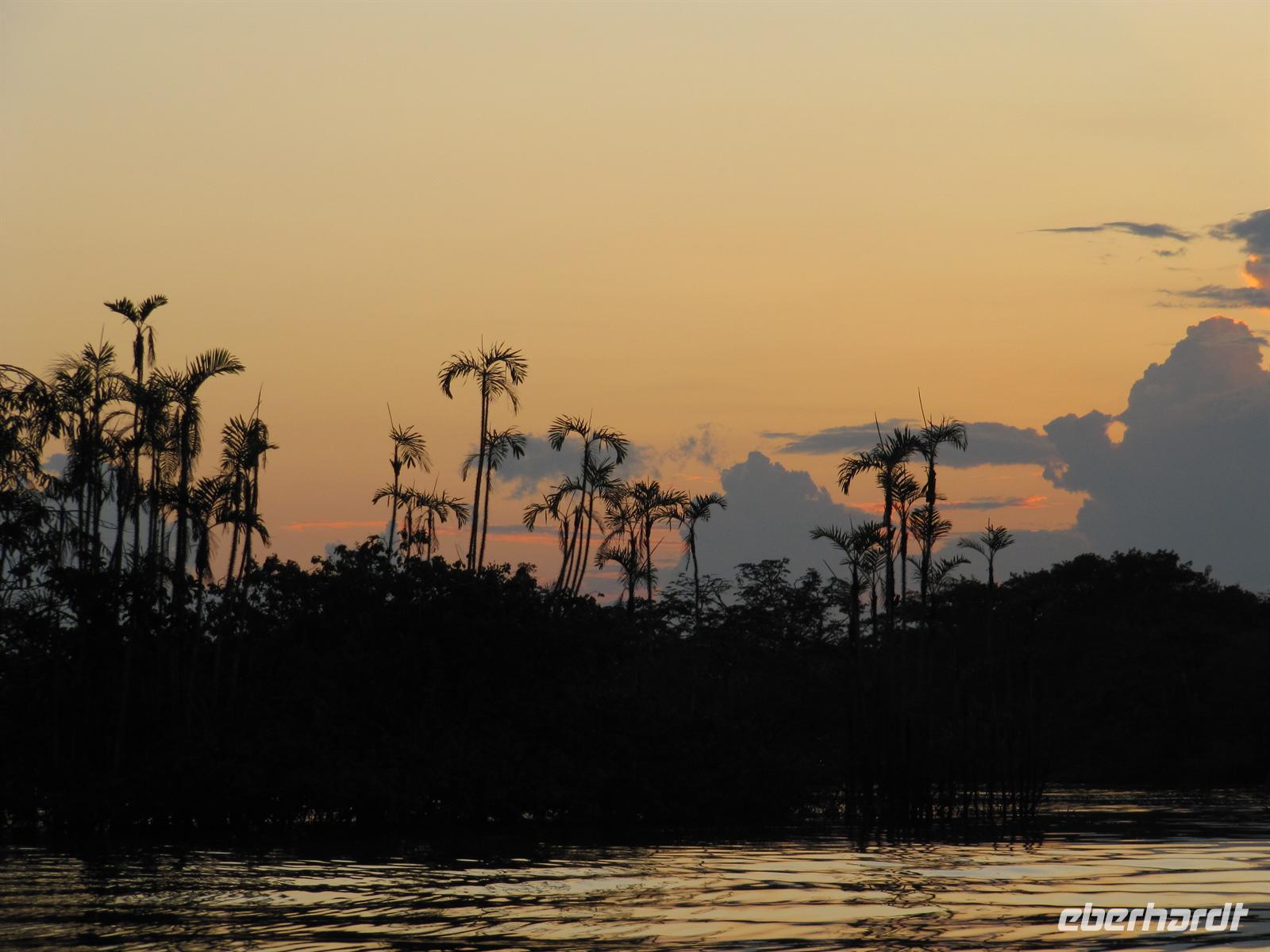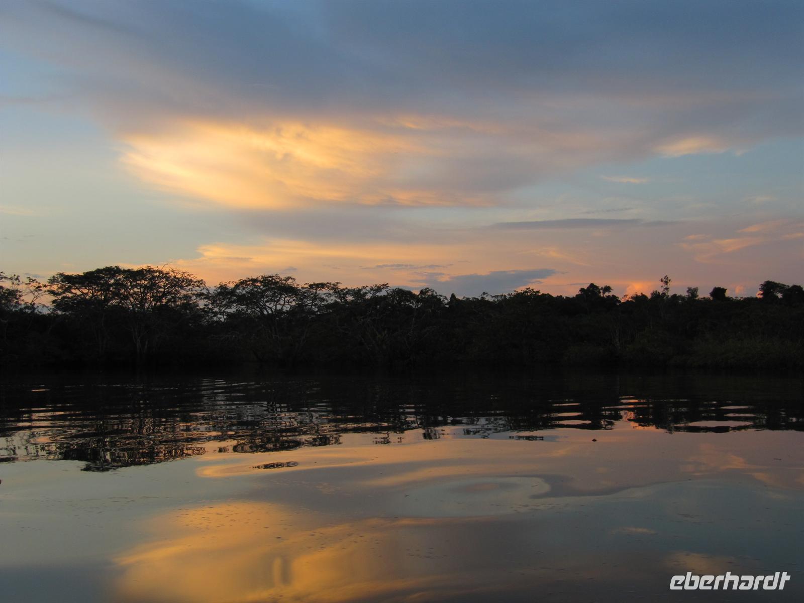 Am nächsten Morgen klingelten unsere Wecker bereits um 4.00 Uhr und 5.00 Uhr fuhren wir zum Flughafen. Heute brachte uns eine kleine Propeller-Maschine der VIP-Air nach Coca. Uns schlug bereits beim Aussteigen eine feuchte Schwüle entgegen. Von hier fuhren wir mit dem Bus ca. 3 Stunden bis zum Eingang des Cuyabeno-Nationalparkes im Regenwald. Wir erhielten durch Diego und Vinezio, unsere Naturführer für die nächsten 4 Tage, eine erste kurze Einweisung und dann bestiegen wir zwei Kanus und in einem dritten wurden unser kleines Gepäck und Lebensmittel für die Lodge verstaut. In einer fast 4-stündigen interessanten Fahrt ging es zur „Tapir Lodge“. Unterwegs entdeckten wir immer wieder die verschiedensten Tiere und Pflanzen. So begegneten wir Totenkopfäffchen, Eisvögeln, Aras und vielen weiteren exotischen Vögeln. Ein Höhepunkt war der Sonnenuntergang in der großen Lagune. Am Eingang der Lagune sahen wir noch rosa Flussdelfine. Bereits im Dunkeln kamen wir in der Lodge mitten im Regenwald an. Wir bezogen unsere einfachen Zimmer im Wohnturm und wurden mit einem leckeren Abendessen vom Koch überrascht. Toll, was die Crew der Lodge gezaubert hat! Von 18.00 bis 8.00 Uhr gibt es elektrisches Licht in der Lodge und die Bäder sind auch mit Dusche und WC ausgestattet. Eine ganz neue Erfahrung stellten die vielen Geräusche dar, die durch die nur mit Fliegengaze verschlossenen Fenster in die Zimmer drangen. Diese bildeten eine imposante Kulisse, um in den Schlaf zu finden.