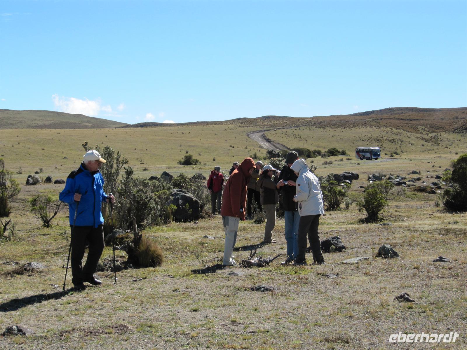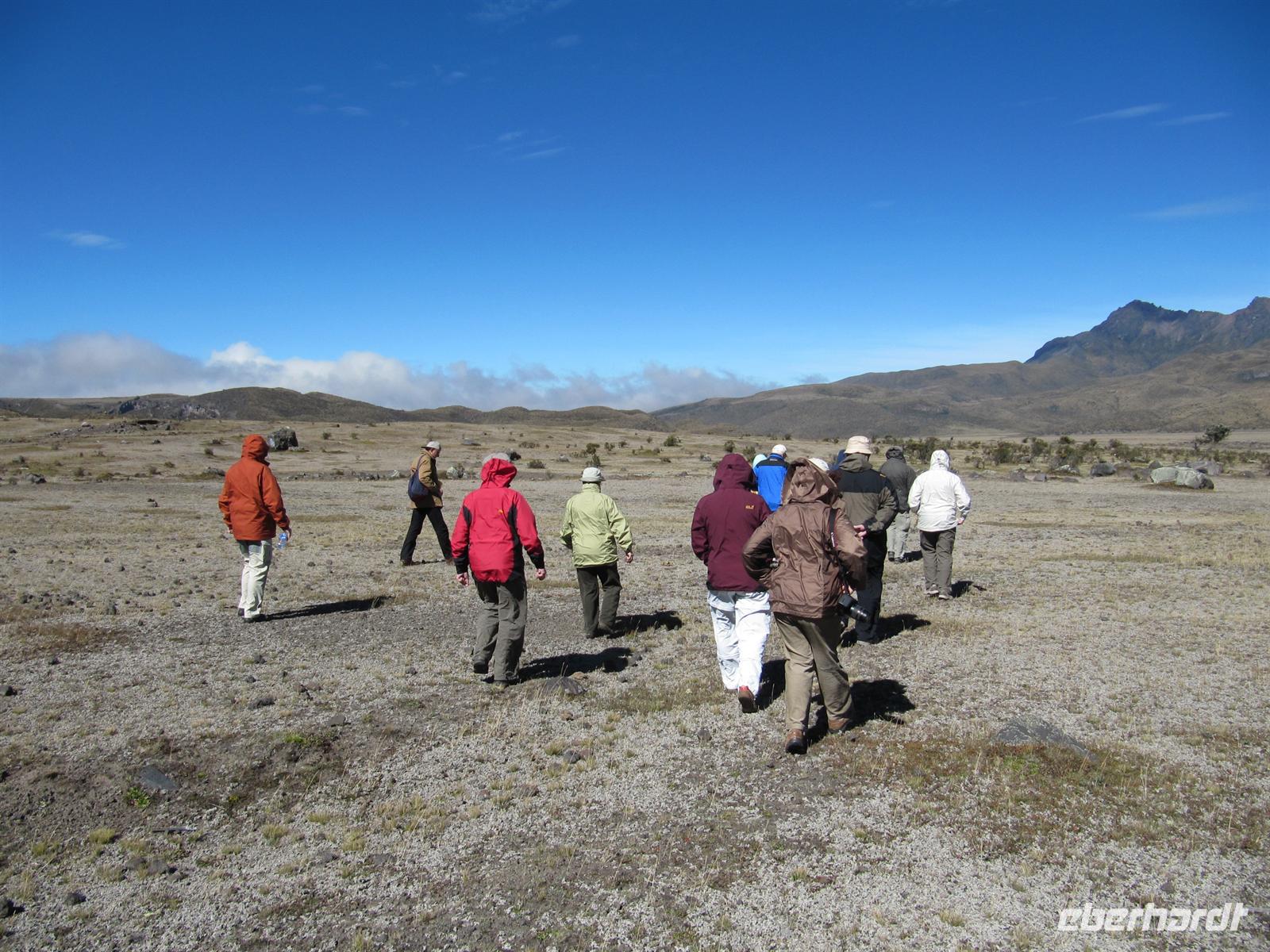 Am Abend erreichten wir die Hacienda "Leito". Jedes Zimmer verfügte über einen Kamin, welchen wir abends gern nutzten, denn in einer Höhe von 2.800 Metern wurde es nachts doch recht kühl. Am nächsten Morgen begaben wir uns recht zeitig wieder auf die Reise, sollten wir doch heute einen weiteren Höhepunkt unserer Reise erleben: den Chimborazo, mit 6.310 Metern höchster Berg des Landes. Durch eine bizarre Vulkanlandschaft bringt uns Anibal, unser Bus-Chauffeur, sicher zur ersten Hütte auf 4.800 Metern Höhe. Nun wollten wir alle unseren persönlichen Höhenrekord aufstellen und zur zweiten Schutzhütte in 5.000 Metern Höhe aufsteigen. Bei herrlichstem Sonnenschein wanderten wir ganz langsam auf dem guten Wanderweg zur Hütte. Die Höhe machte uns recht langsam, was bedeutete, dass man nach 10 Schritten stehen bleiben musste und etwas Wasser trinken und ordentlich durchatmen musste. Aber es war ein tolles Gefühl, als wir dann am Fuße des imposanten Berges in 5.000 Metern Höhe standen und ein tolles Panorama bis zur Küste genießen konnten. Wir waren sehr stolz, diese Herausforderung alle geschafft zu haben! Nachdem wir wieder am Bus waren, stärkten wir uns bei einem Picknick und schon ging es weiter entlang der Vulkane mit tollen Panoramablicken vorbei an Riobamba nach Alausi. Hier erwartete uns die Fahrt mit einem Schienenbus auf der Route der Trans-Anden-Bahn zur Teufelsnase. Die Route führt durch eine atemberaubende Landschaft. Mit dem Bus ging es dann zurück zu unserer Unterkunft nahe Riobamba. Bei einem schmackhaften Abendessen ließen wir den Tag ausklingen. Nur unserem Reiseleiter Richard ging es nicht gut. Er hatte seine Sonnenmütze und Sonnencreme vergessen und hatte die Wanderung ungeschützt unternommen. Jetzt plagte ihn ein Sonnenstich. Dies zeigte uns aber, dass ein guter Sonnenschutz in der Höhe und so nah am Äquator unerlässlich ist. Und natürlich versorgten wir Richard ab dem nächsten Tag damit.