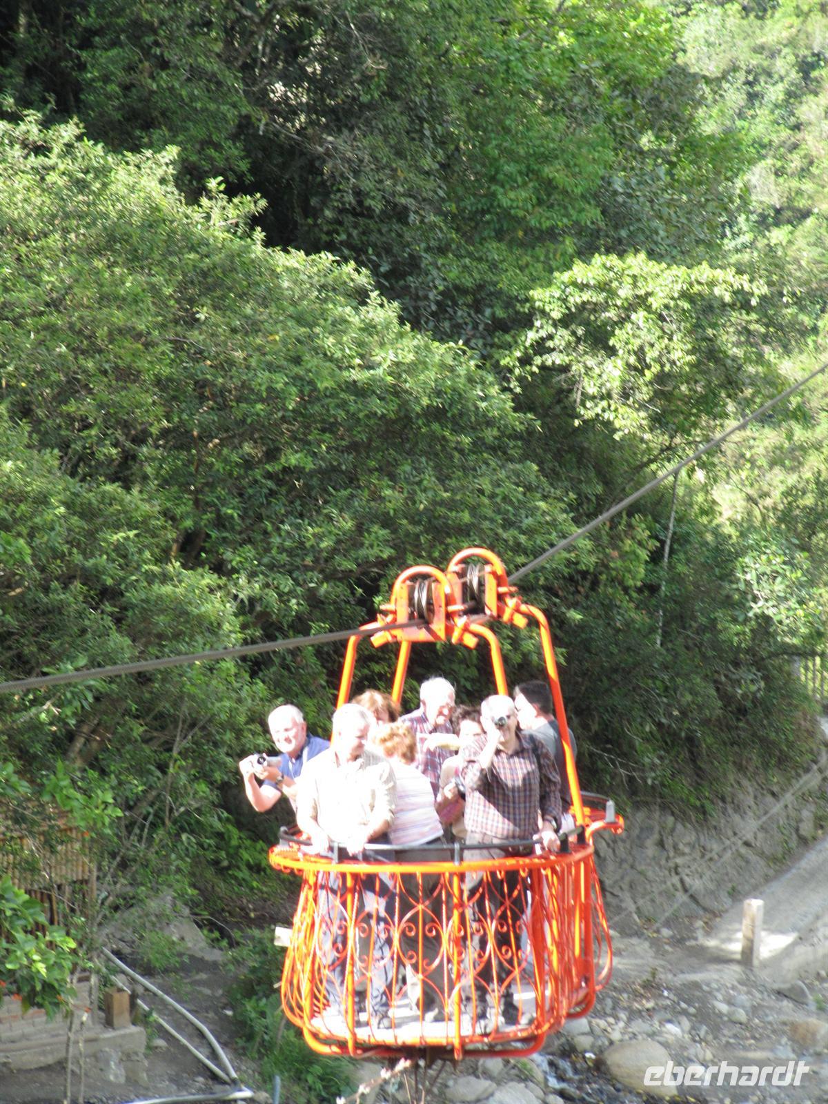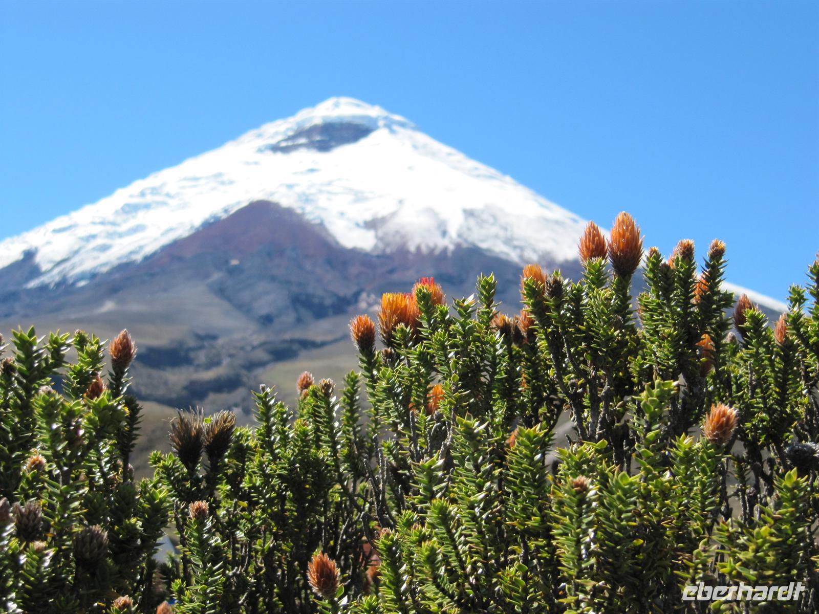 Am nächste Tag begann unsere Fahrt entlang der Straße der Vulkane. Unser erstes Ziel war der mit 5.897 Metern höchste noch aktive Vulkan der Welt, der Cotopaxi. Wir fuhren mit dem Bus in den Nationalpark auf die Ebene in 3.800 Metern Höhe am Fuße des Cotopaxi. Bei Traumwetter mit fantastischer Sicht auf den Berg und die umliegenden Vulkane wanderten wir zur Lagune Limpiopungo. Wir entdeckten dabei immer wieder interessante Pflanzen in der kargen Landschaft. Anschließend führte uns die Panamericana weiter Richtung Banos. Ecuador ist einer der wichtigsten Rosenproduzenten der Welt und wir besuchten gegen Mittag eine Rosenplantage, wo täglich 30.000 herrlichster Rosen geerntet werden und ihre Reise in die Welt antreten. Am Nachmittag erreichten wir Banos. Bevor wir uns die nette Stadt anschauten, erlebten wir noch eine abenteuerliche Seilbahnfahrt zum Wasserfall „Brautschleier“, unweit der Stadt. Banos ist ein beliebter Ferienort, der über heiße Quellen verfügt. Diese werden in verschiedenen Thermen genutzt und liegen am Fuße des 5.000 Meter hohen, recht aktiven Vulkans Tungurahua. Banos ist aber auch für seine Zuckerbäcker bekannt. Sie stellen auf ganz eigenwillige Art Karamellstangen her. Sie ziehen die klebrige Masse an einem Haken im Laden solange, bis sie die richtige Konsistenz hat.