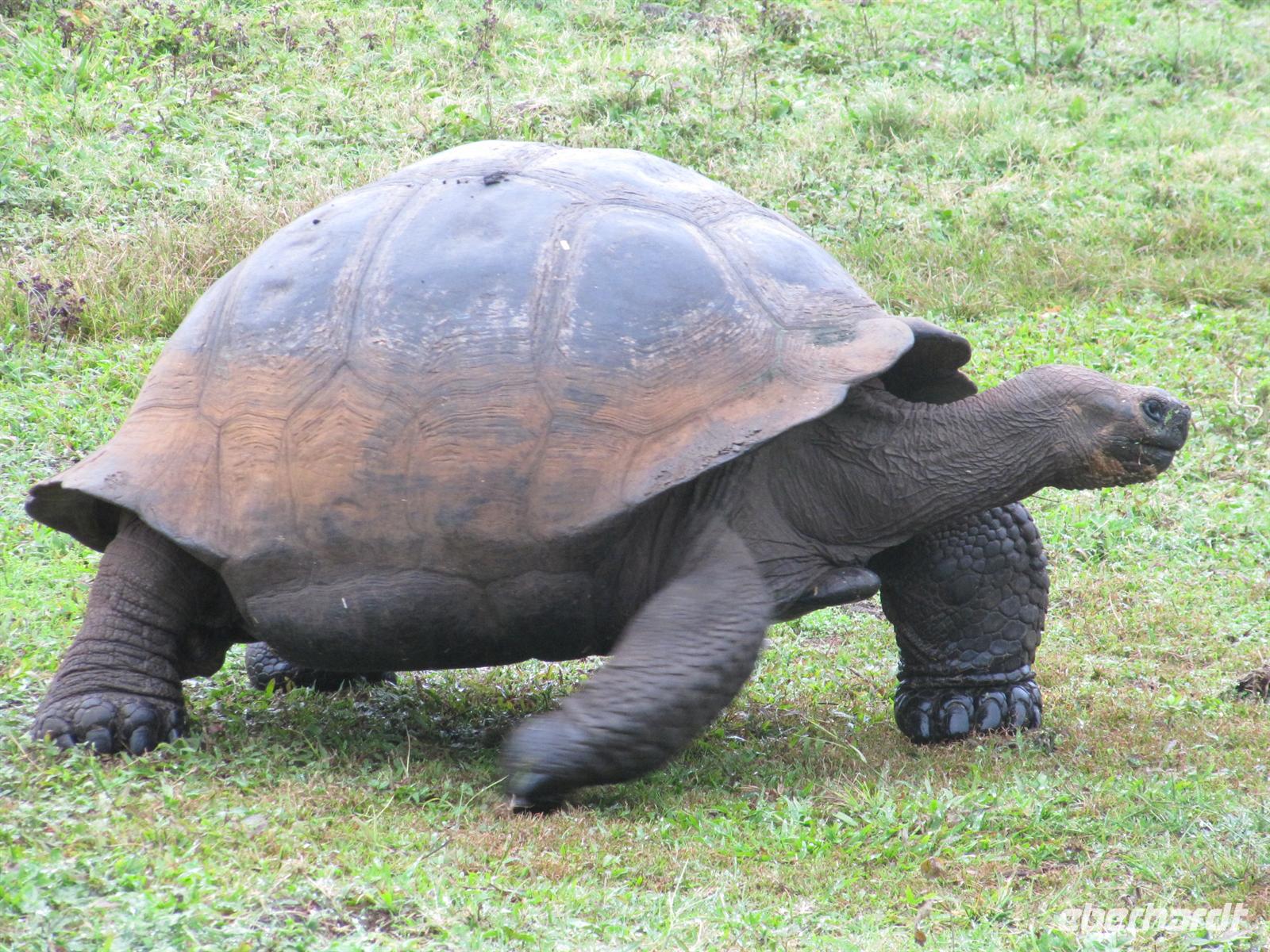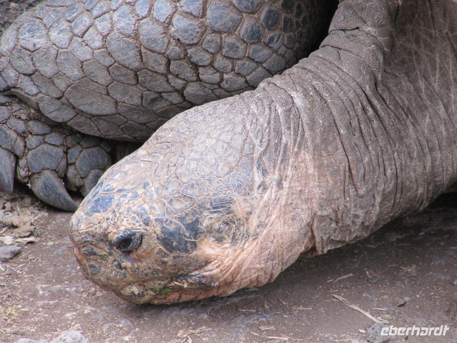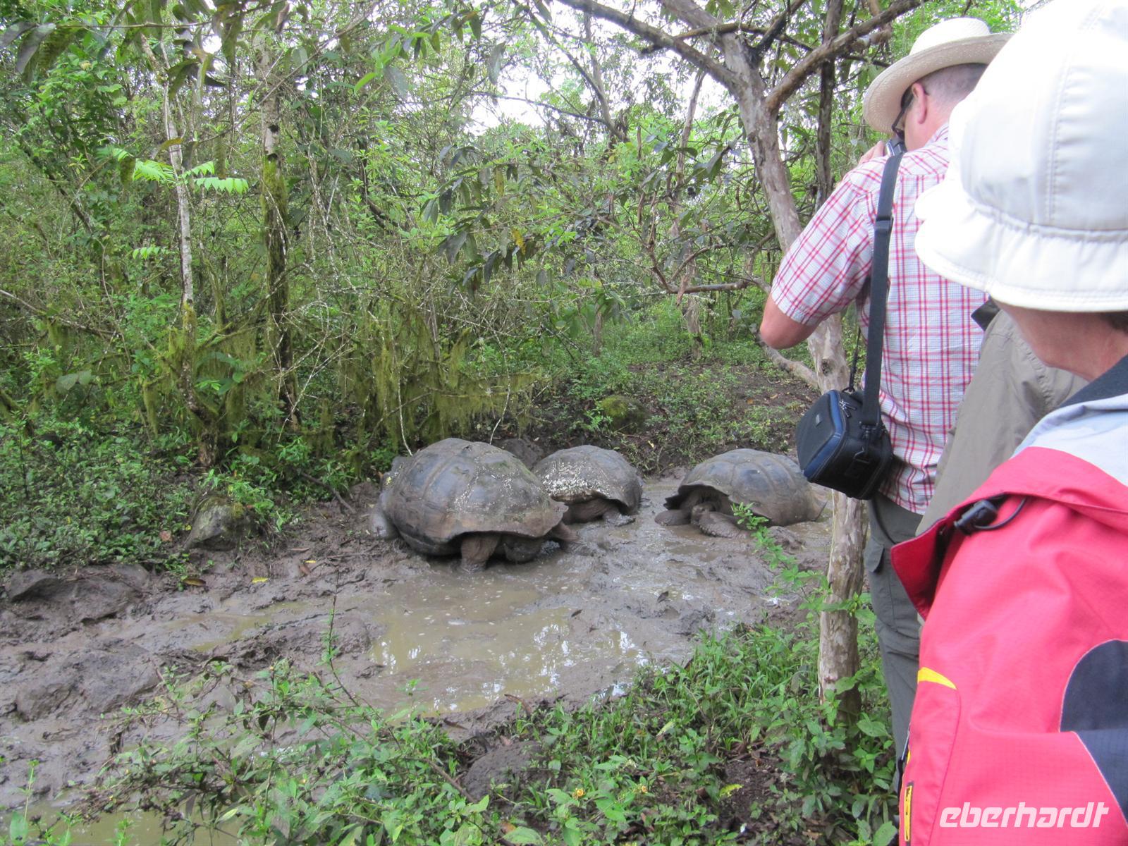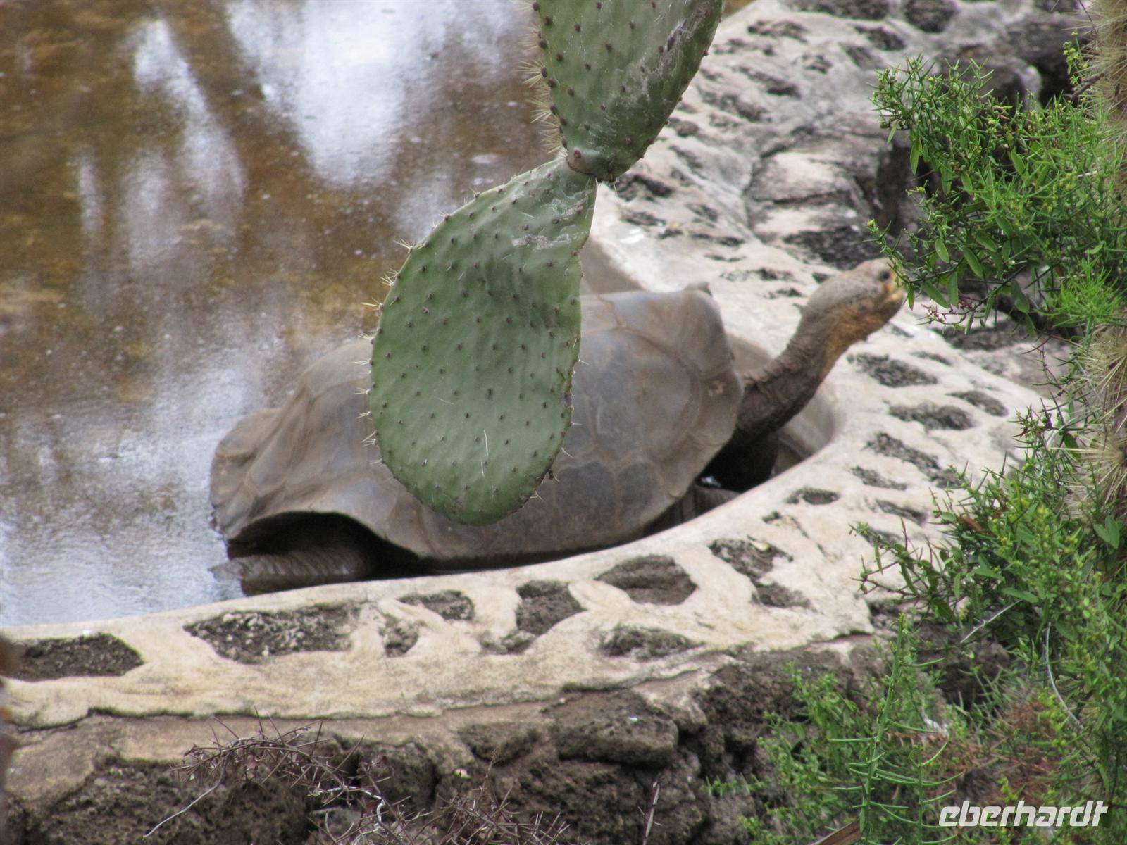 Nachdem wir die Formalitäten auf dem Flughafen erledigt hatten, flogen wir nach Baltra. Hier wurde nochmals unser Gepäck kontrolliert und dann fuhren wir mit dem Bus zur Fähre und von da aus über den Kanal von Itabaca auf die Insel Santa Cruz. Eine etwa 45 Minuten dauernde Busfahrt über die Insel zeigte uns bereits die Vielfalt der Insel. In Puerto Ayora, im Süden der Insel, bezogen wir unser Domizil für die nächsten Tage, das Hotel „Silberstein“. Am Nachmittag besuchten wir die Charles-Darwin-Forschungsstation. Hier erfuhren wir viel über den Naturschutz und die Arbeit der Wissenschaftler zum Schutz der einmaligen Tier- und Pflanzenwelt auf den Galápagos-Inseln. Darüber hinaus lernten wir das Aufzuchtprogramm für die vom Aussterben bedrohten Riesenschildkröten kennen. Hier konnten wir diese imposanten Tiere erstmals hautnah erleben.