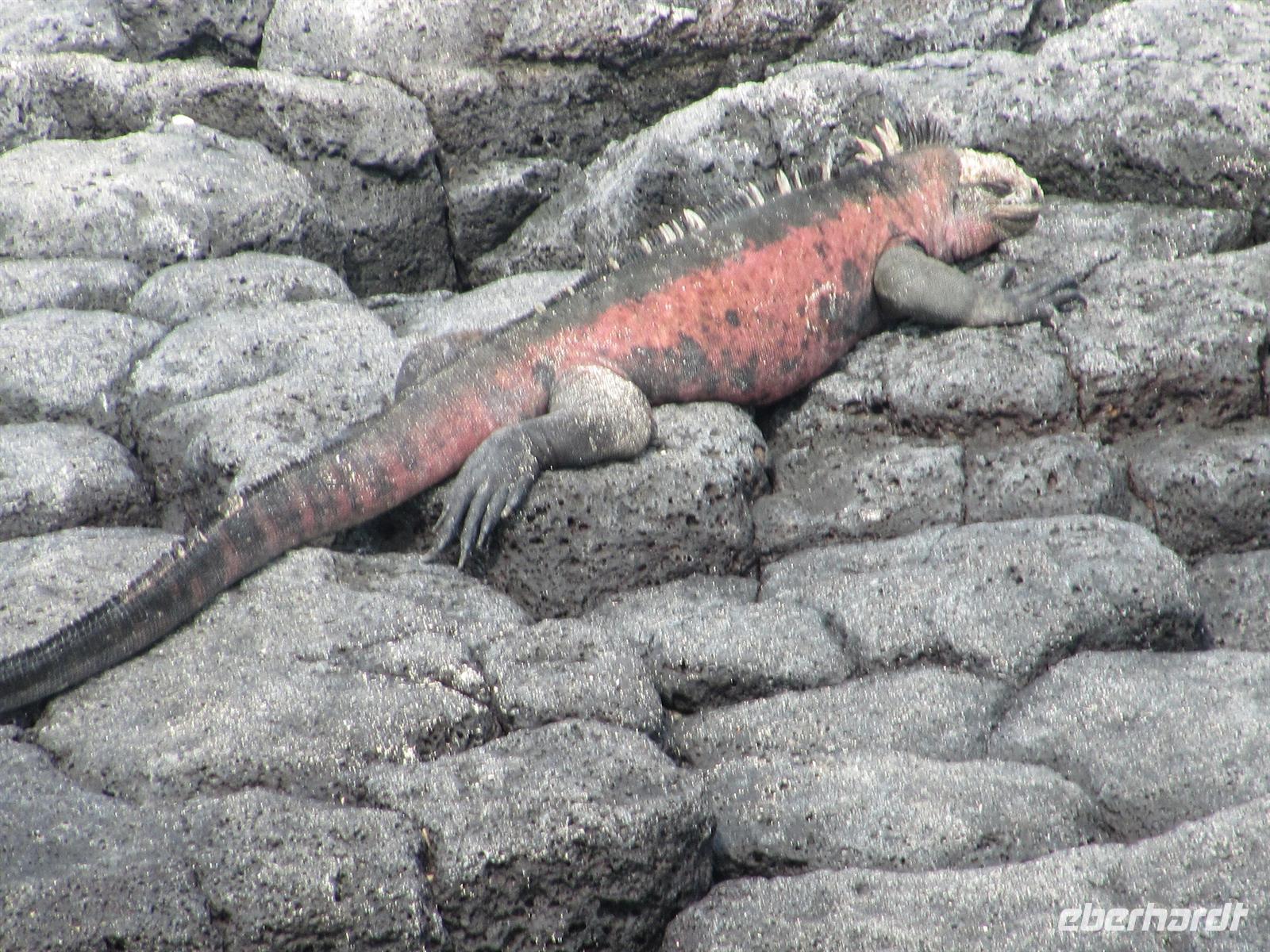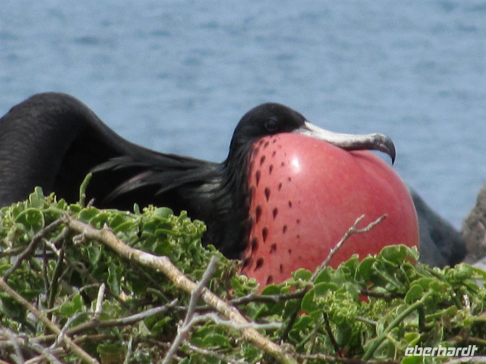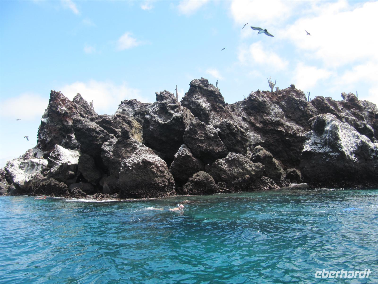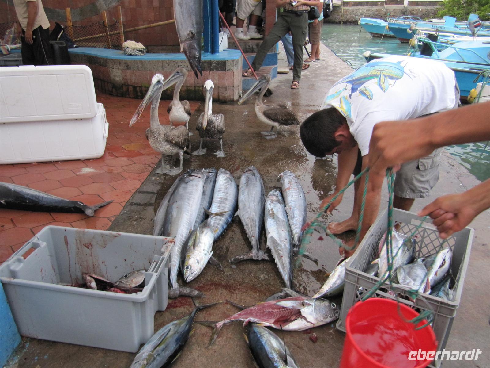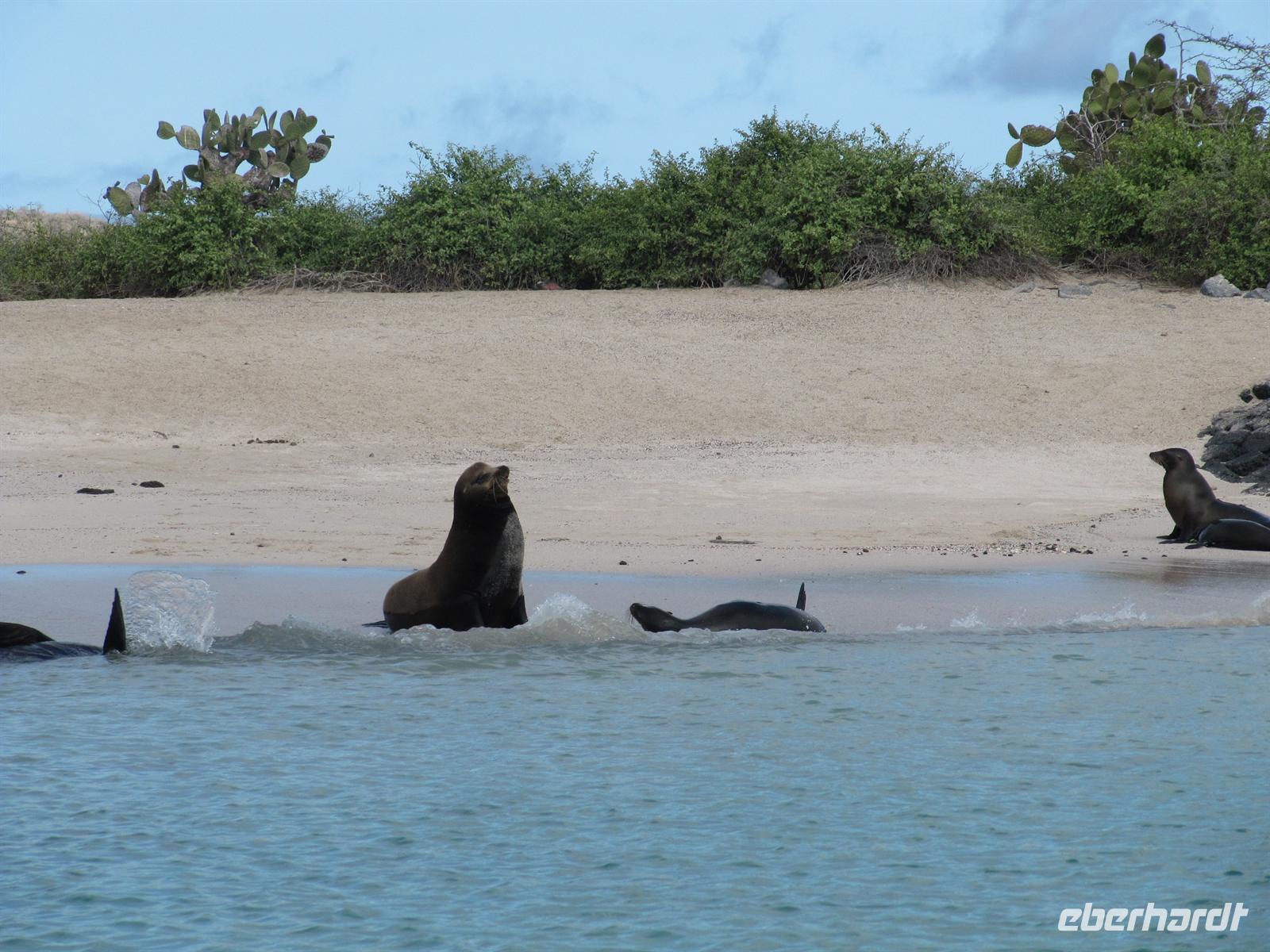 Am nächsten Tag war die Insel Seymour Norte unser Ziel. Diese Insel ist Brutgebiet der Fregattvögel und der Tölpel. Wir erlebten, wie die männlichen Fregattvögel bei der Balz ihren knallroten Kehlsack aufblasen, wir schauten aus nächster Nähe in die Nester und sahen die Jungtiere. Die Blaufußtölpel und die gelben Landleguane ließen sich von uns nicht stören. Aber auch die einmalige Pflanzenwelt faszinierte uns. Per Schiff ging es zum Traumstrand von Bachers Beach. Hier beobachteten wir Meeresechsen, Krabben, Pelikane und schwammen wieder im Meer. Am Nachmittag kehrten wir zum Hotel zurück. Wir bummelten noch zum kleinen Fischmarkt von Puerto Ayora. Hier wurde der frisch gefangene Fisch portioniert und direkt verkauft. Pelikane, Reiher und ein Seelöwe spazierten zwischen den Fischern und warteten auf einen Leckerbissen.