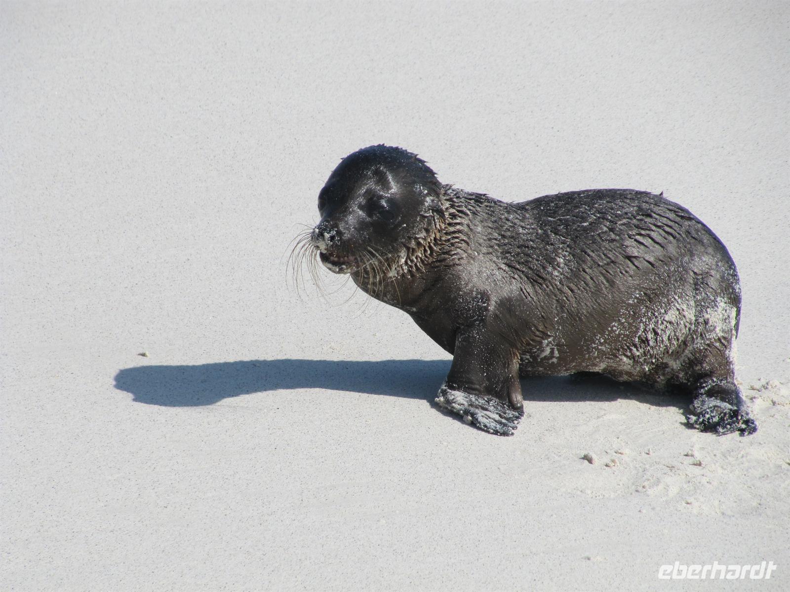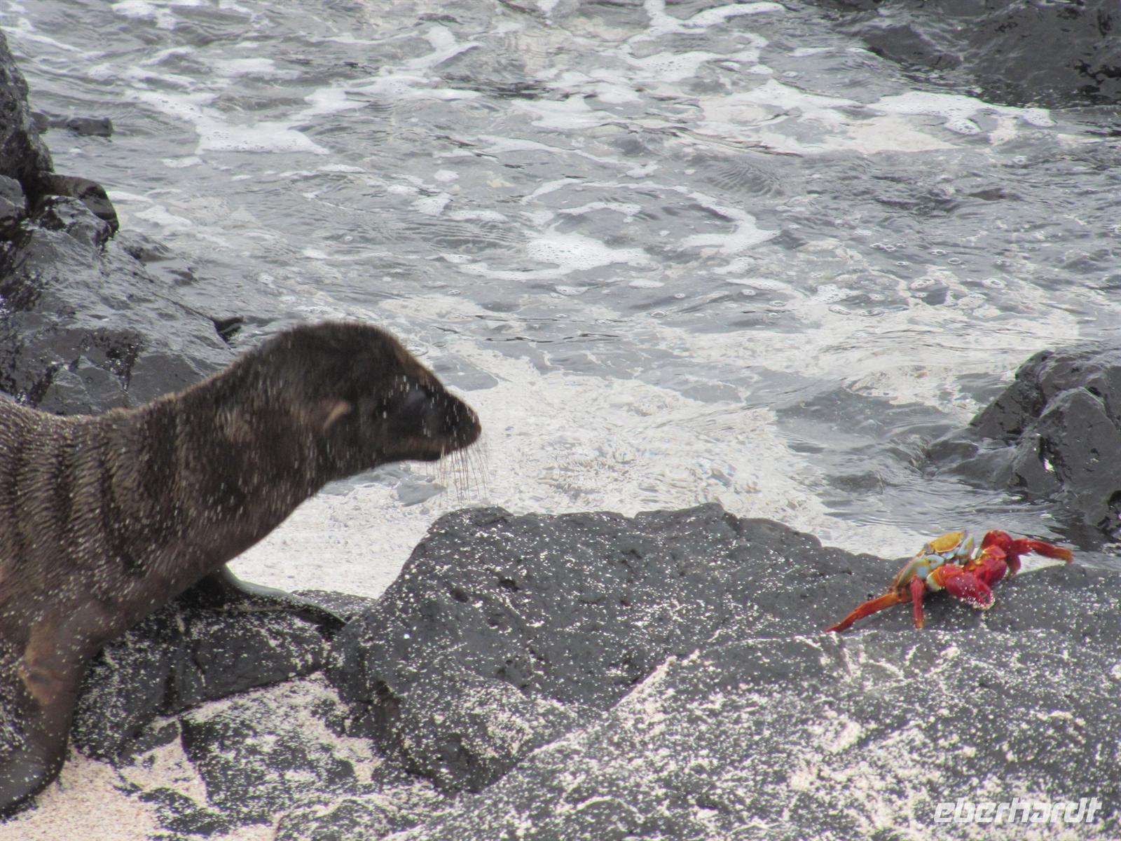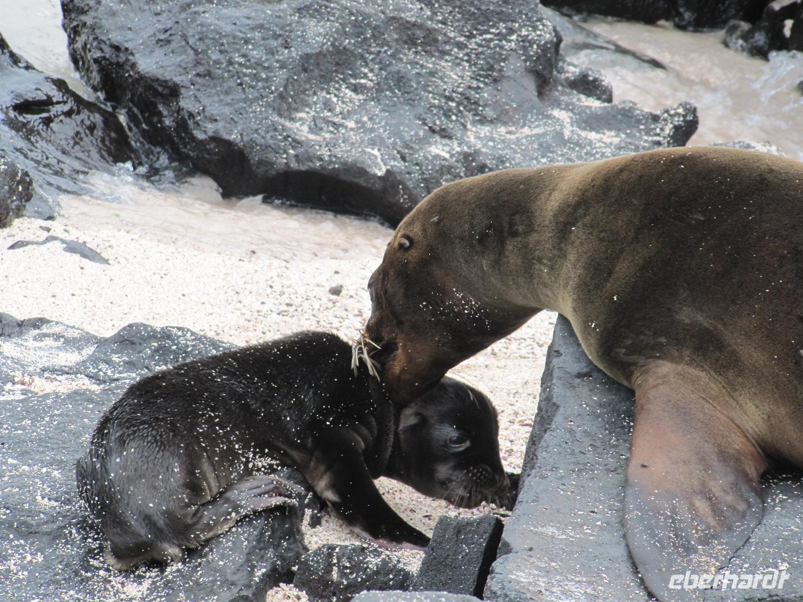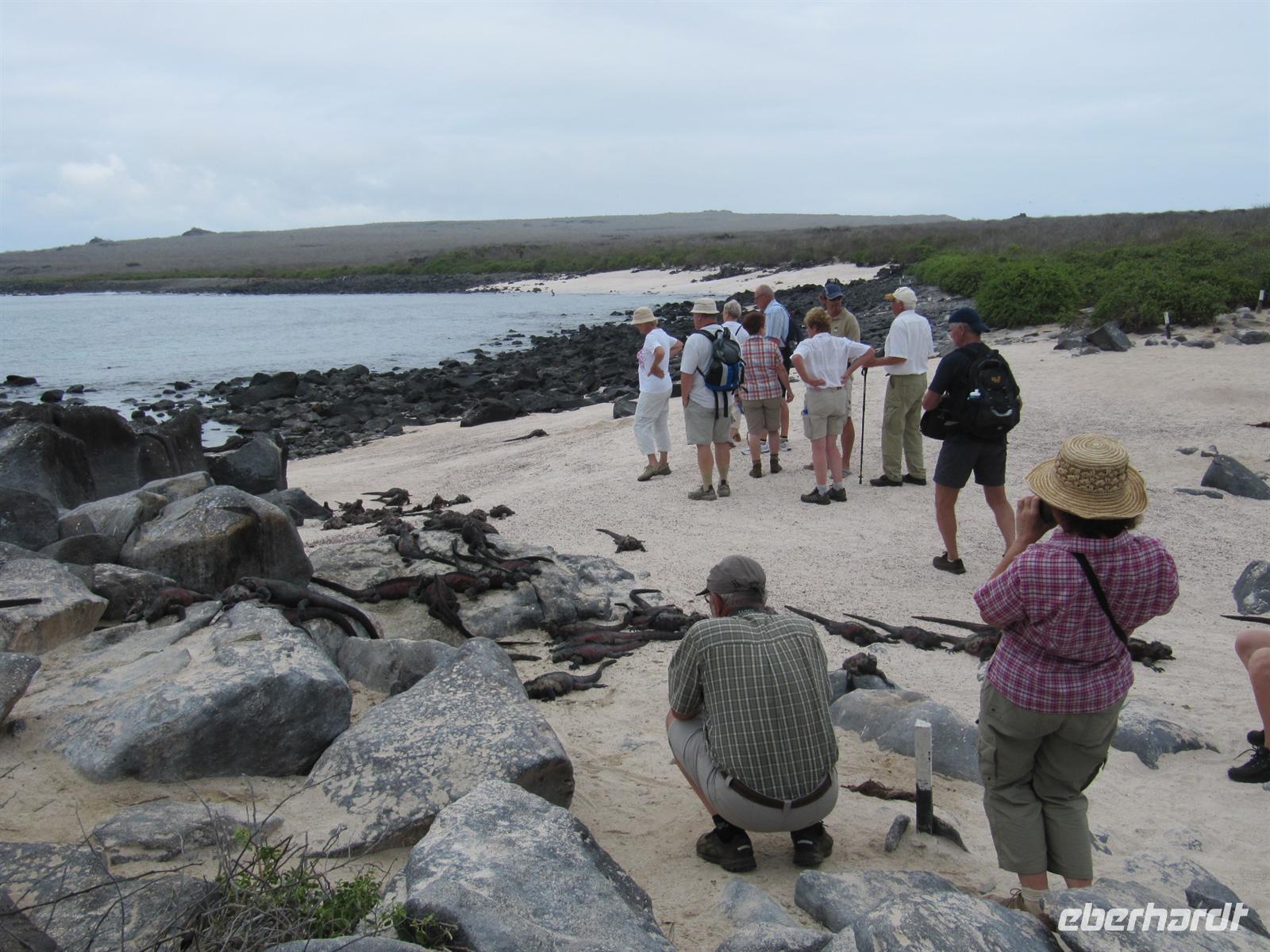 Die Yacht brachte uns in der Nacht nach Espanola. Den Vormittag verbrachten wir am Strand der Gardner-Bucht. Hier lebt eine große Gruppe Seelöwen, die wir wieder hautnah beobachten durften und die uns neugierig beäugten. Bei schönstem Wetter genossen wir ein letztes Bad im warmen Meer. Die Schnorchler sahen eine bunte Unterwasserwelt. Am Nachmittag wanderten wir dann über die Insel. Sie ist Brutstätte der Galápagos-Albatrosse, der Nazca-Tölpel und der Meeresechsen. Wir erlebten riesige Kolonien der Tiere und hatten sogar Glück, denn zwei Seebären zeigten sich uns. Zum Schluss entdeckten wir noch eine Seelöwin mit einem Neugeborenen. Und die kleinen Seelöwen zeigten uns, wie sie Krabben hinterher jagen oder versuchen, mit dem Schwanz einer Meeresechse zu spielen. Das war ein toller Abschluss unserer Reise und es fiel uns allen sehr schwer, dieses Paradies zu verlassen. Unseren Wunsch, dass dieses einmalige Naturwunder unbedingt erhalten und strengstens geschützt werden muss, nehmen wir alle im Herzen mit nach Hause!