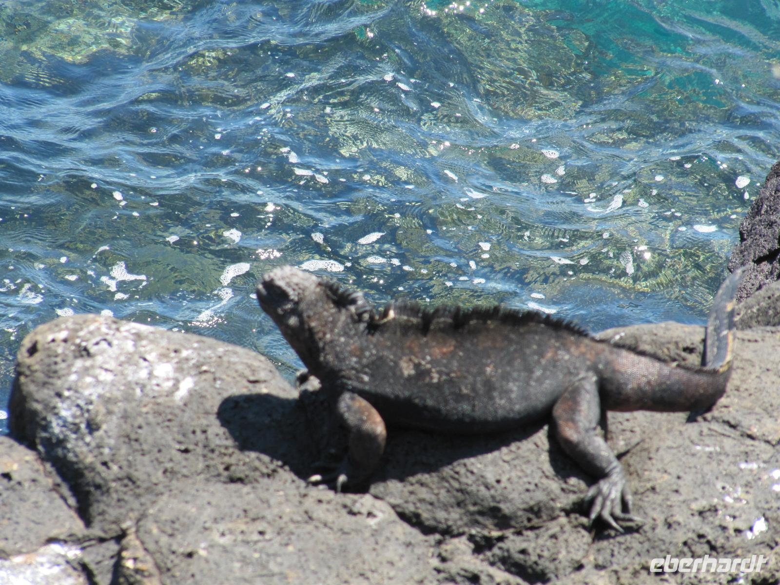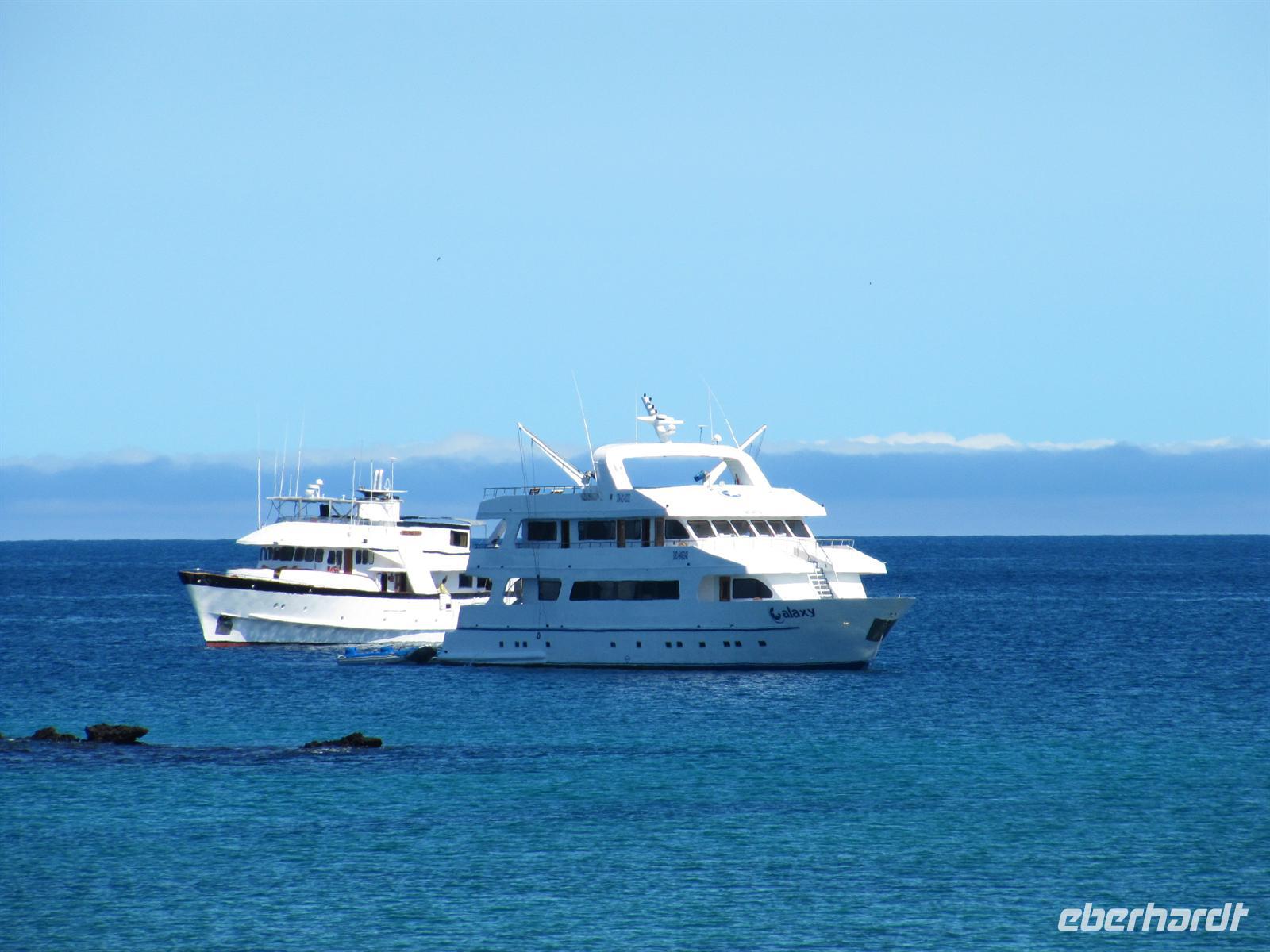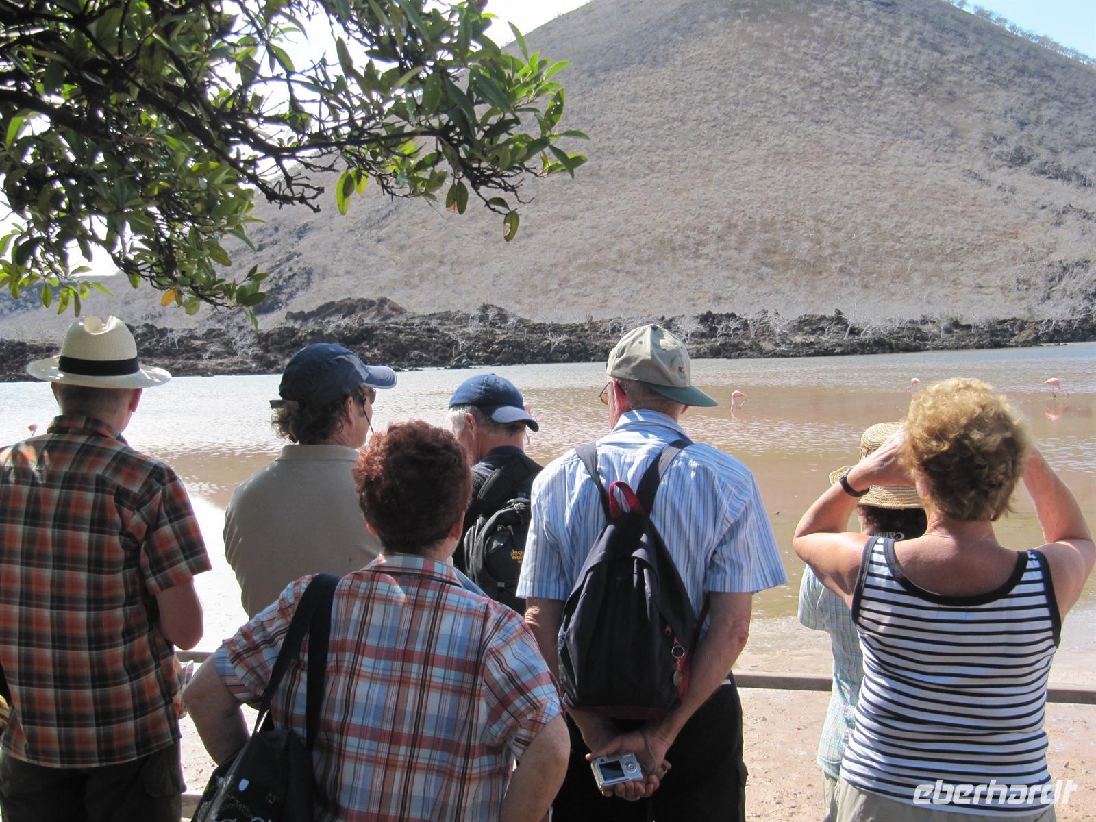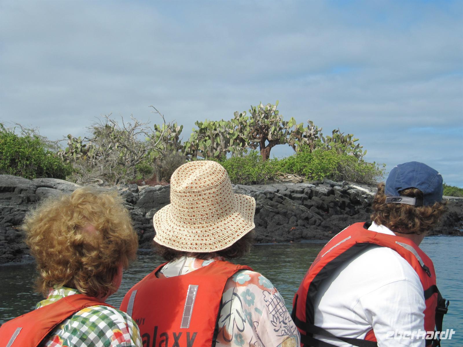 Am nächsten Morgen wanderten wir zur Tortuga Bay. Sie ist Heimat der Meeresechsen. Wir sahen eine große Gruppe der imposanten Tiere. Sie scheinen aus einer längst vergangen Zeit zu stammen. Am Mittag holte uns Lars, unser Naturführer für die nächsten drei Tage, ab. Bevor wir einen Ausflug ins Hochland von Santa Cruz unternahmen, bezogen wir unsere Kabinen auf der Yacht „Galaxy“, mit der wir zu den Inseln Floreana, Espanola und San Cristobal gelangten. Zunächst besuchten wir die Riesenschildkröten im Hochland der Insel. Es war sehr faszinierend, diese riesigen Tiere in freier Wildbahn zu beobachten. Auf der Yacht wurden wir mit einem schmackhaften Abendessen erwartet. Und in der Nacht legte diese dann Richtung Floreana ab. Wir landeten mit dem Schlauchboot am grünen Strand Punta Comorant. In der Brackwasser-Lagune hinter dem Strand leben Flamingos. Dann wanderten wir zum weißen Strand und beobachteten grüne Meeresschildkröten und Diamant-Stachelrochen. Am grünen Strand, der auf Grund kleinster Mineralsedimente grün schimmert, badeten wir. Einige Seelöwen lagen am Strand und ein halbstarker Jungbulle stänkerte mit uns. Aber auf Galápagos haben die Tiere alle Rechte und wir Menschen müssen strenge Regeln einhalten. Und das ist gut so! Denn die Tiere haben keine Angst vor dem Menschen. Am Nachmittag besuchten wir die berühmte Post Office Bay. Schon die Piraten haben hier ein Fass als Postfach installiert und bis heute wird es genutzt.