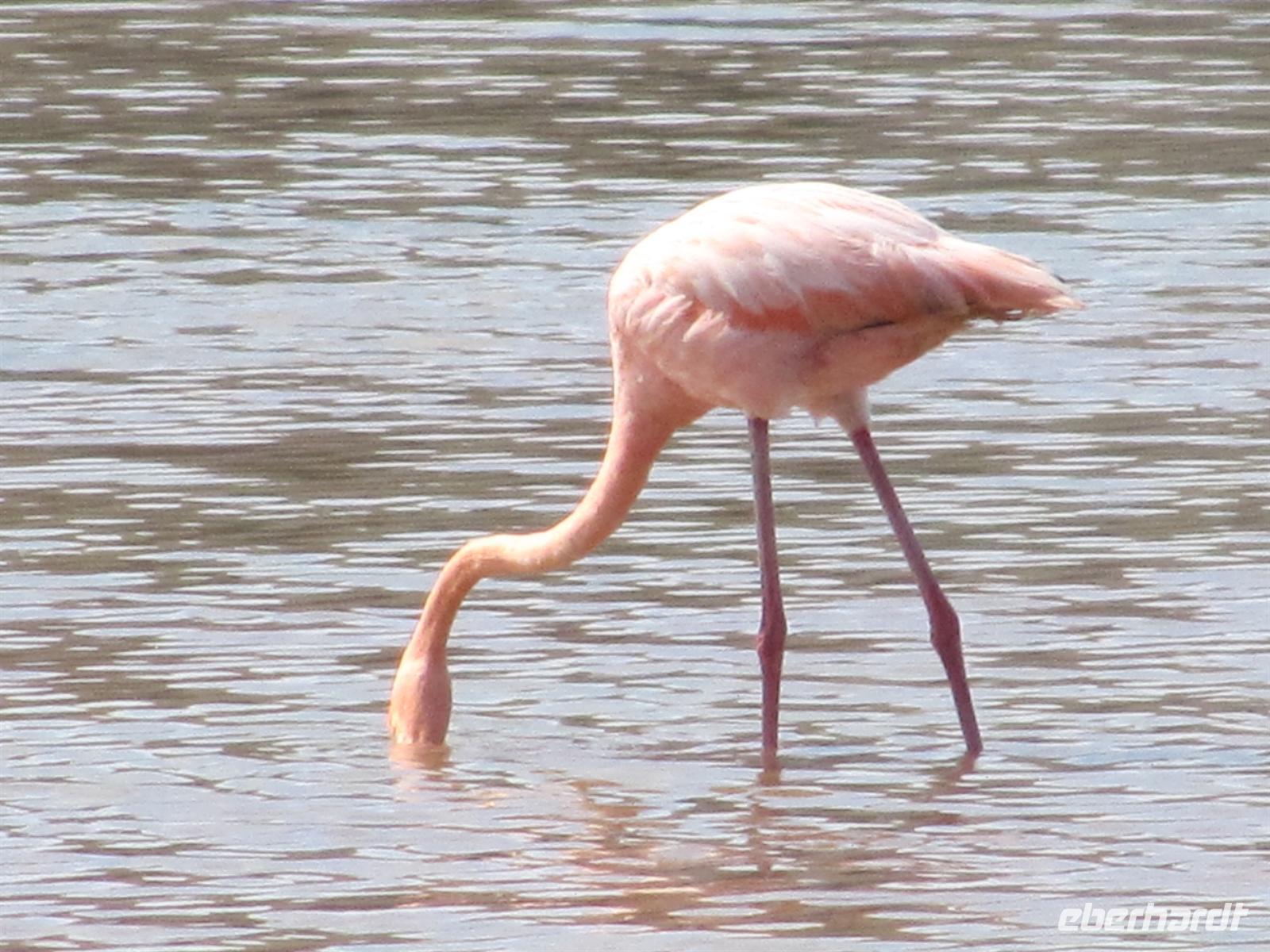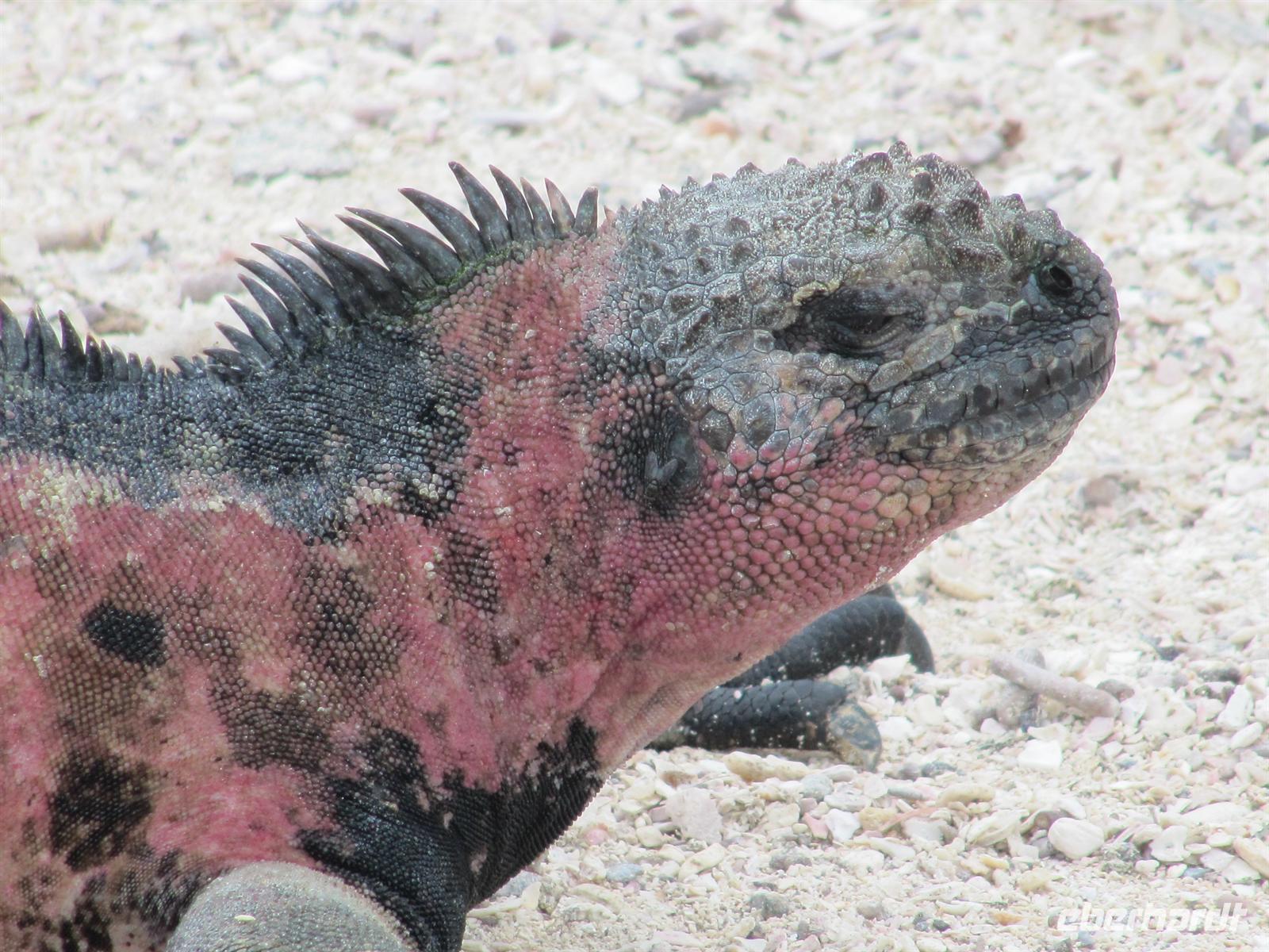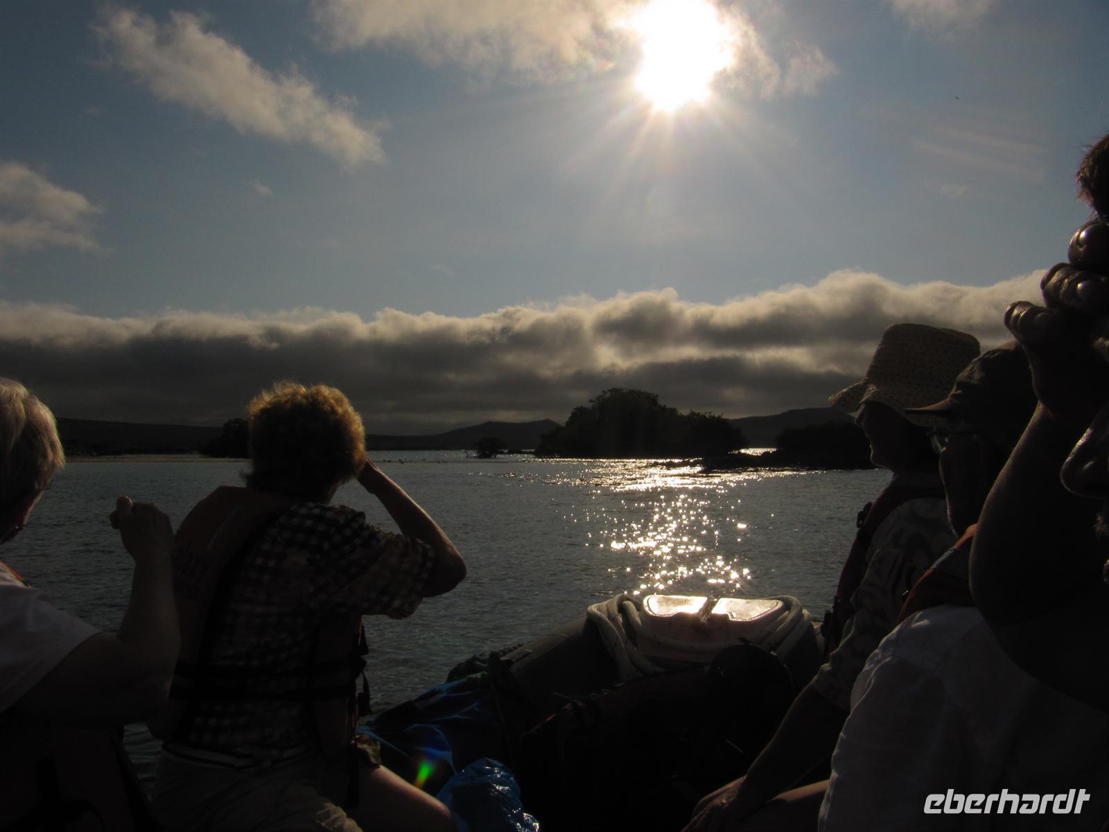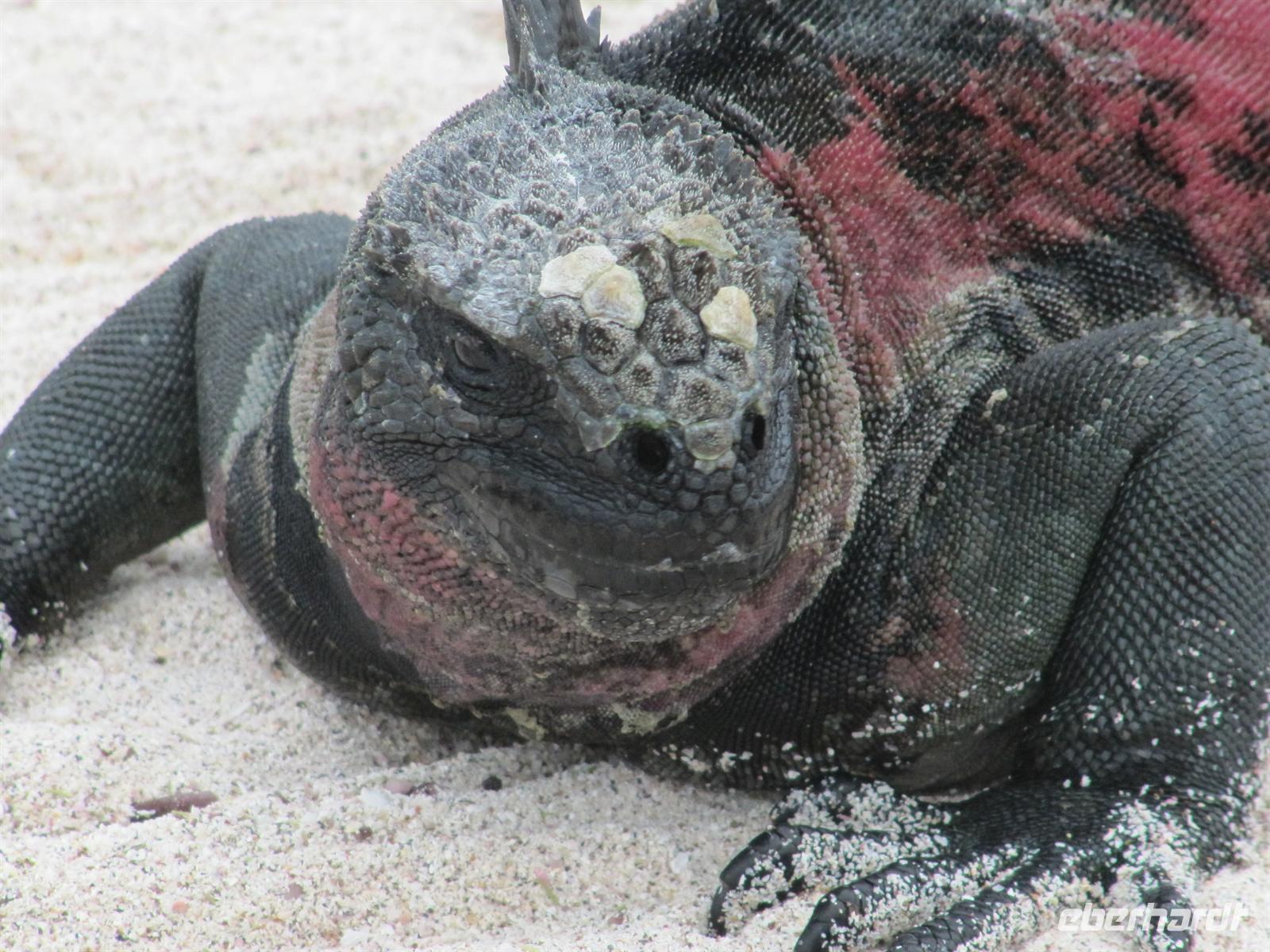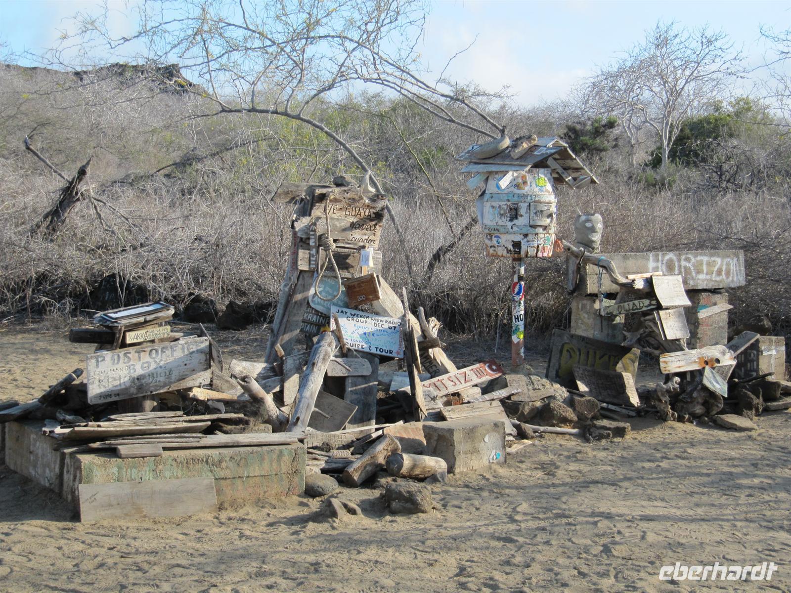 Am nächsten Morgen wanderten wir zur Tortuga Bay. Sie ist Heimat der Meeresechsen. Wir sahen eine große Gruppe der imposanten Tiere. Sie scheinen aus einer längst vergangen Zeit zu stammen. Am Mittag holte uns Lars, unser Naturführer für die nächsten drei Tage, ab. Bevor wir einen Ausflug ins Hochland von Santa Cruz unternahmen, bezogen wir unsere Kabinen auf der Yacht „Galaxy“, mit der wir zu den Inseln Floreana, Espanola und San Cristobal gelangten. Zunächst besuchten wir die Riesenschildkröten im Hochland der Insel. Es war sehr faszinierend, diese riesigen Tiere in freier Wildbahn zu beobachten. Auf der Yacht wurden wir mit einem schmackhaften Abendessen erwartet. Und in der Nacht legte diese dann Richtung Floreana ab. Wir landeten mit dem Schlauchboot am grünen Strand Punta Comorant. In der Brackwasser-Lagune hinter dem Strand leben Flamingos. Dann wanderten wir zum weißen Strand und beobachteten grüne Meeresschildkröten und Diamant-Stachelrochen. Am grünen Strand, der auf Grund kleinster Mineralsedimente grün schimmert, badeten wir. Einige Seelöwen lagen am Strand und ein halbstarker Jungbulle stänkerte mit uns. Aber auf Galápagos haben die Tiere alle Rechte und wir Menschen müssen strenge Regeln einhalten. Und das ist gut so! Denn die Tiere haben keine Angst vor dem Menschen. Am Nachmittag besuchten wir die berühmte Post Office Bay. Schon die Piraten haben hier ein Fass als Postfach installiert und bis heute wird es genutzt.