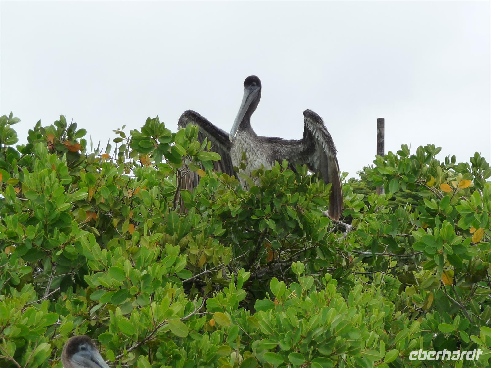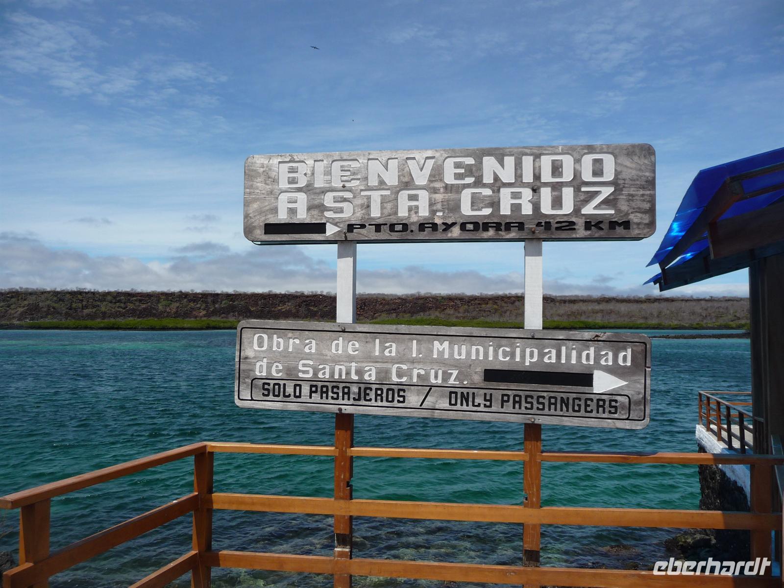 Nach 5 Minuten Fährfahrt durch den Kanal erreichten wir die Insel Santa Cruz. Ein großer brauner Pelikan begrüßte uns herzlich auf der Insel. Jetzt waren es nur noch 42 km Busfahrt quer über die Insel zu unserem Basishotel im Süden.