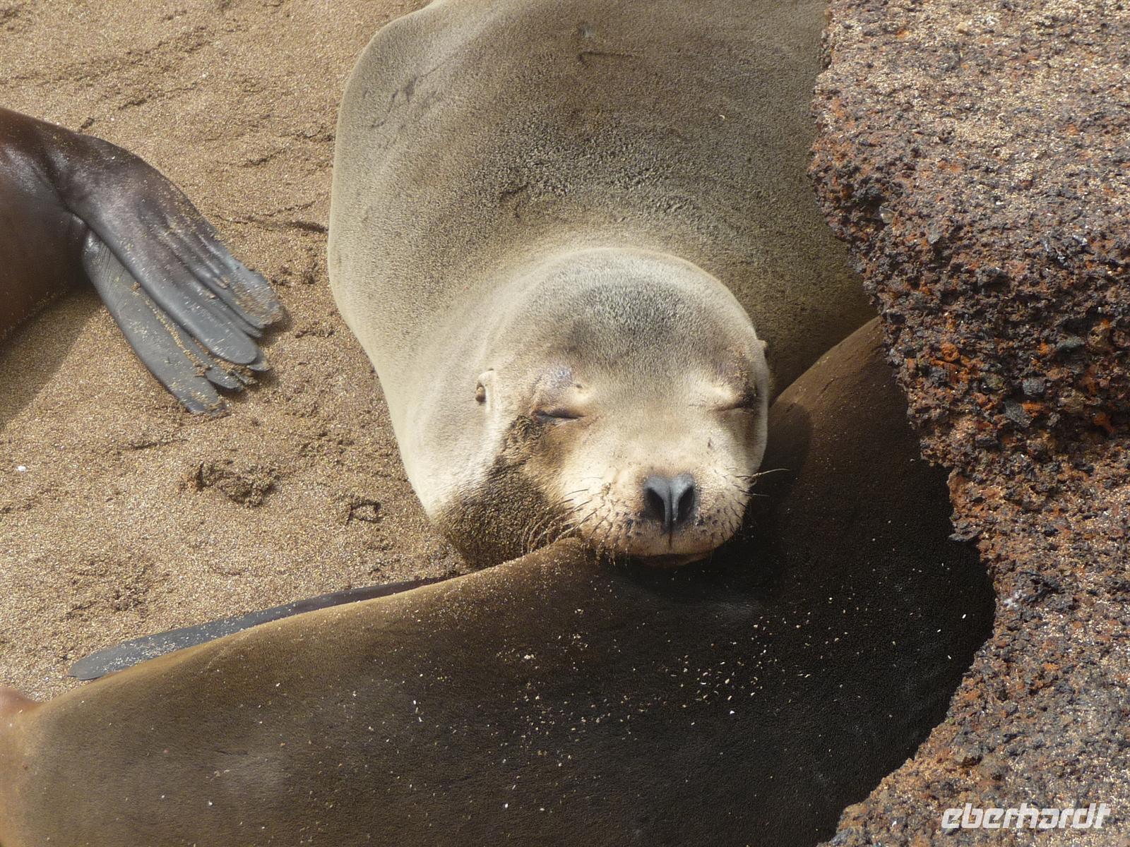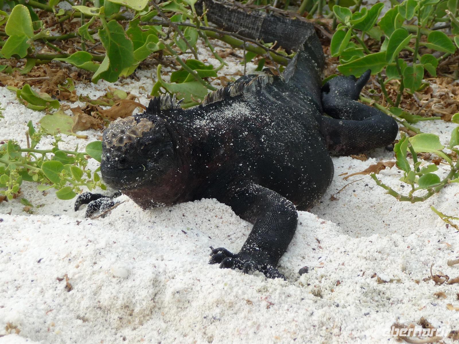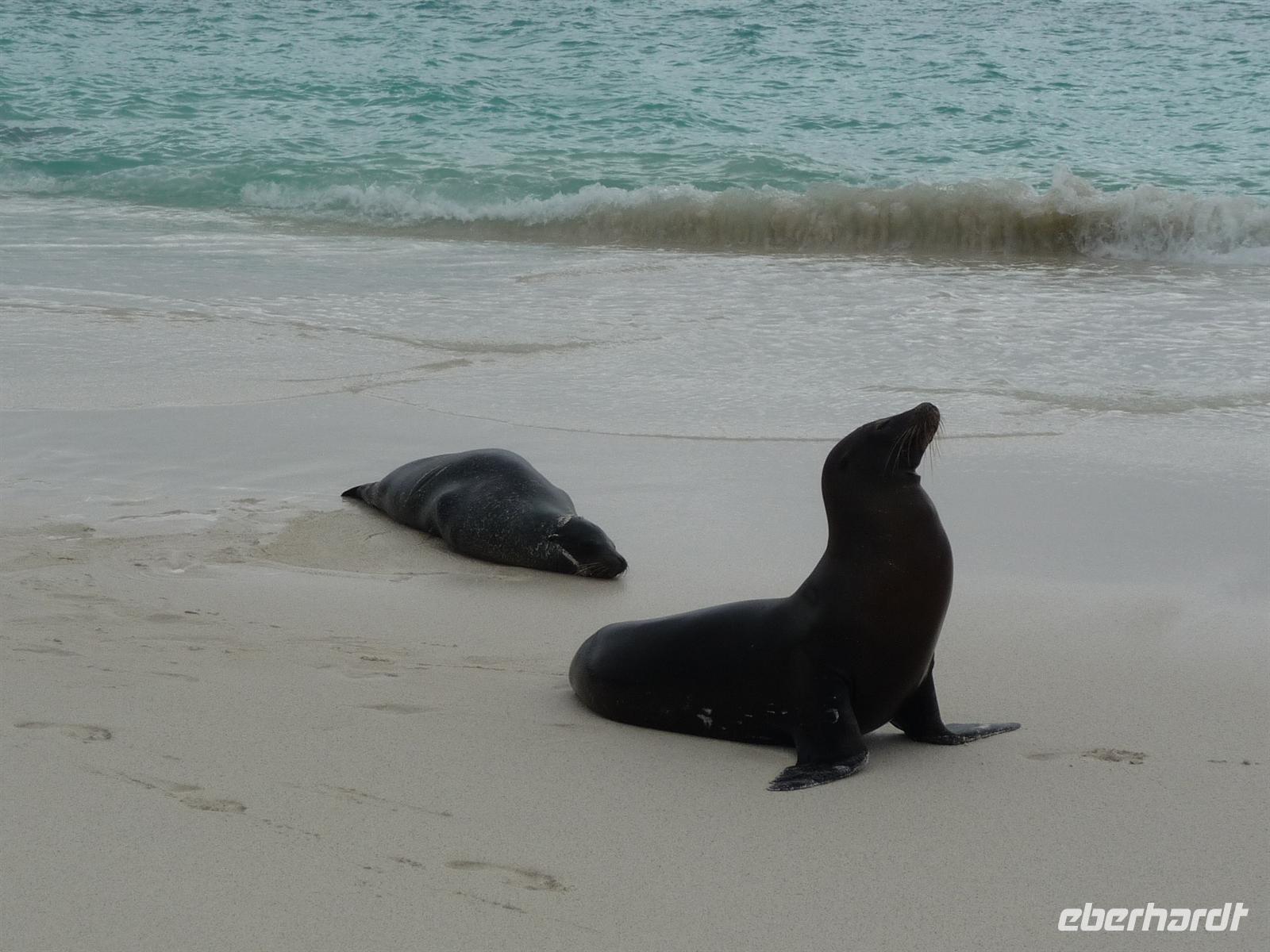 Nach einer Nasslandung um 9.00 Uhr besuchten wir die im Osten gelegene Bahia Gardner. Den herrlichen weißen Badestrand bevölkerten unzählige Seelöwen. Wohin das Auge nur blickt, überall aalten sie sich in der Sonne. Den wunderschönen Strand mussten sich die Seelöwen auch mit den Meerechsen/ Lavaechsen teilen. Es gibt sieben verschiedene Unterarten der Echsen, die sich durch die unterschiedlichen Färbungen unterscheiden. Die endemischen Spottdrosseln und die gelben Darwin-Finken sind nicht zu übersehen.