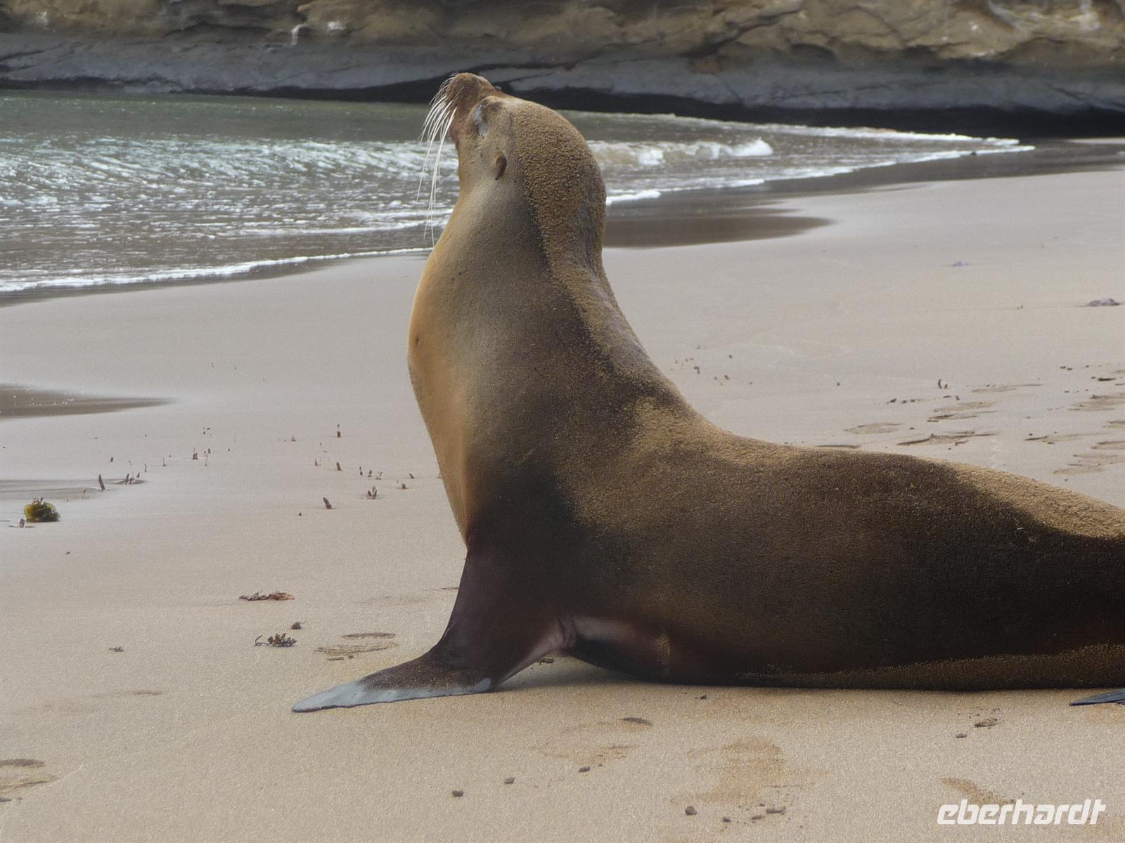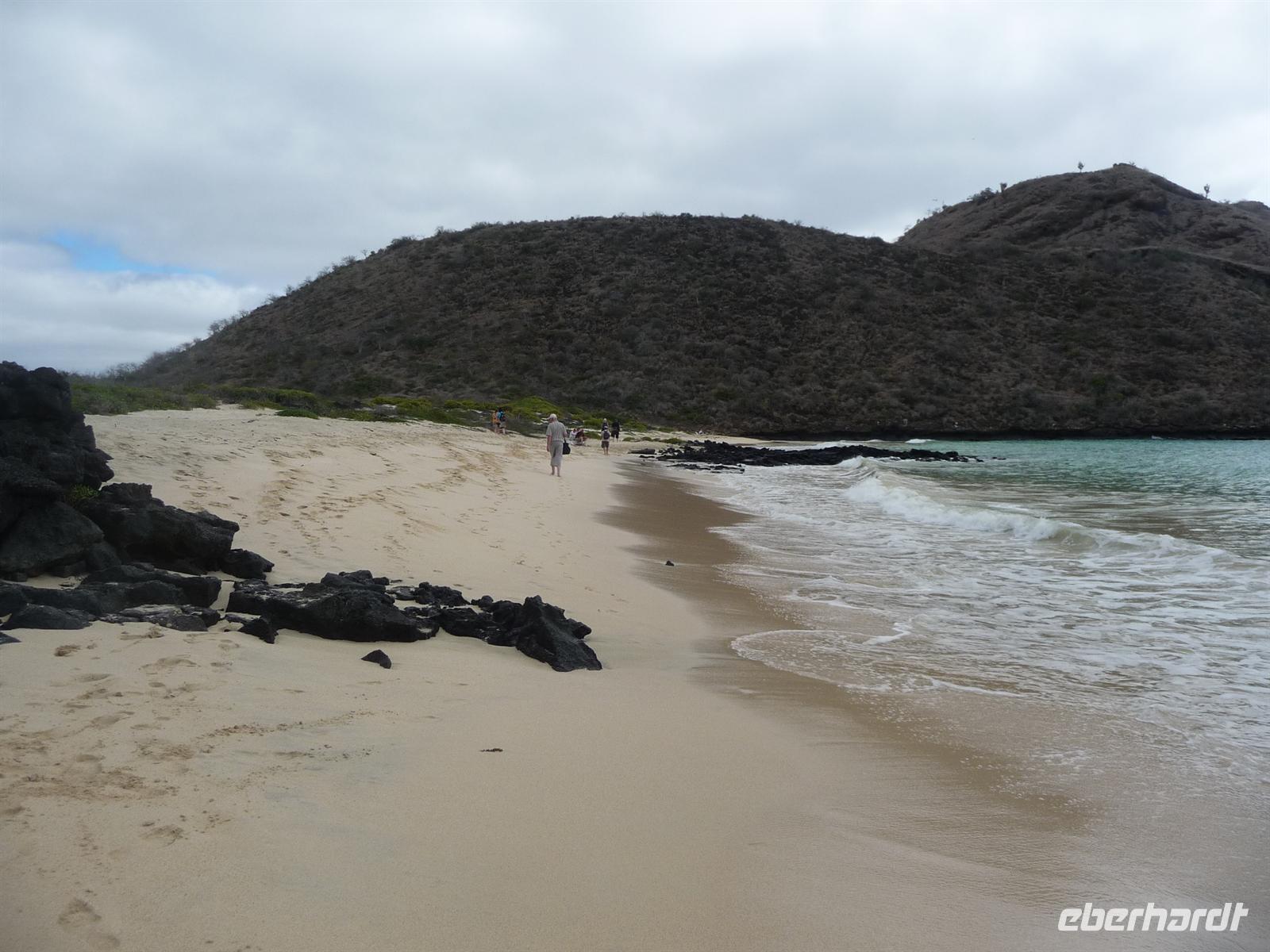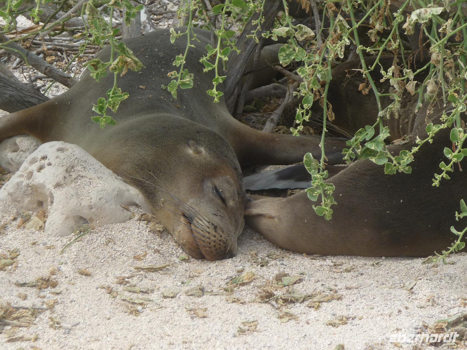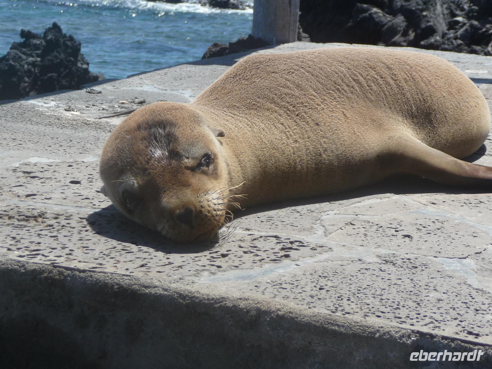 Nach einer Nasslandung um 9.00 Uhr besuchten wir die im Osten gelegene Bahia Gardner. Den herrlichen weißen Badestrand bevölkerten unzählige Seelöwen. Wohin das Auge nur blickt, überall aalten sie sich in der Sonne. Den wunderschönen Strand mussten sich die Seelöwen auch mit den Meerechsen/ Lavaechsen teilen. Es gibt sieben verschiedene Unterarten der Echsen, die sich durch die unterschiedlichen Färbungen unterscheiden. Die endemischen Spottdrosseln und die gelben Darwin-Finken sind nicht zu übersehen.