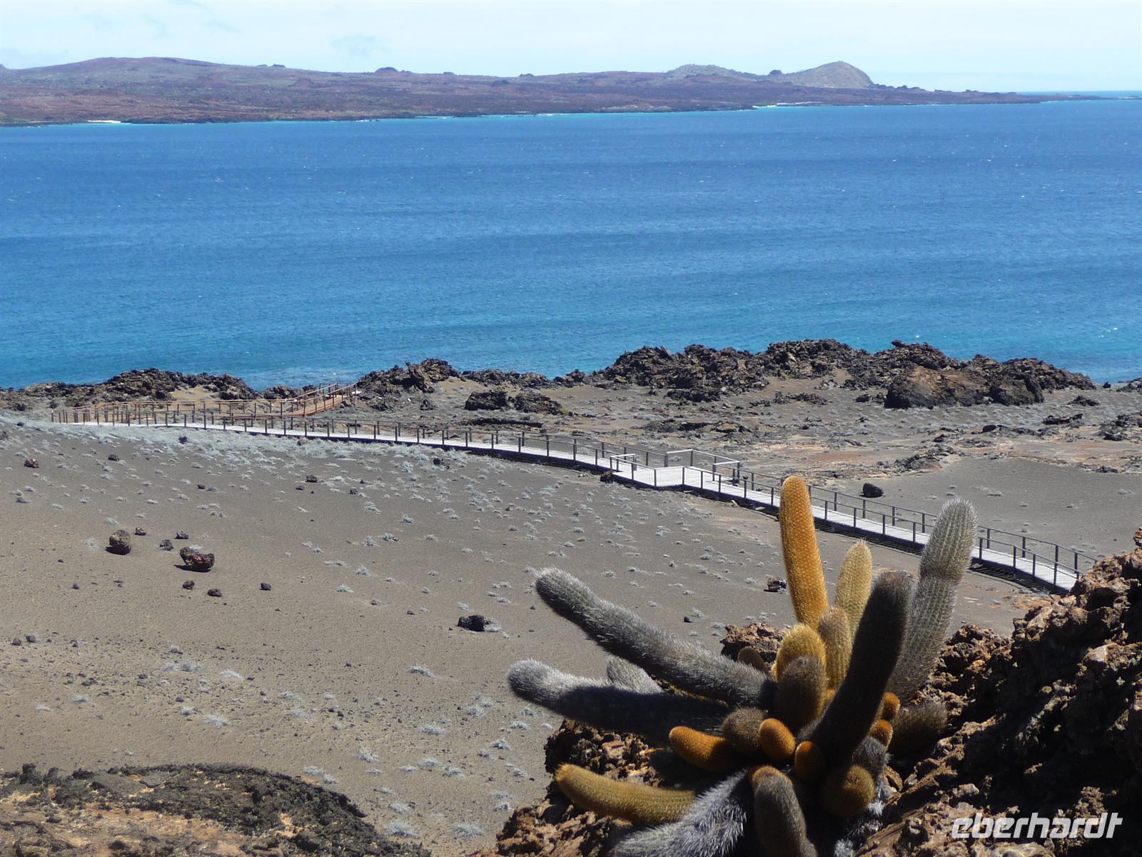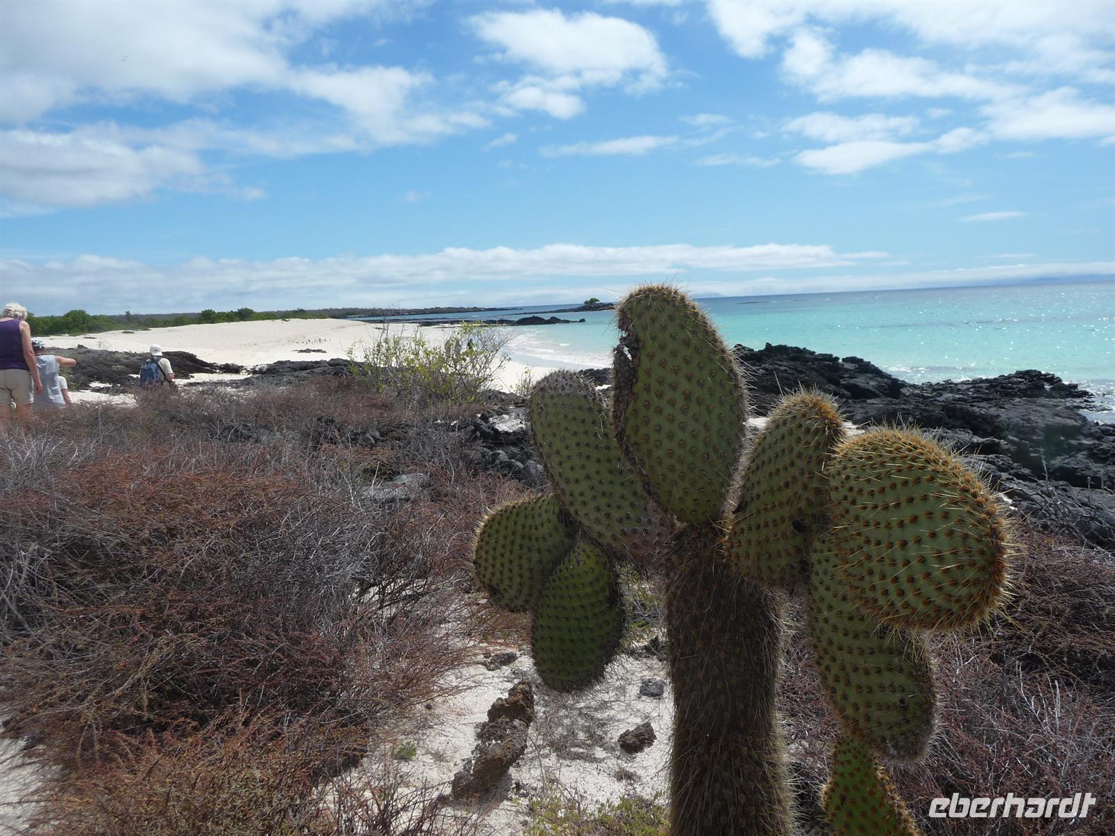 8.00 Uhr startete unser sehr schöner Spaziergang 5 km zur Tortuga Bay. Wir passierten unterwegs Bella Vista, die Aussichtsplattform. Riesengroße Opuntien und die verschiedenen Galapagos Finken waren allgegenwärtig. Die Attraktion ist der mangrovengesäumte Strand, der hier so weiß ist, wie der einer echten Koralleninsel. Wie im Bilderbuch schlagen die hohen Wellen an den Strand und die Weite ist unendlich schön.