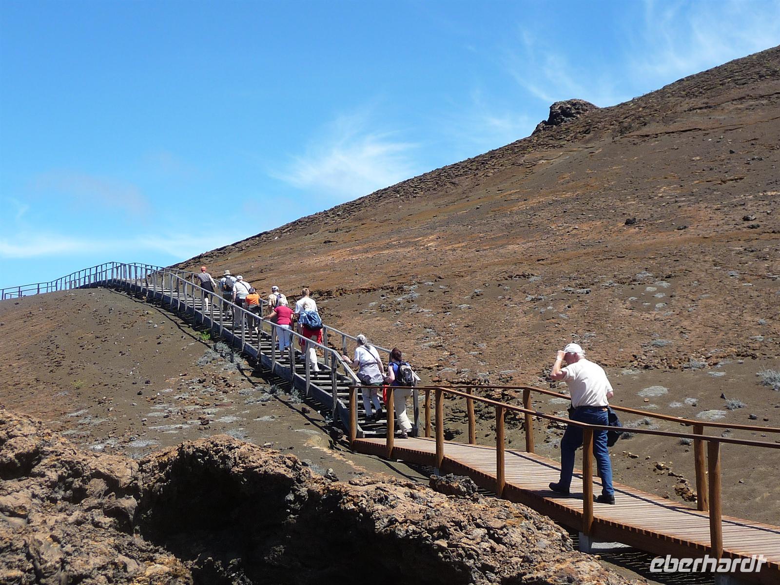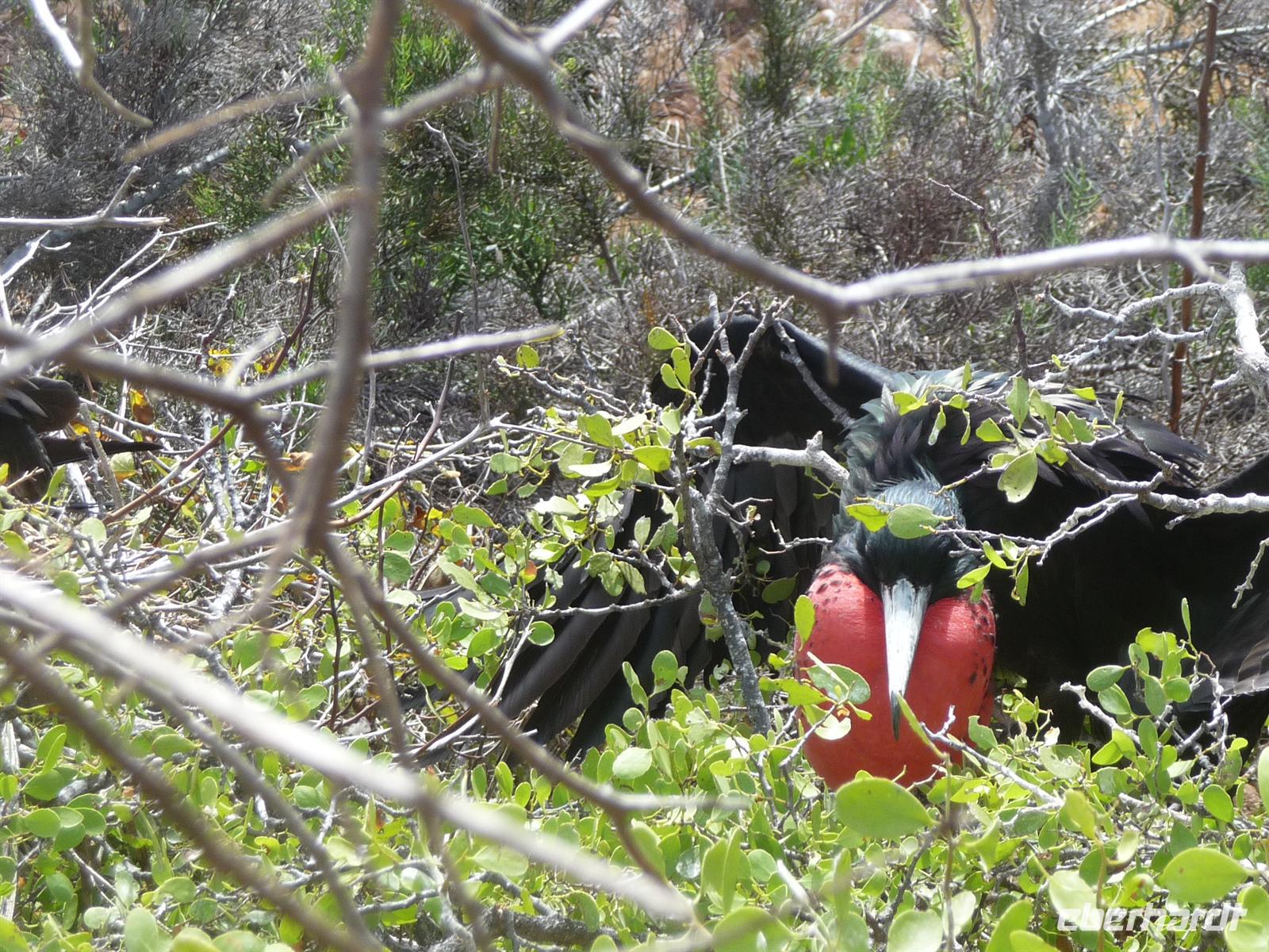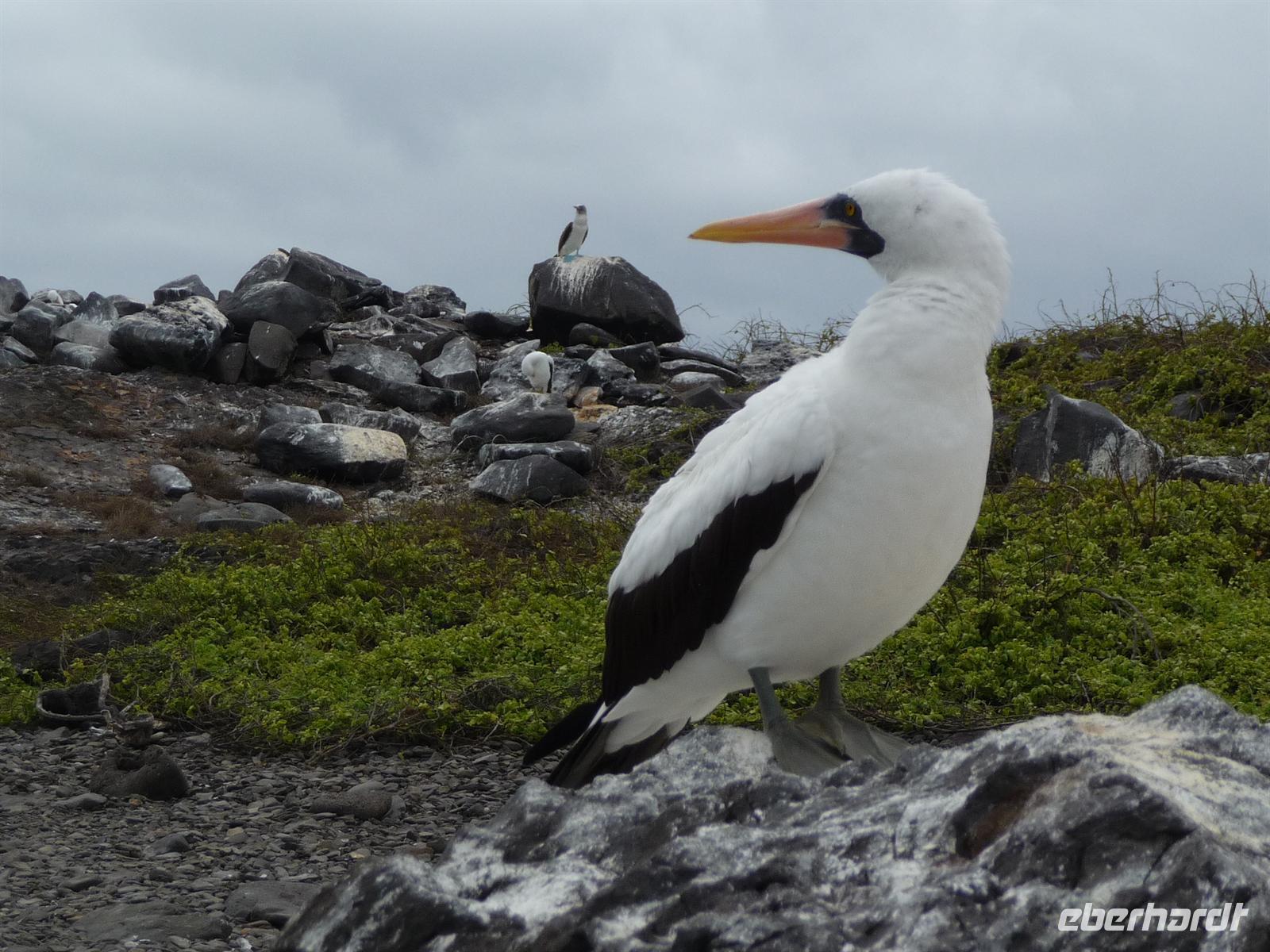 Zuerst meisterten wir eine Trockenlandung auf schlüpfriger Lava, dann konnte unser 1,4 km langer Rundwanderweg beginnen. Wir mussten teilweise über die Nester steigen, da die Tölpel ihr Nest direkt auf dem Weg errichteten. Einige Blaufußtölpel kümmerten sich schon um ihren Nachwuchs. Auch ein männlicher Prachtfregattvogel zeigte uns stolz seinen knallroten Kehlkopf.