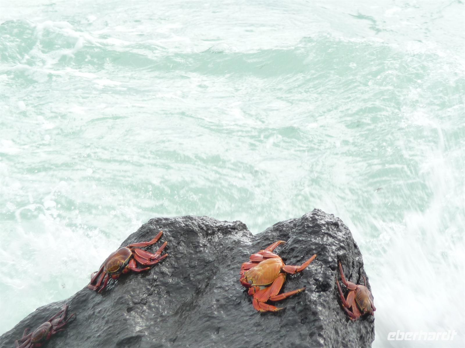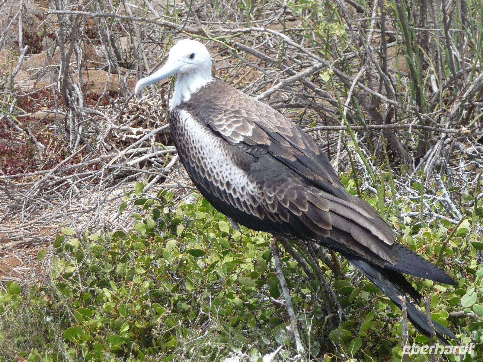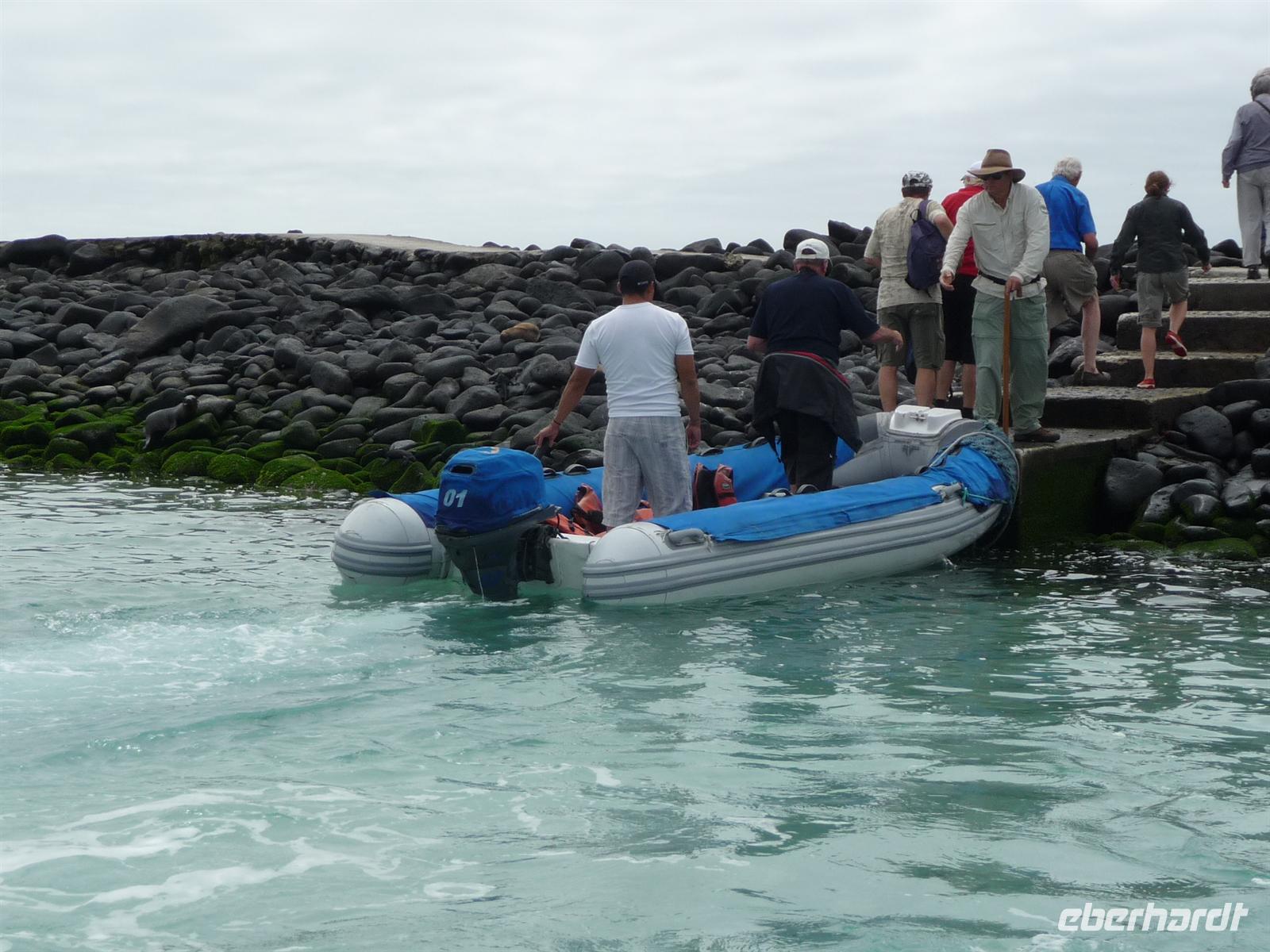 Zuerst meisterten wir eine Trockenlandung auf schlüpfriger Lava, dann konnte unser 1,4 km langer Rundwanderweg beginnen. Wir mussten teilweise über die Nester steigen, da die Tölpel ihr Nest direkt auf dem Weg errichteten. Einige Blaufußtölpel kümmerten sich schon um ihren Nachwuchs. Auch ein männlicher Prachtfregattvogel zeigte uns stolz seinen knallroten Kehlkopf.