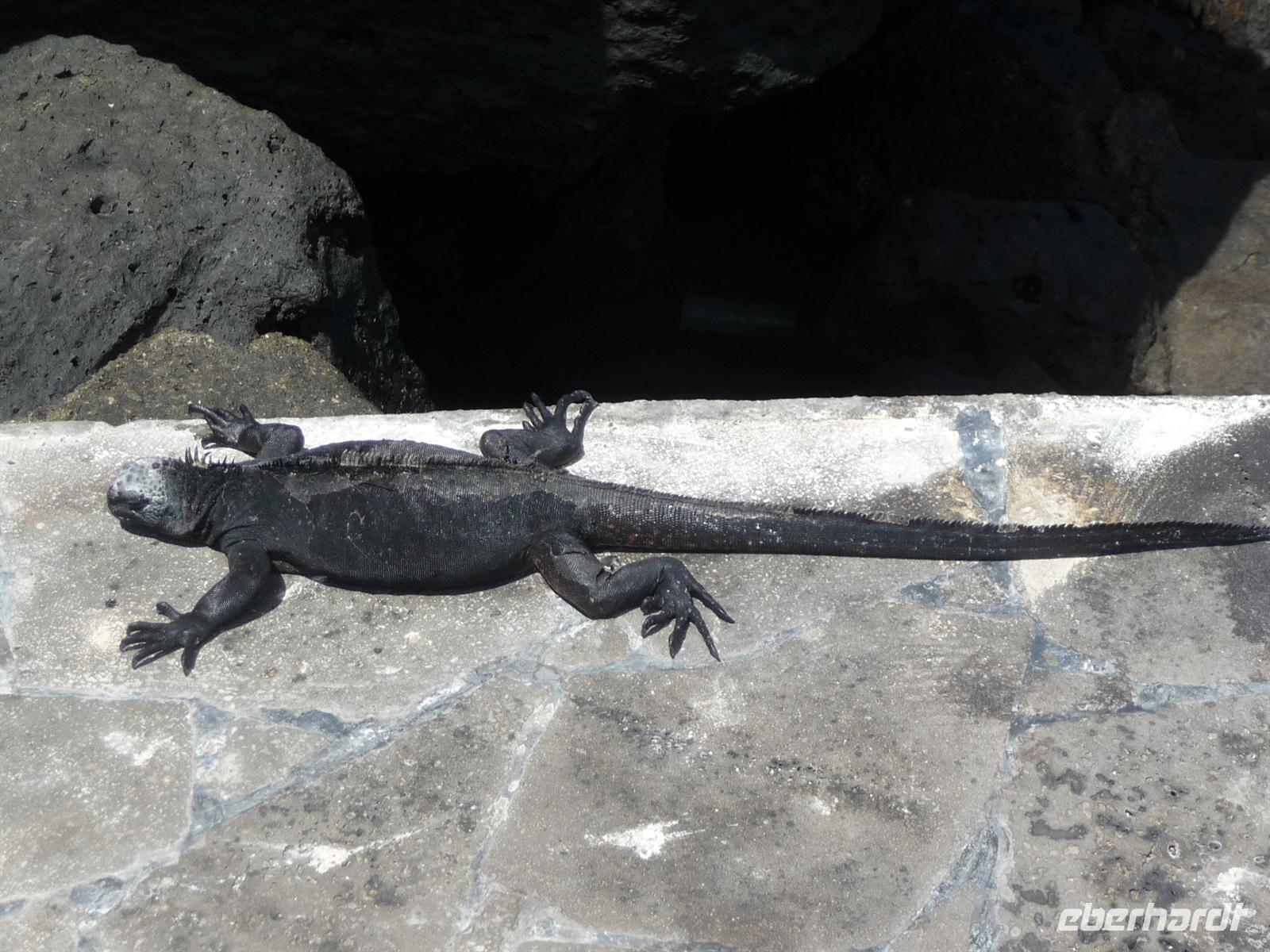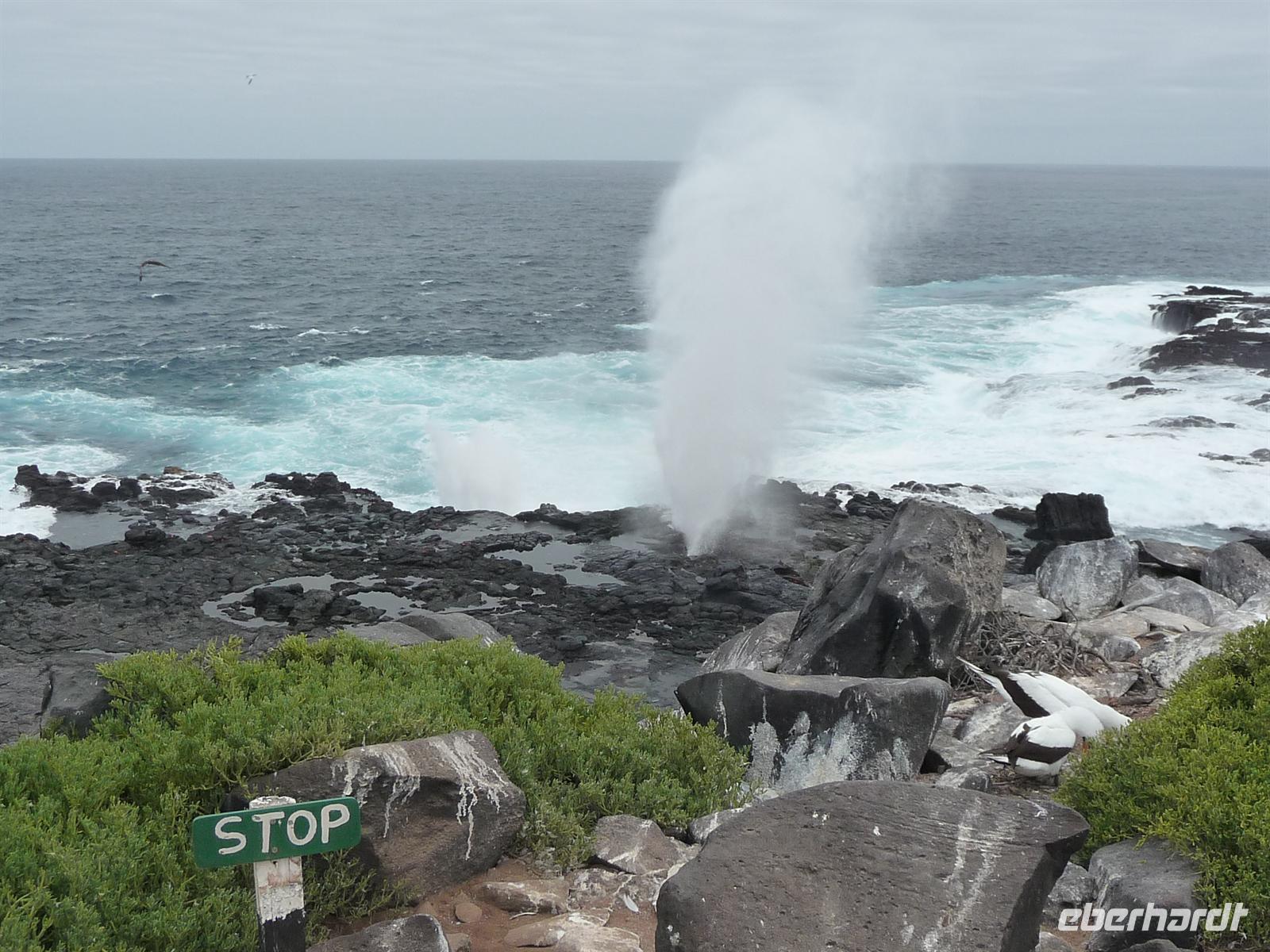 Das sogenannte -Blasloch- eine eingebrochene Basaltdecke mit Verbindung zum Meer, produziert eine 20 m hohe Wasserfontäne, in deren Umkreis sich unzählige Lavaechsen aufhalten