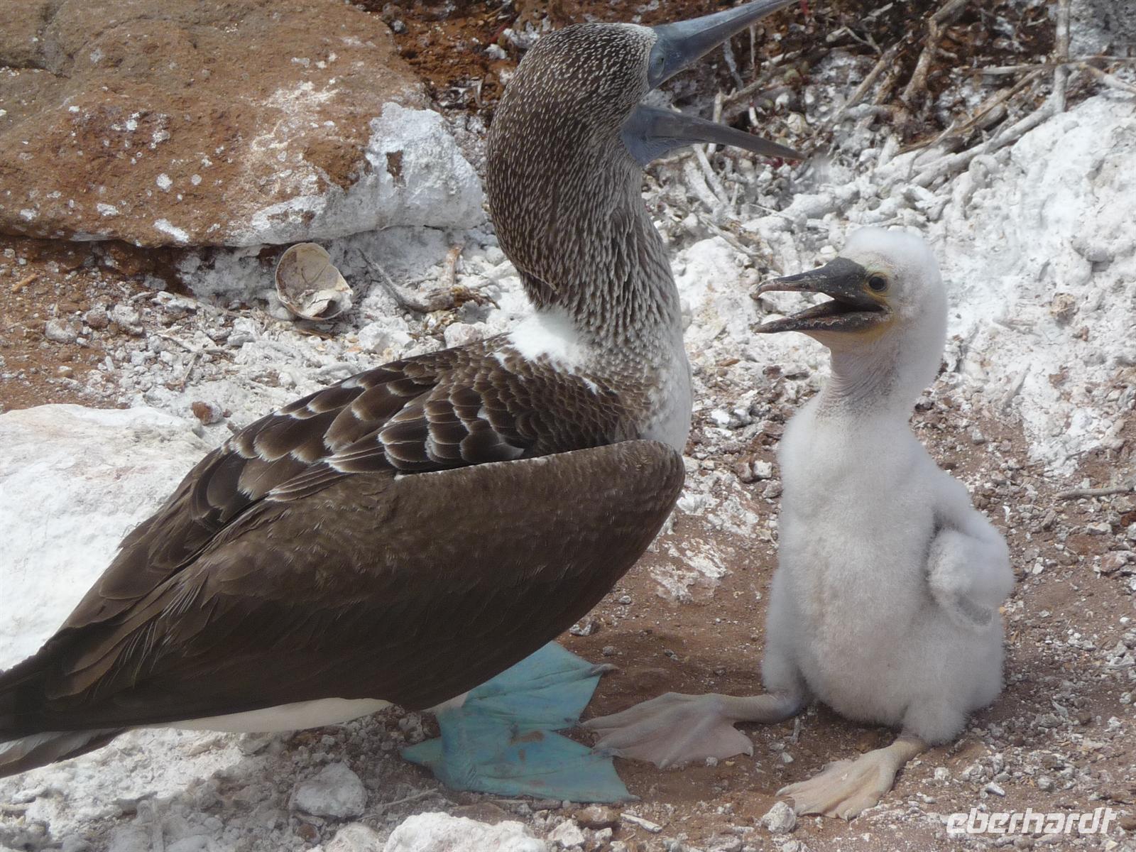 Auch bei den Blaufußtölpeln kümmerten sich die Eltern um ihren Nachwuchs. Hier zeigte sich bewusst, dass die Tiere keine Scheu vor dem Menschen haben. Die Nester sind auch auf dem Rundwanderweg errichtet und Vorsicht und Achtung vor der Tierwelt wird von jedem Besucher der Insel erwartet.