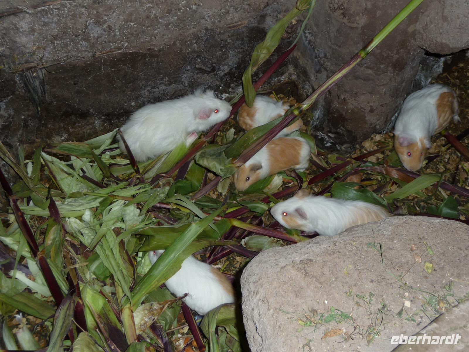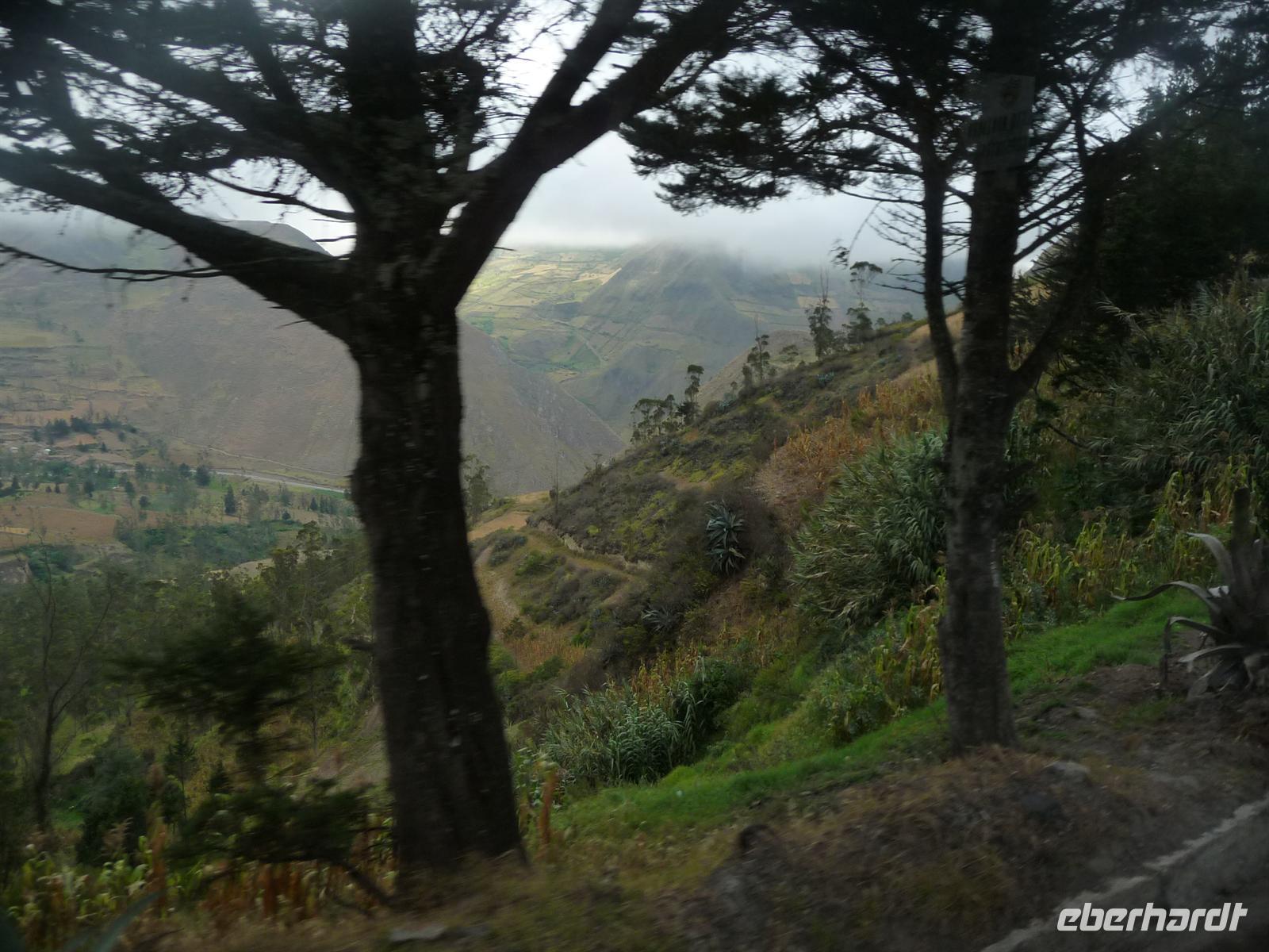Ein weiterer Höhepunkt stand im Programm, die Fahrt mit der Trans-Anden-Bahn. Durch ein Erdbeben wurden Teilstrecken zerstört, deshalb fuhren wir von Riobamba um 9.00 Uhr mit dem Schienenbus. Dadurch erhielten wir Einblicke in den Arbeitsalltag der Indios, die wir per Bus nicht gesehen hätten. Die Kühe, Schafe und Esel waren an langen Seilen angebunden, brauchten nicht auf eine eingezäumte Koppel. Die Indios arbeiteten auf den Feldern, die sich an die steilen Hänge schmiegten.