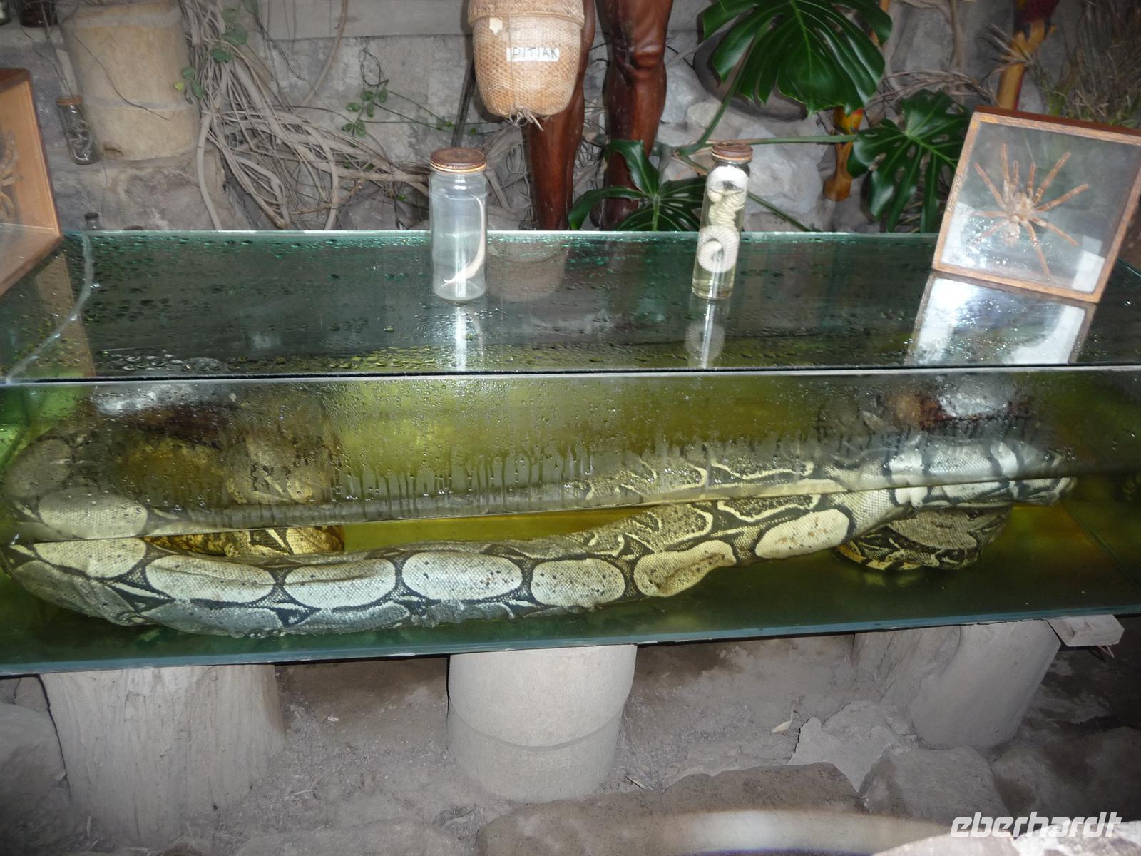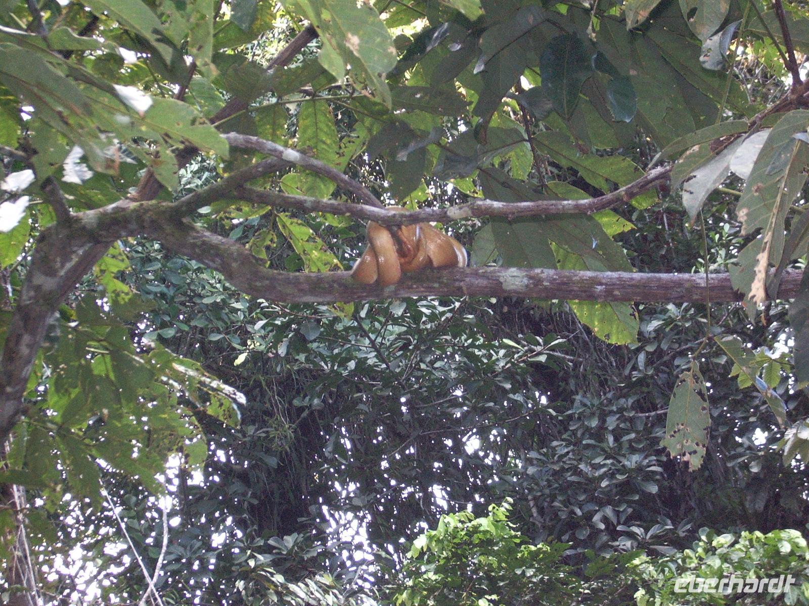 Auf der Rückfahrt haben wir eine Familie Totenkopf Affen, Fischreiher, Eisvogel und 2 Arras nahe unserem Kanu gesehen. Der Arras ist ein sehr lauter Vogel. Gelbkopfkaja und eine gelb-braune Baumschlange hat uns Diego gezeigt. Eine große, dicke Anaconda Würgeschlange lag auf einem Ast und hat sich gesonnt. Wir konnten sie deutlich erkennen. Ganz selten ist der Anblick der Anaconda in freier Natur.
