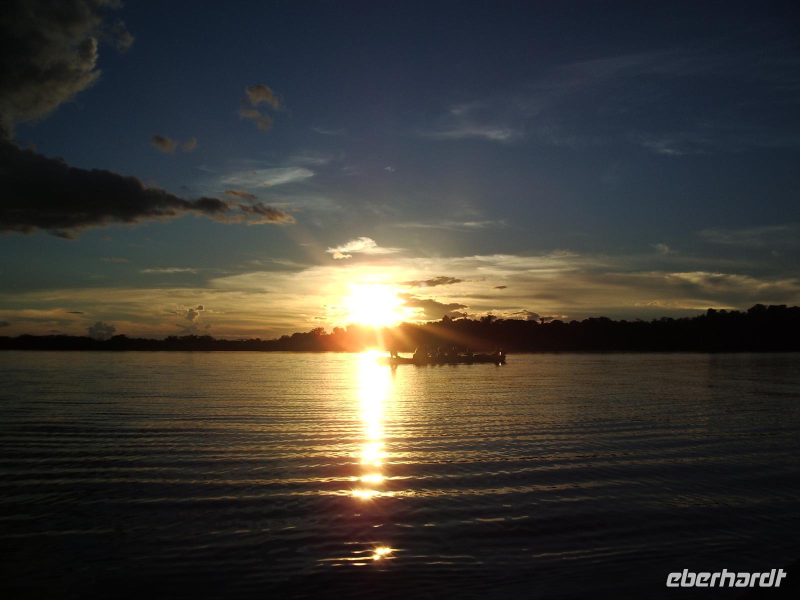 Fahrt zur großen Lagune und wir stoppten in einem dichten Mangroven Wald. Bromelien wachsen in den unterschiedlichsten Farben an Bäumen. Dort hielten wir das Kanu fest und angelten mit Hilfe von Fleisch - Ködern leidenschaftlich nach Piranhas. Diego angelte einen Piranha 11 cm und einen Barsch 18 cm. Ein Zigeunerhuhn auf einem Busch entdeckten wir, es ist der größte, bunteste Vogel im Regenwald. Unseren zweiten Sonnenuntergang erlebten wir mit herrlichem Farbenspiel der Natur und Gezwitscher der Vögel. Die Abenddämmerung an der Vogelinsel mitten in der Lagune hat jeder genossen. 5 Minuten Ruhe im Kanu, keiner hat gesprochen nur den Tönen der Natur lauschen...