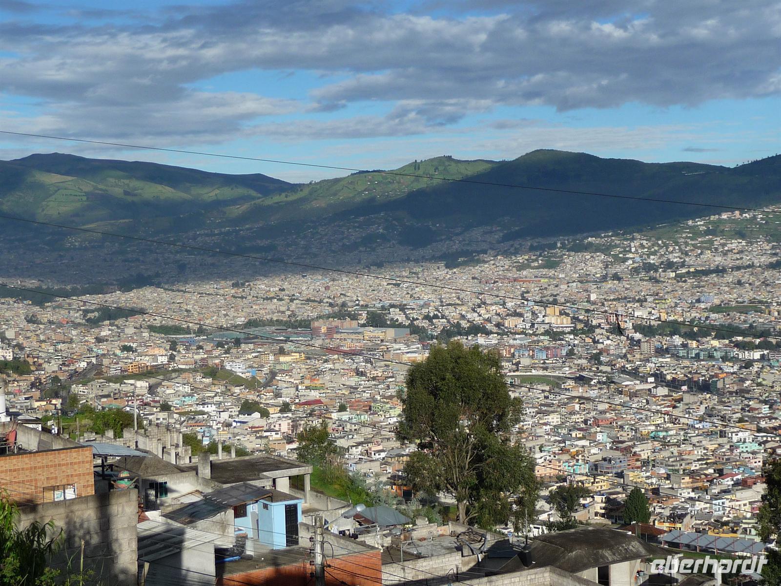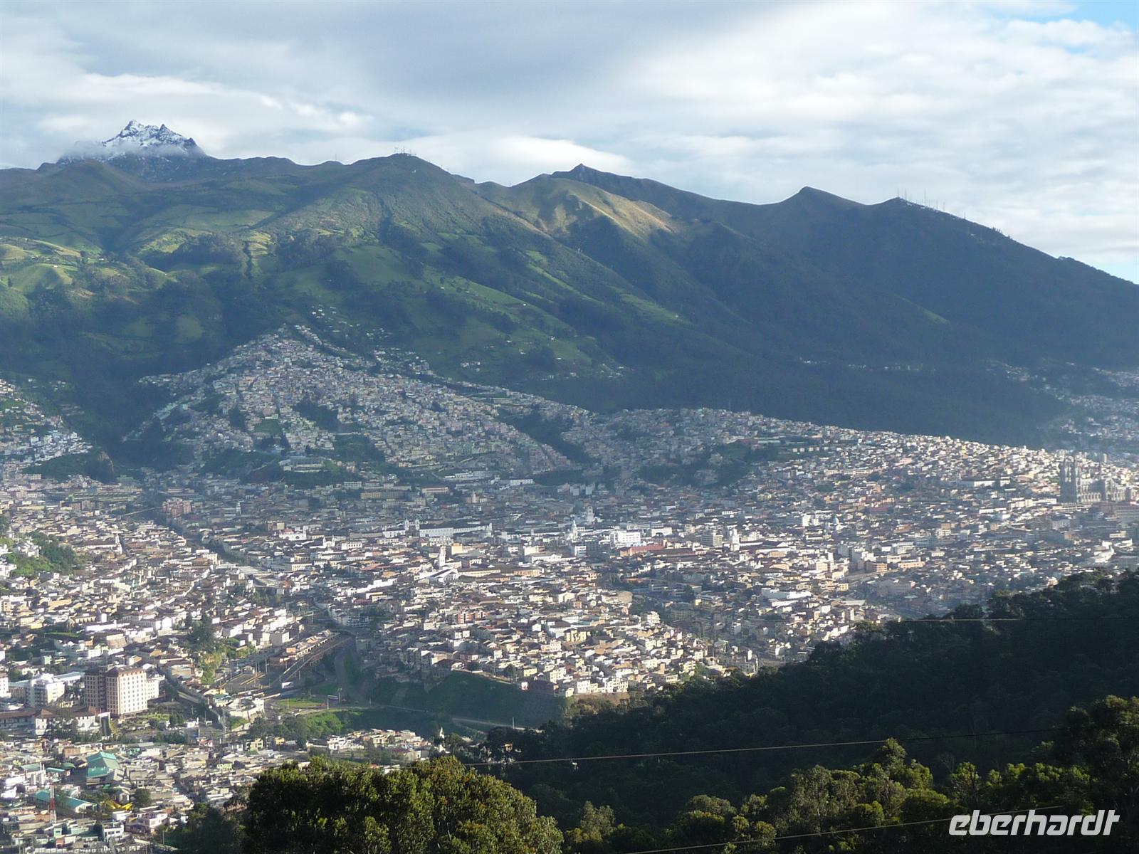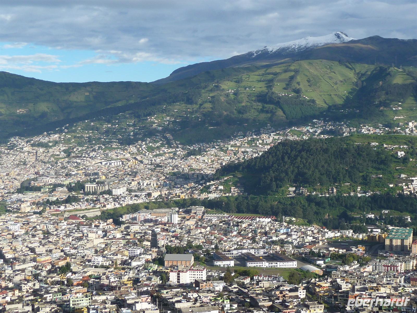 11.30 Uhr erreichten wir die Brücke mit dem Empfangshäuschen des Cuyabeno Nationalpark. Während der Busfahrt nach Lago Agrio hingen unsere Gedanken immer noch den Geräuschen des Regenwaldes und der unbeschreiblichen Schönheit der Flora und Fauna nach. Alleine die Grün-Schattierungen sind nicht zu zählen. 15.45 Uhr flogen wir mit VIP Aerogal (Dornier 328) nach Quito. Bei klarer Sicht sahen wir den Fluss Napo durch das schier undurchdringliche Grün des Regenwaldes schlängeln. Der Pilot musste noch den schneebedeckte Gipfel des Cayambe 5.790 m umrunden, bevor er pünktlich 17.20 Uhr in Quito landet. Die Sicht auf Quito war wieder atemberaubend. Richard holte uns ab und wir fuhren wieder in unser Grand Hotel Mercure Alameda.