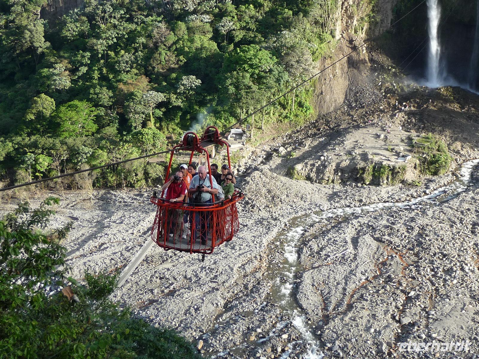 Wir sahen 2 Wasserfälle bevor es mit der Seilbahn es über den Fluss Rio Pastaza ging. Wir trauten uns, in schwindelerregender Höhe über das Flussbett zu schweben. Banos ist bekannt für seine beeindruckenden Kolonialbauten, dass angenehme Klima in 1.800 m Höhe, die warmen Thermalquellen und die außergewöhnlich schöne Landschaft. Süßigkeiten stehen in Banos hoch im Kurs. Noch immer wird in langen elastischen Striemen das Karamell über einen Ast geschlagen, damit es die nötige Konsistenz zum Verzehr gewinnt. Mit einem kleinen Bummel durch die hübsche Altstadt von Banos endete unser Tag.