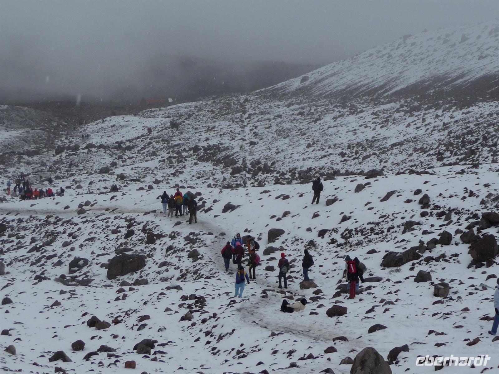 Fast eine Stunde brauchten wir für 200 Höhenmeter und es war sehr anstrengend. Das Herz raste wie verrückt, nur kleine Schritte mit vielen Pausen gehen, um den Körper an die Höhe zu gewöhnen. Jeder Schritt wurde wohl überlegt, denn es strengte alles wahnsinnig an. Die 2. Schutzhütte sahen wir schon, aber es war noch so weit hoch. Dann setzte Hagel ein und die Berge rings herum verschwanden im Nebel. Wie beim Ski fahren, mal zeigen sich die Berge in voller Schönheit, dann wiederum in mysteriösen Nebelformationen. Zum Hagel gesellten sich noch Windböen, es war recht kalt. Der Weg bis auf 5.000 m war teilweise fest getreten, es lief sich relativ gut. Loses Geröll wie auf dem Großglockner war nicht vorhanden. Der Boden bestand vorwiegend aus eisenhaltiger, roter, fester Lava - Asche und leichten Tuffstein. Die Gletscherformationen setzten erst über 5.000 m ein.